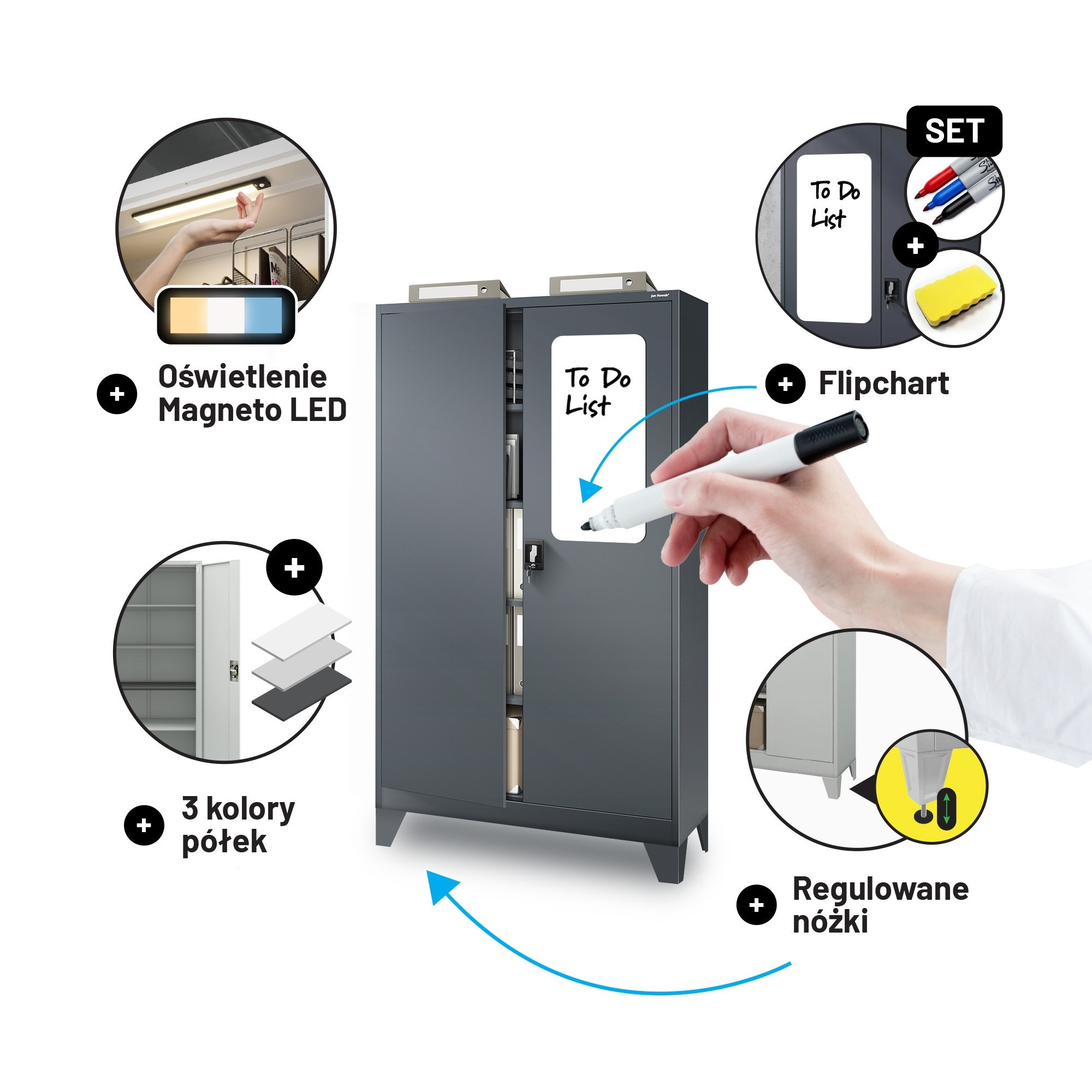 Hledáte spolehlivé a elegantní řešení pro uspořádání dokumentů, vybavení nebo léků? Představujeme vám skříň JAN II v moderní antracitové barvě. Tato uzamykatelná ocelová skříň je navržena tak, aby splňovala nejvyšší nároky na bezpečnost, funkčnost a estetiku. Ať už ji potřebujete do kanceláře, ordinace, dílny nebo domova, skříň JAN II se stane nepostradatelným pomocníkem.