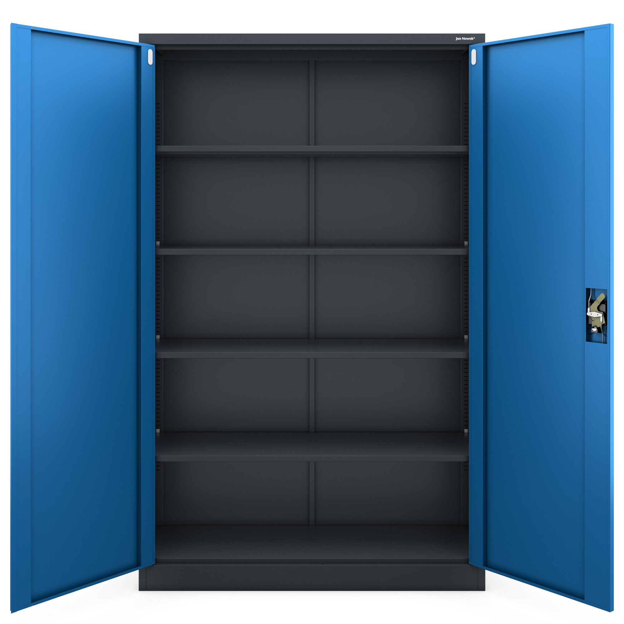 Díky nastavitelným policím si můžete vnitřní prostor skříně JAN II přizpůsobit přesně podle svých potřeb. Ať už potřebujete uskladnit velké předměty, šanony, nářadí nebo cokoliv jiného, vždy najdete optimální konfiguraci.
