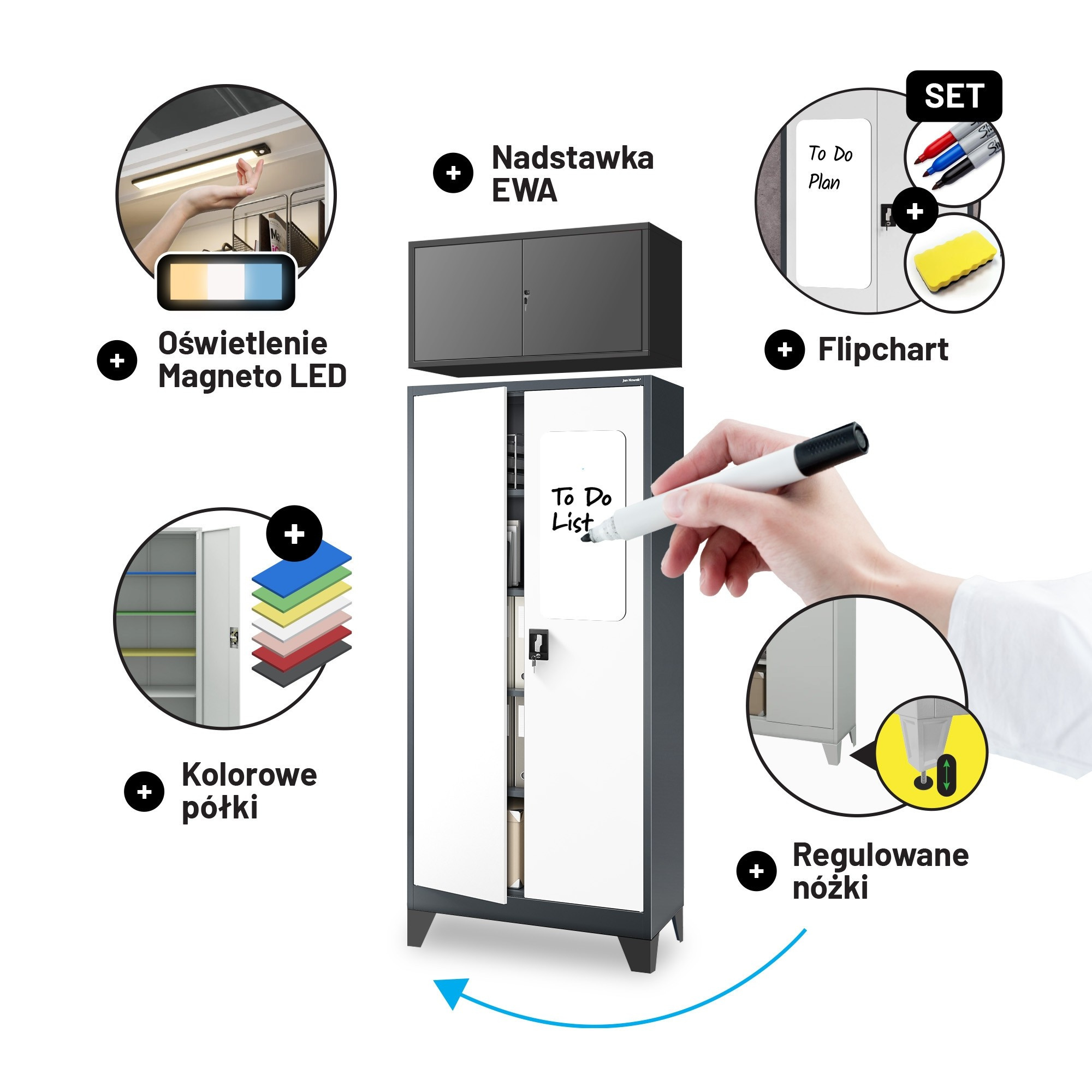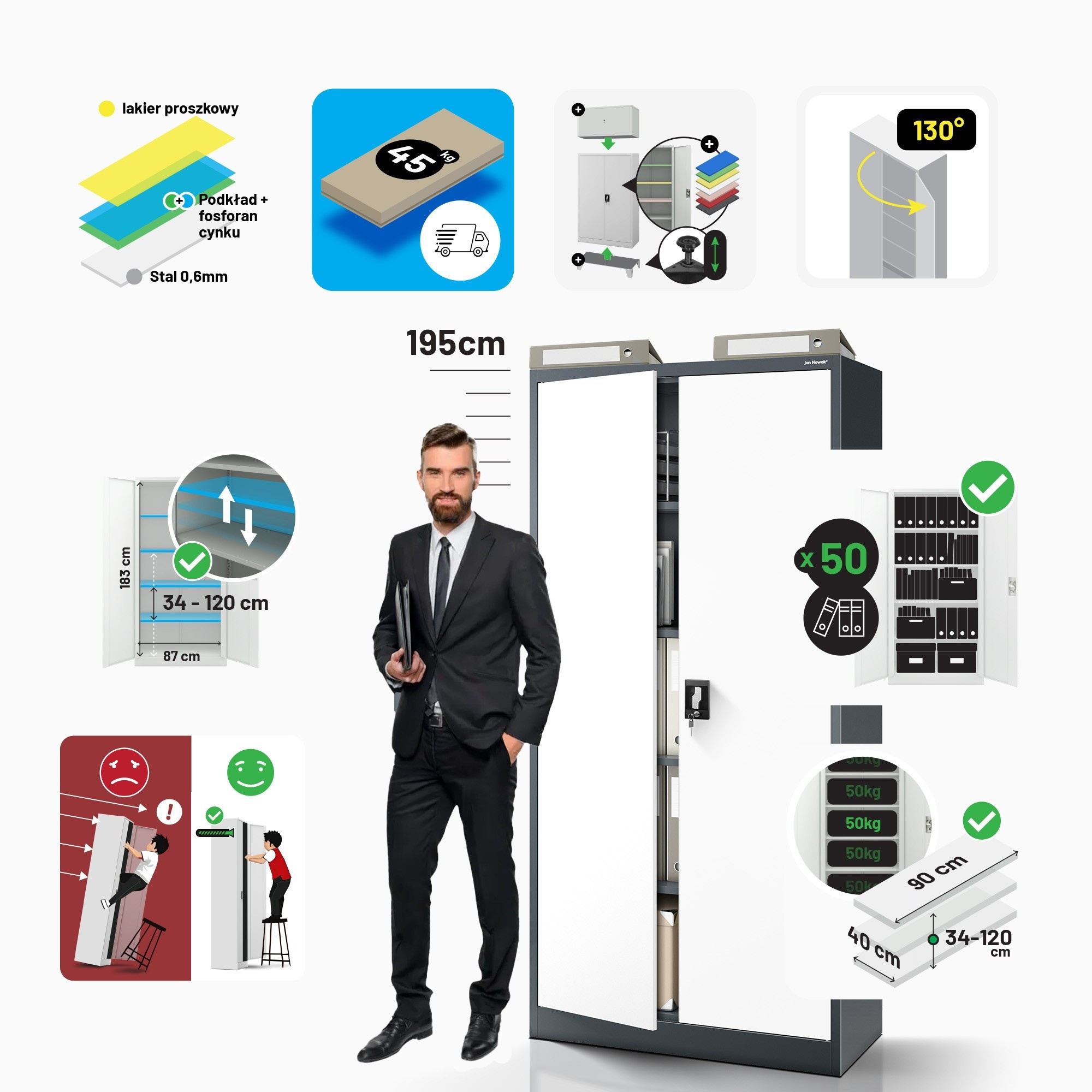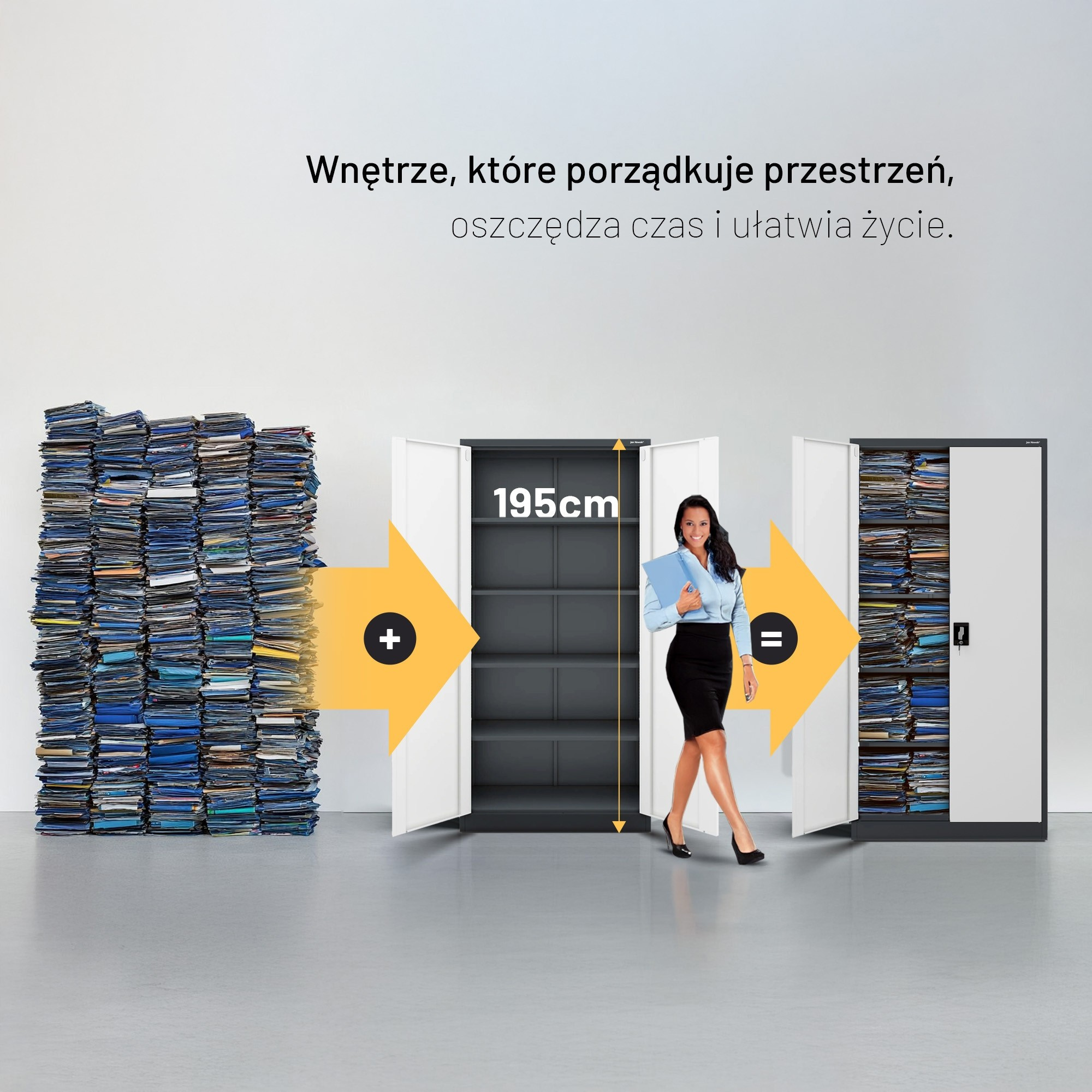 Hledáte spolehlivé a stylové úložné řešení? Představujeme vám skříň JAN H v moderním antracitovo-bílém provedení. Tato univerzální kovová skříň je ideální pro širokou škálu použití, od kanceláří a firem až po zdravotnická zařízení, dílny a dokonce i domácnosti. Její robustní konstrukce a promyšlený design z ní dělají neocenitelného pomocníka pro organizaci a bezpečné uložení vašich dokumentů, léků, nástrojů a dalších cenností.
