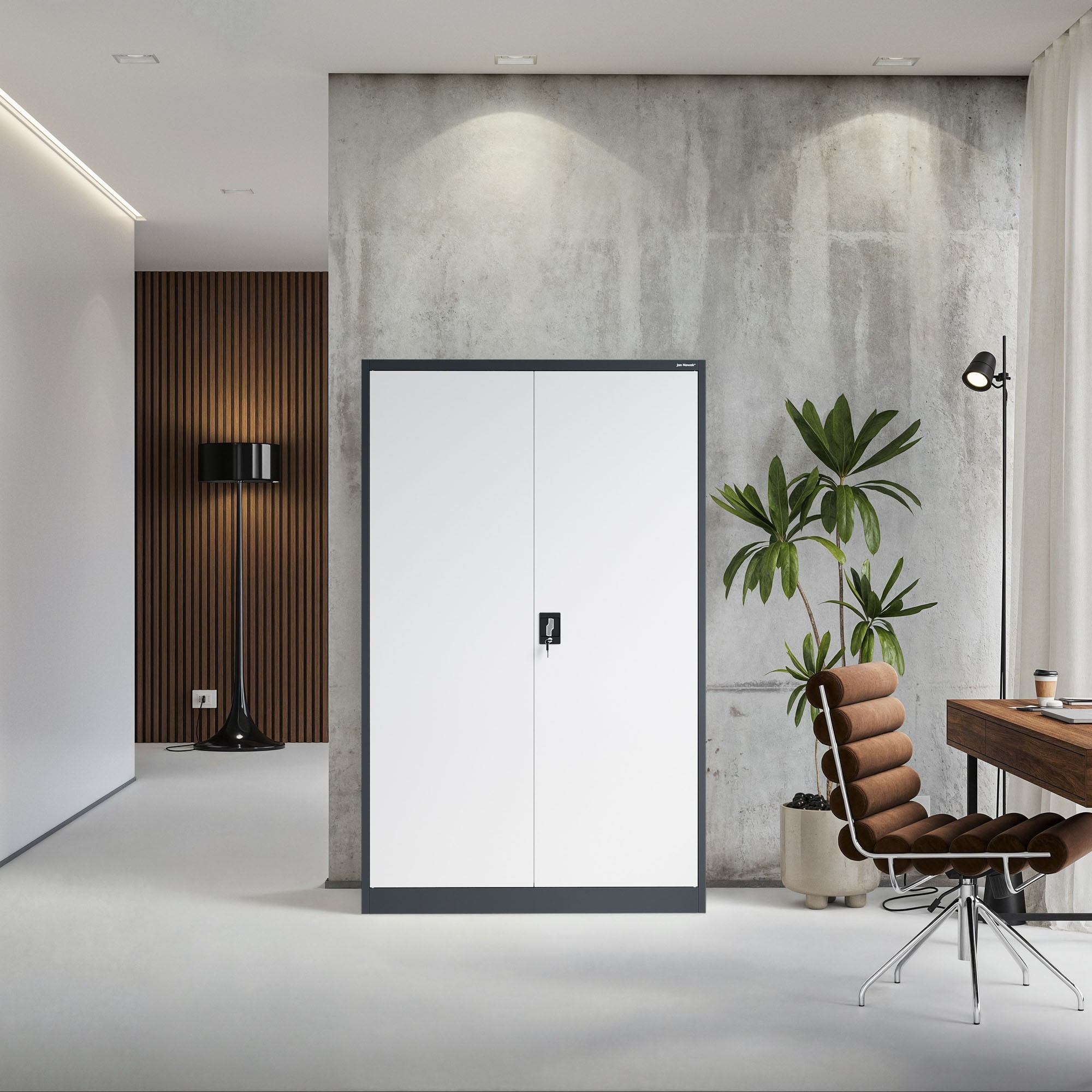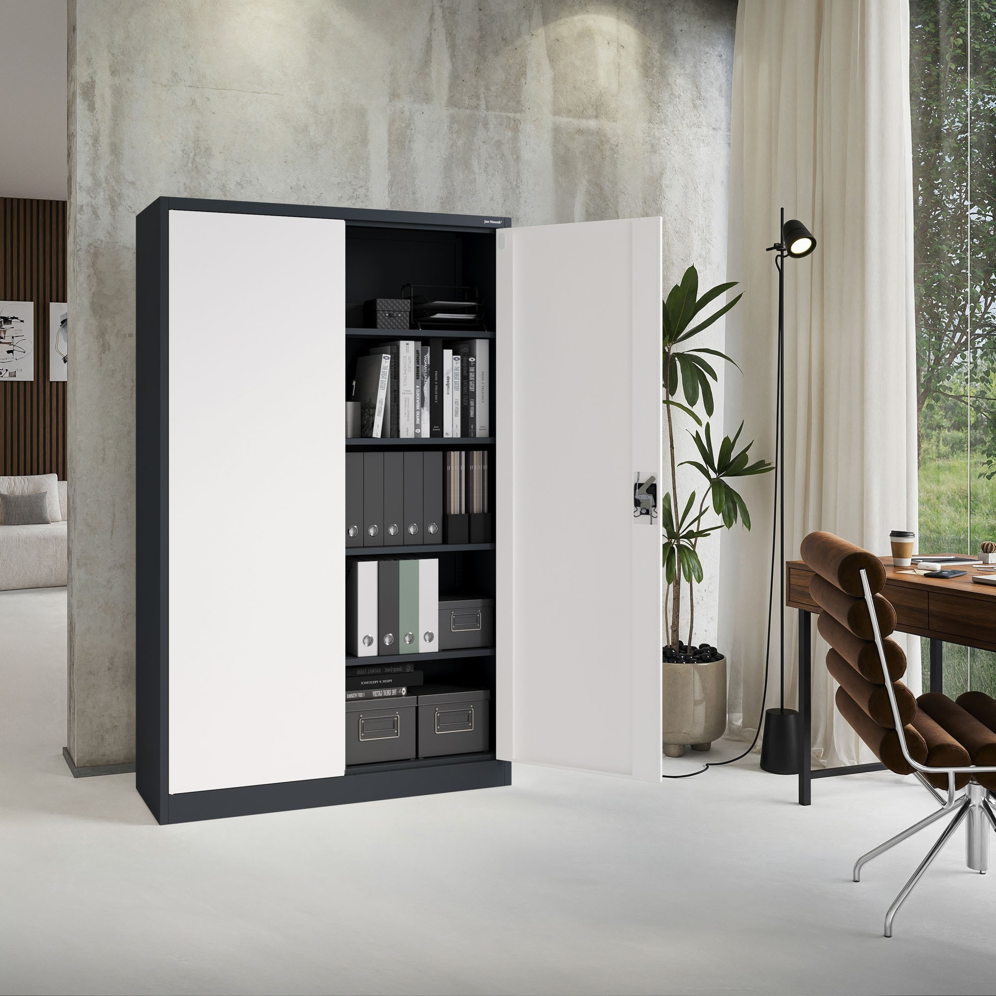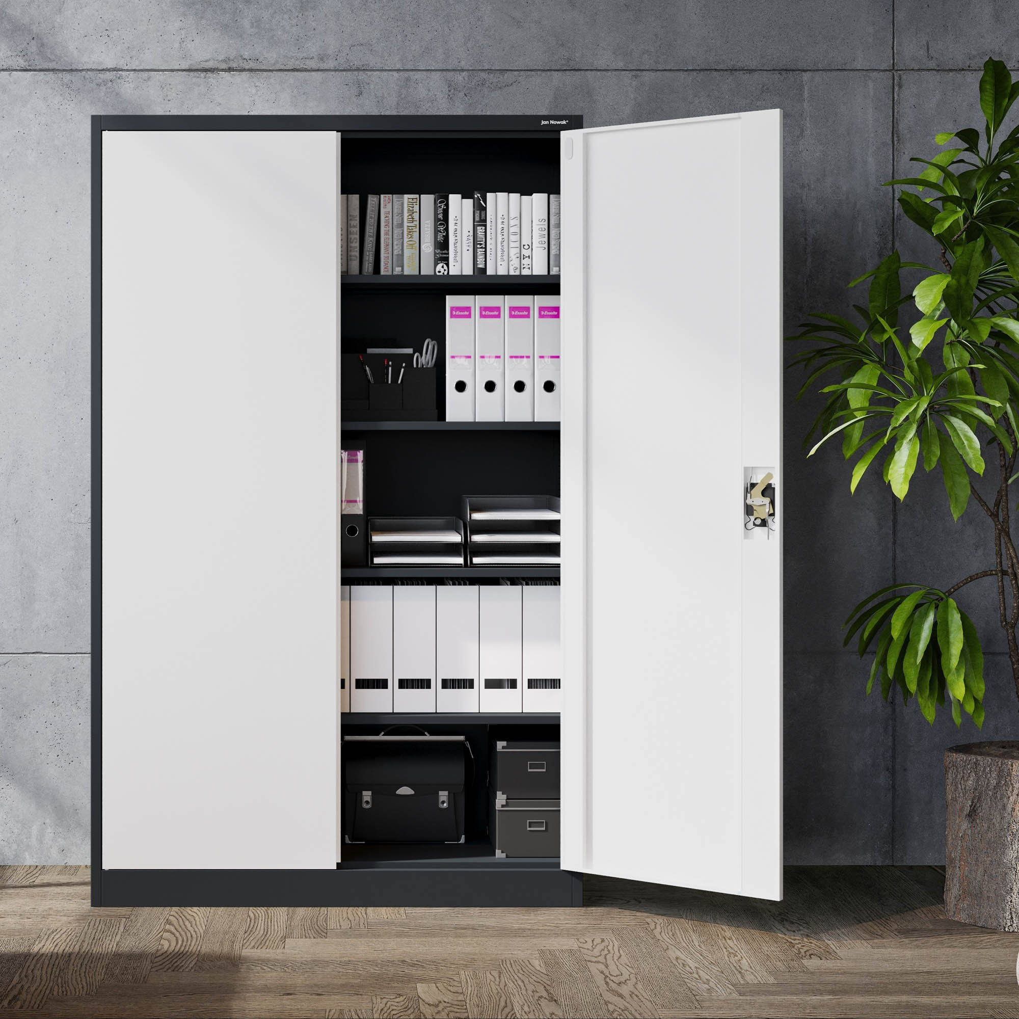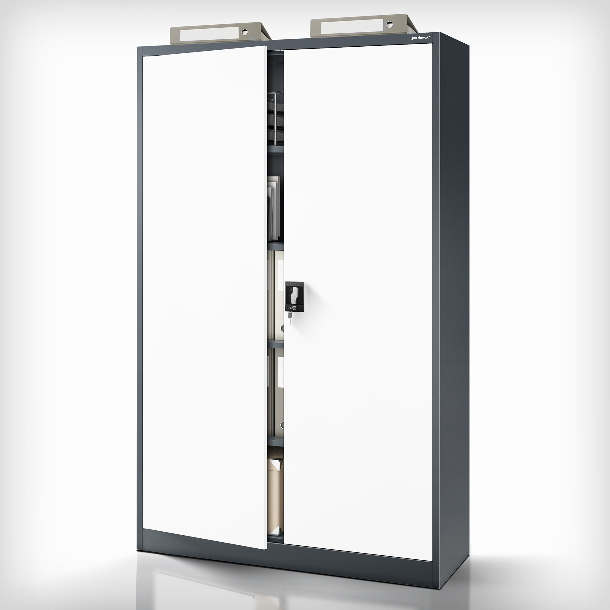 Hledáte spolehlivé a stylové řešení pro ukládání dokumentů, nářadí, lékařského vybavení nebo čehokoliv jiného? Skříň JAN II v elegantní antracitově-bílé kombinaci je ideální volbou pro kanceláře, úřady, zdravotnická zařízení, dílny i moderní domácnosti.