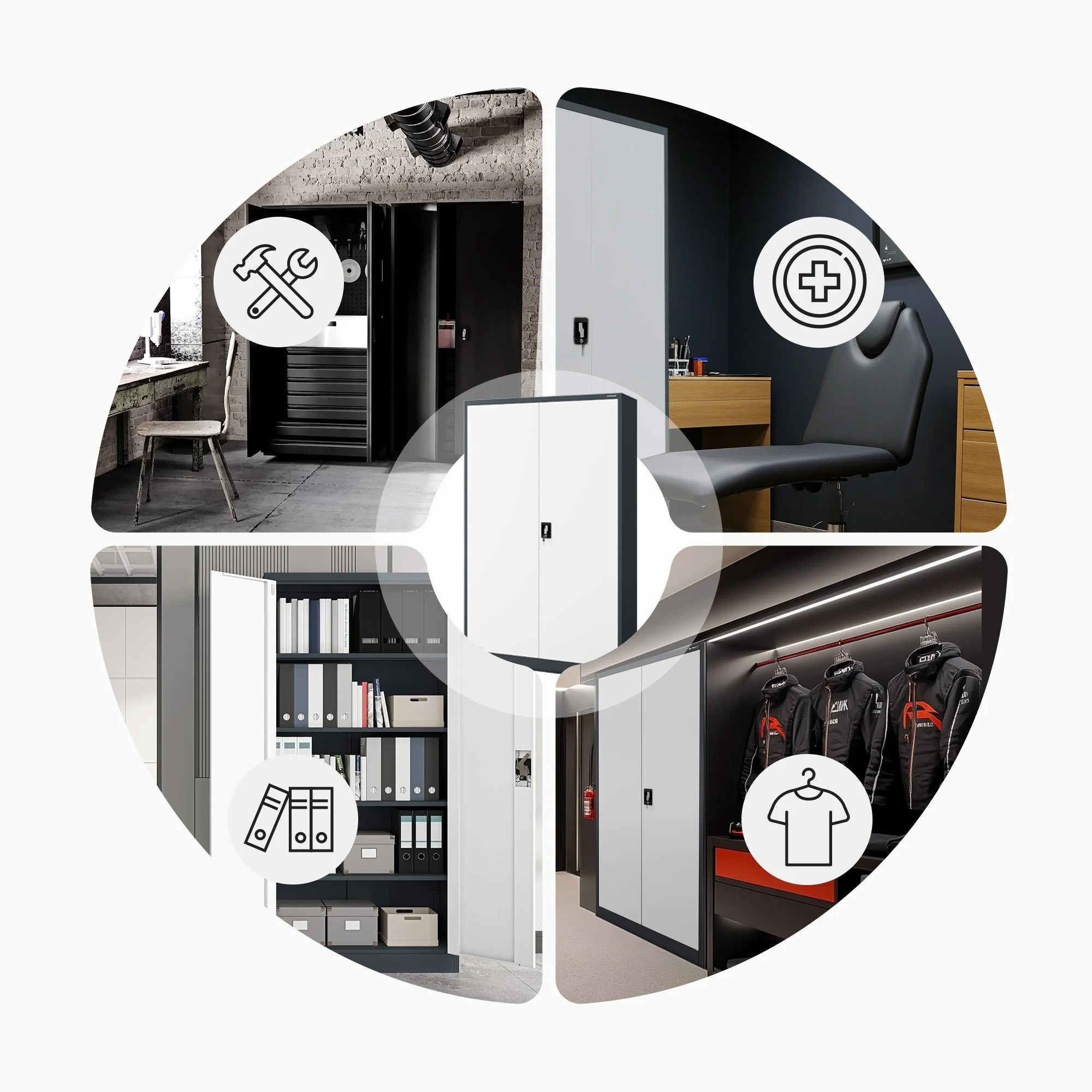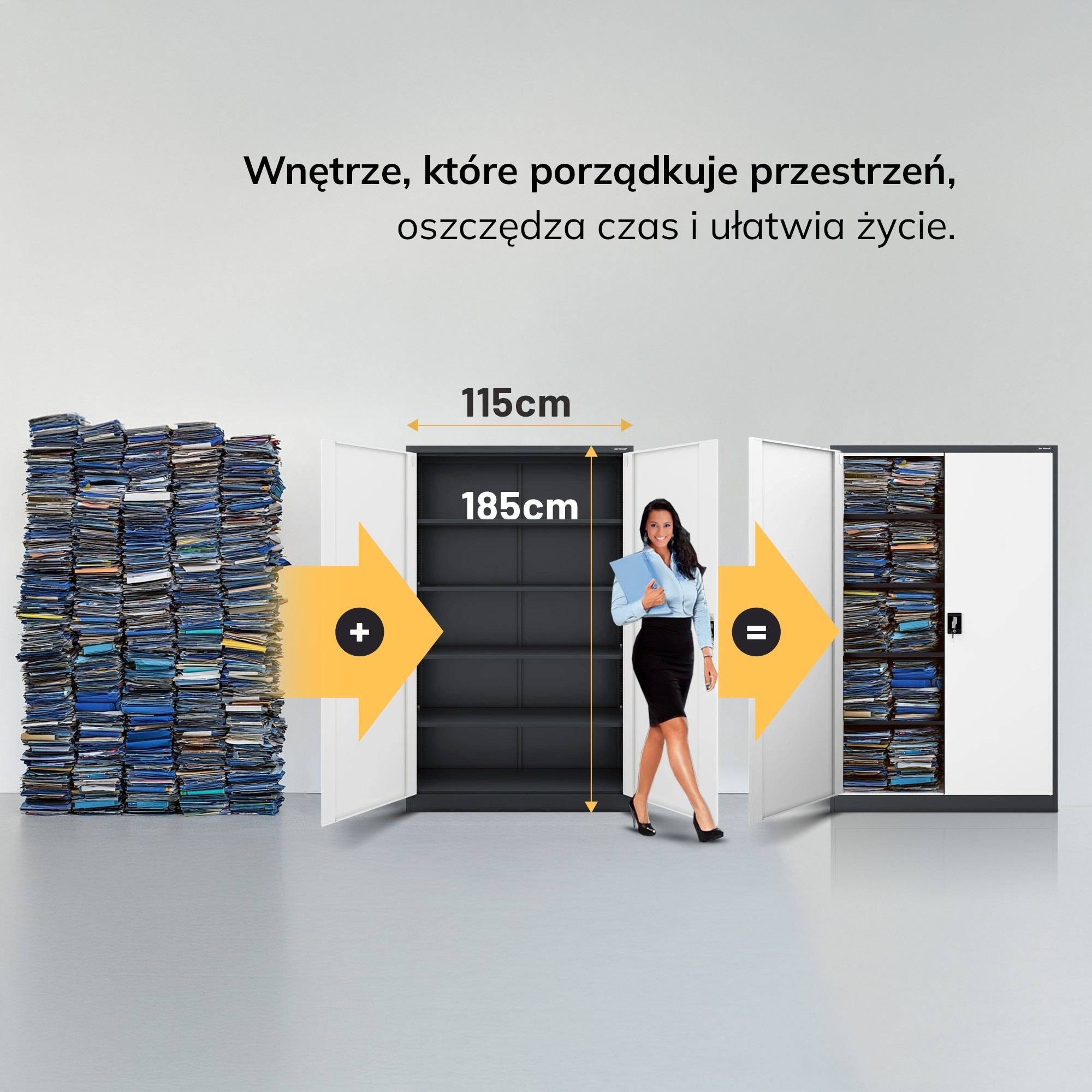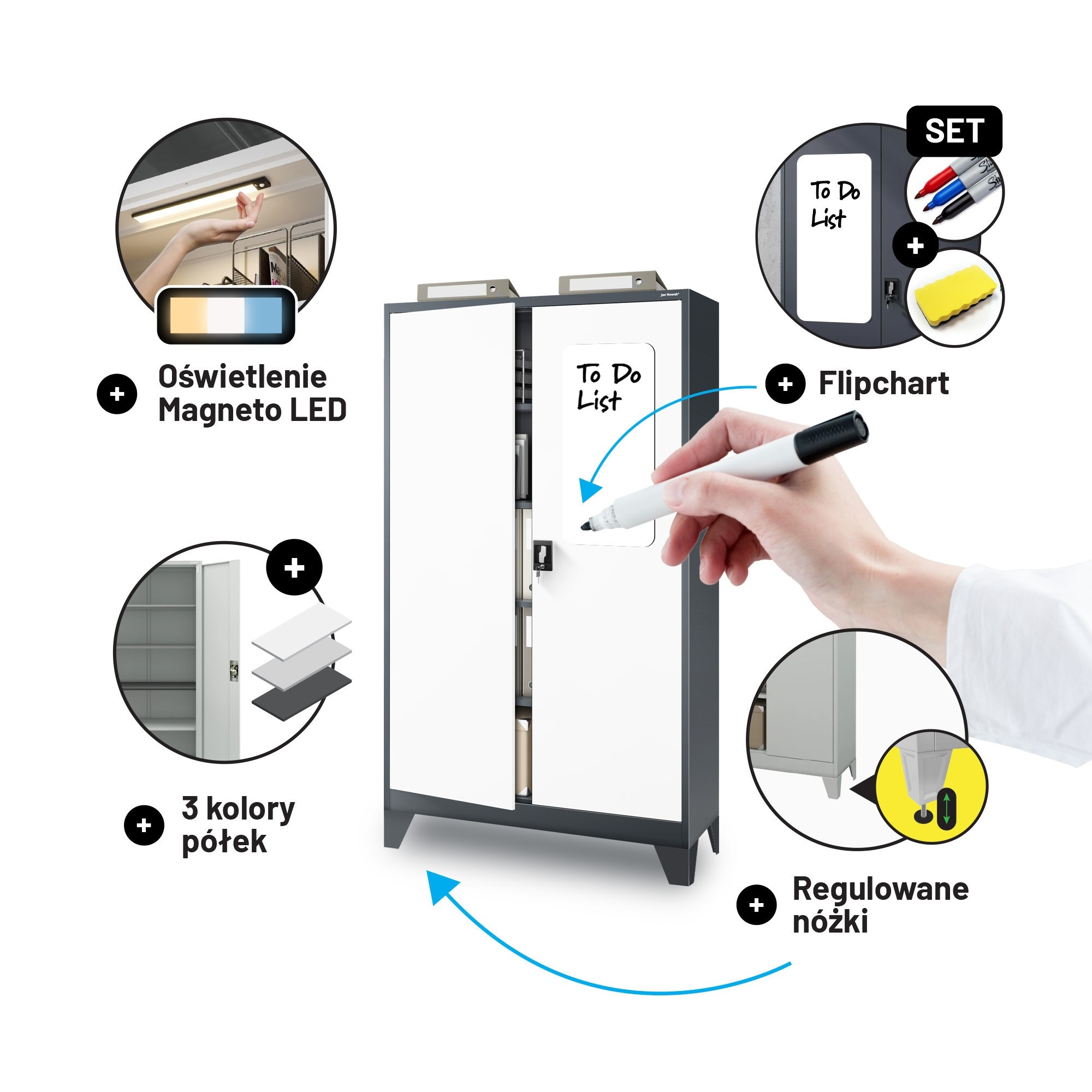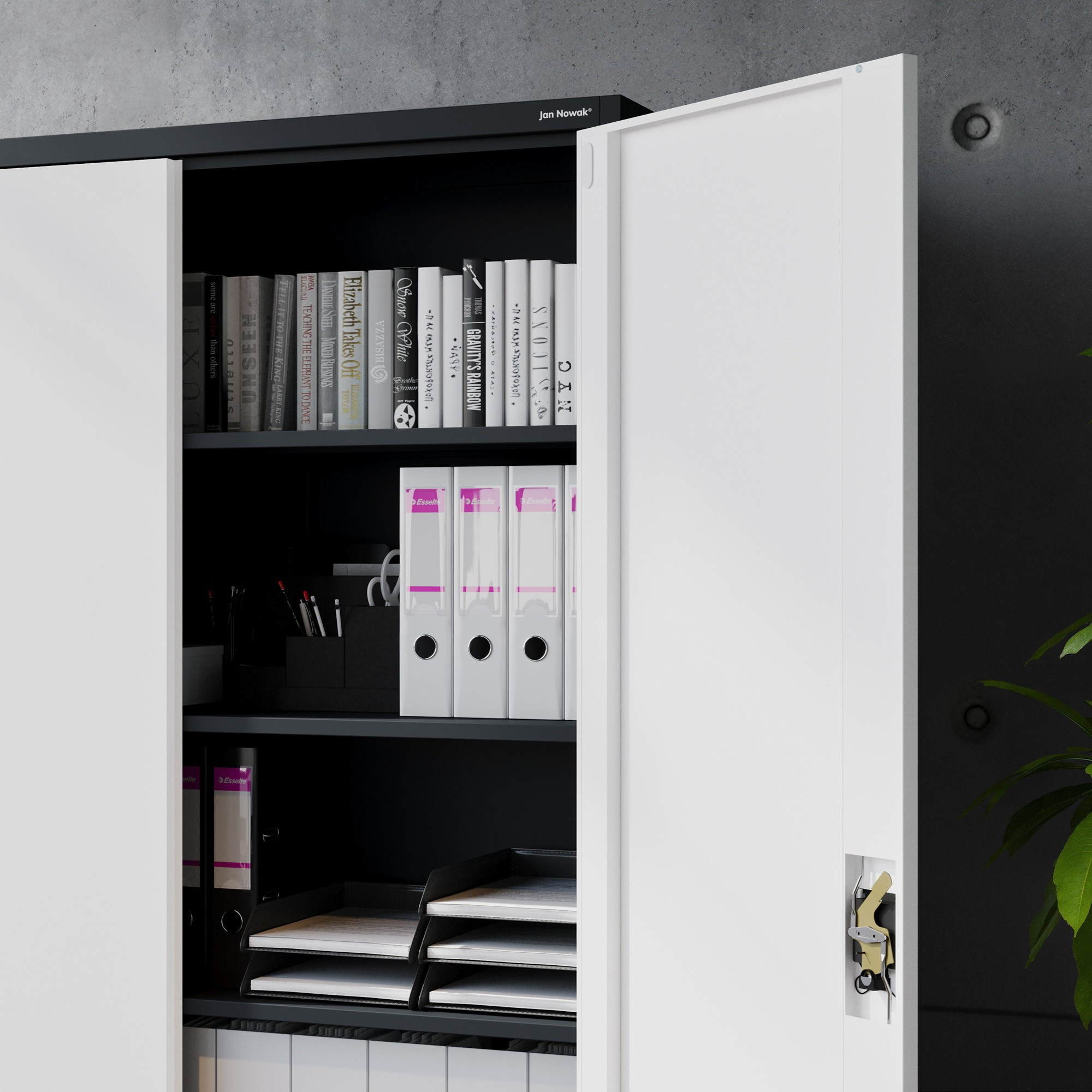 Hledáte spolehlivé a stylové řešení pro ukládání dokumentů, nářadí, lékařského vybavení nebo čehokoliv jiného? Skříň JAN II v elegantní antracitově-bílé kombinaci je ideální volbou pro kanceláře, úřady, zdravotnická zařízení, dílny i moderní domácnosti.