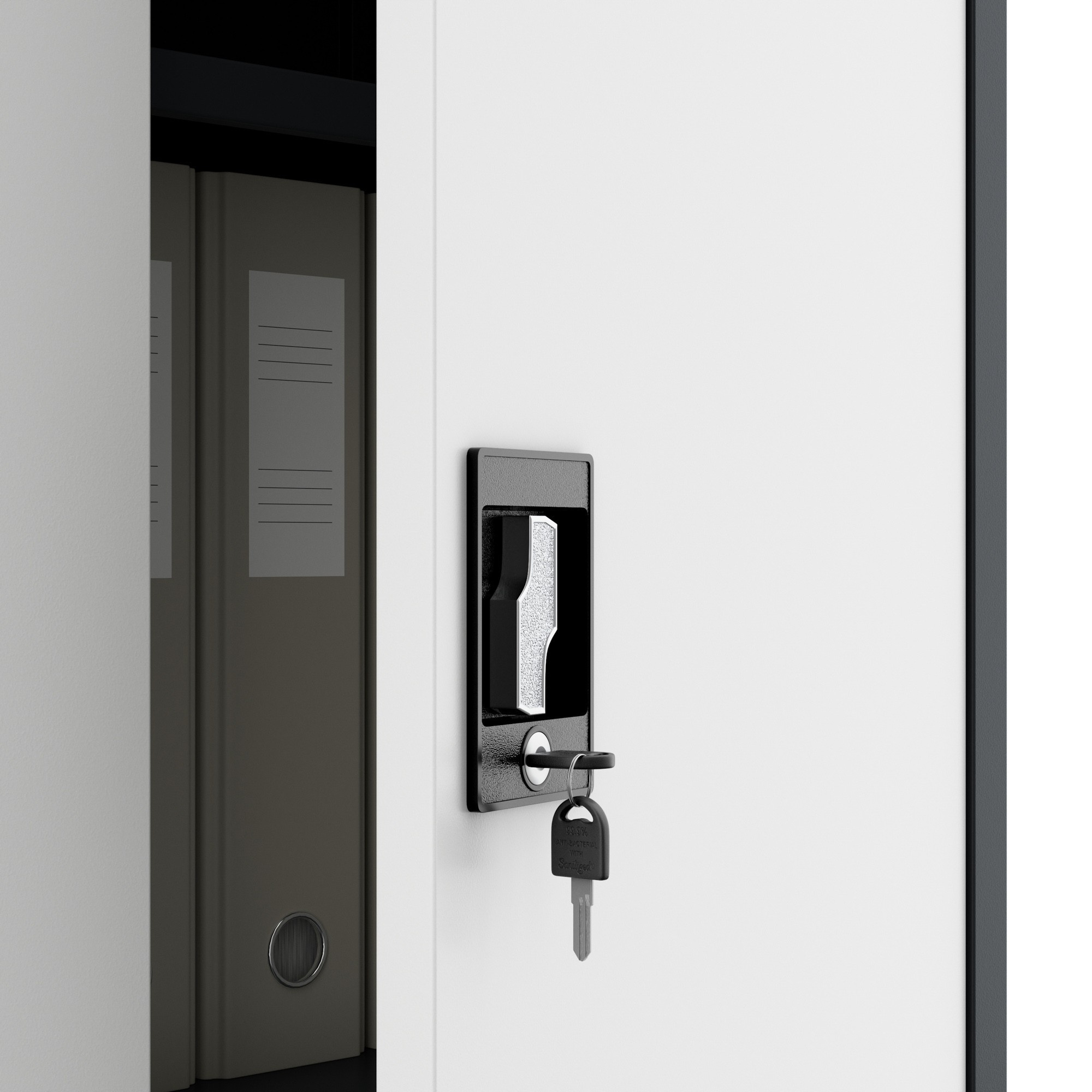 Díky dvoukřídlým dveřím se zámkem uzamykatelným ve 3 bodech si můžete být jisti, že vaše uložené věci jsou v bezpečí. Součástí balení jsou 2 klíče, takže máte vždy záložní variantu.