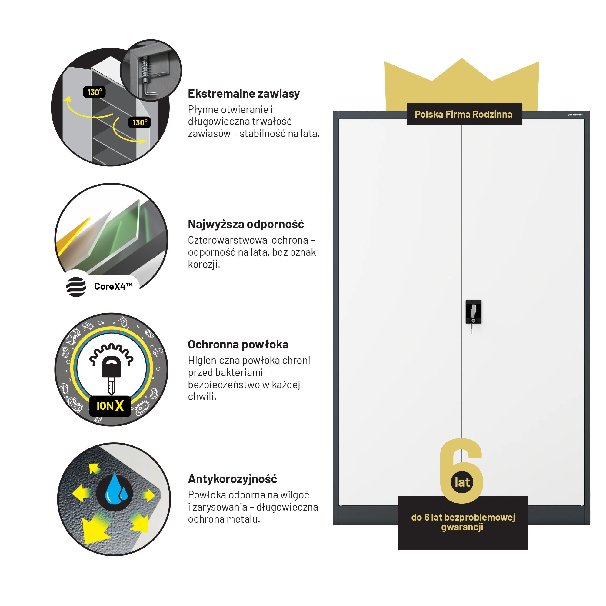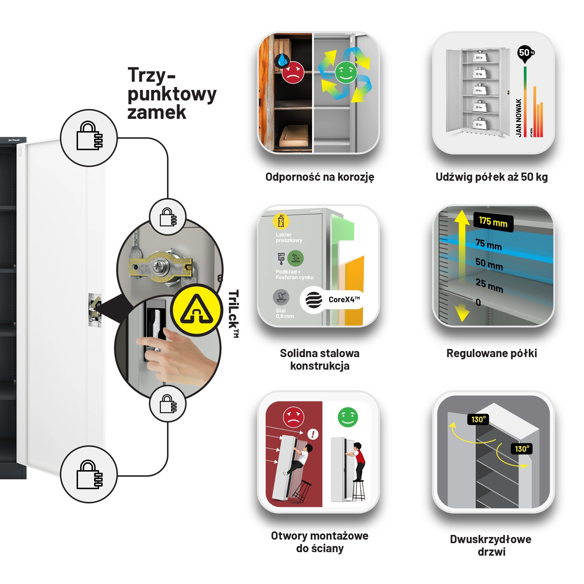 Skříň JAN II je vyrobena z kvalitní oceli o tloušťce 0,6 mm, která je odolná proti mechanickému poškození. Práškové lakování zajišťuje dlouhou životnost a odolnost proti korozi. Můžete se spolehnout, že vám bude sloužit dlouhá léta.