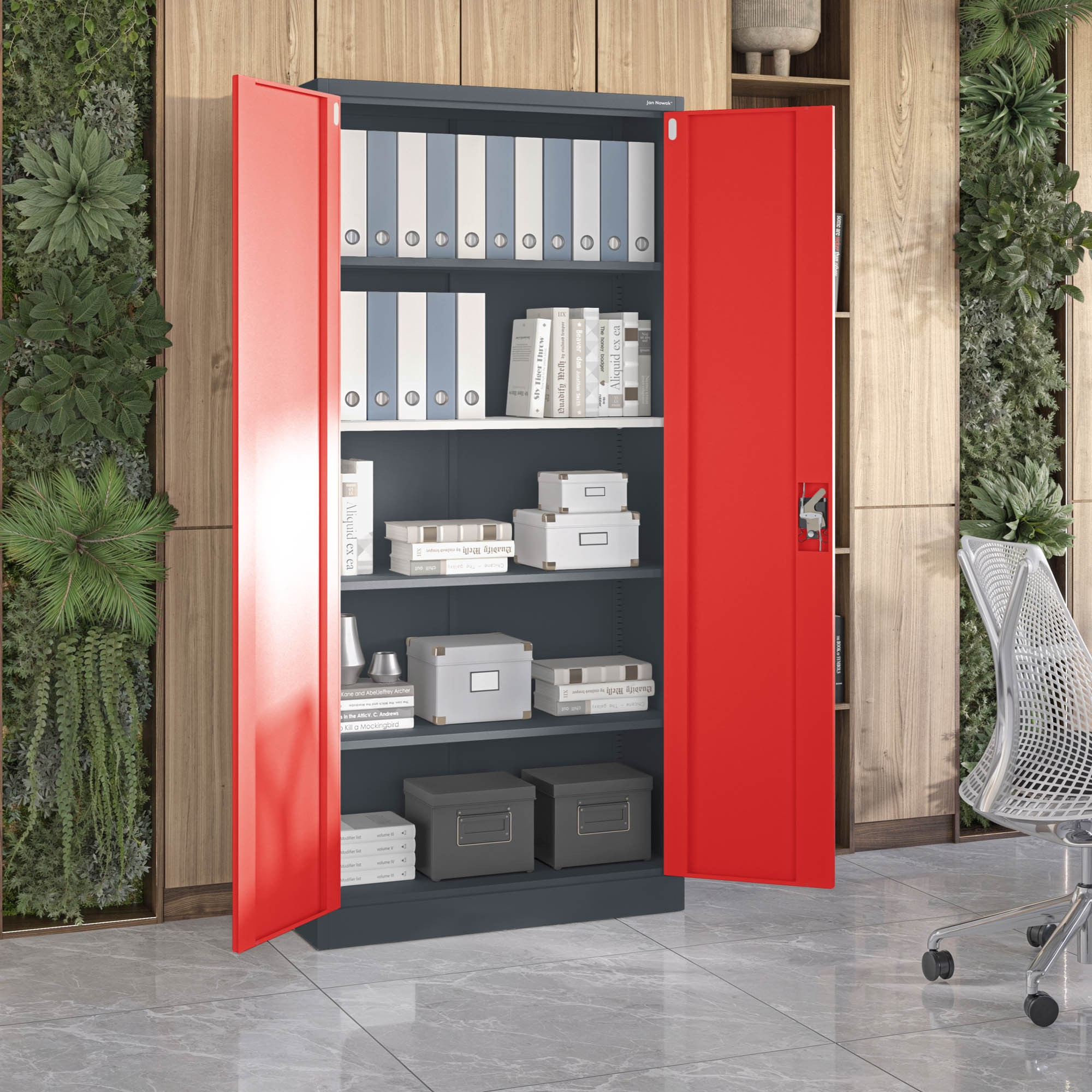 Skříň JAN H je mimořádně prostorná a pojme až 50 šanonů. Uspořádejte si své dokumenty a mějte je vždy po ruce.