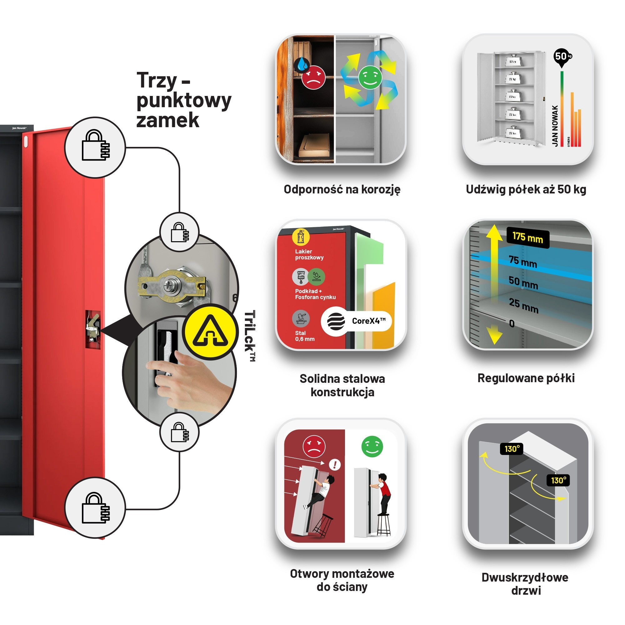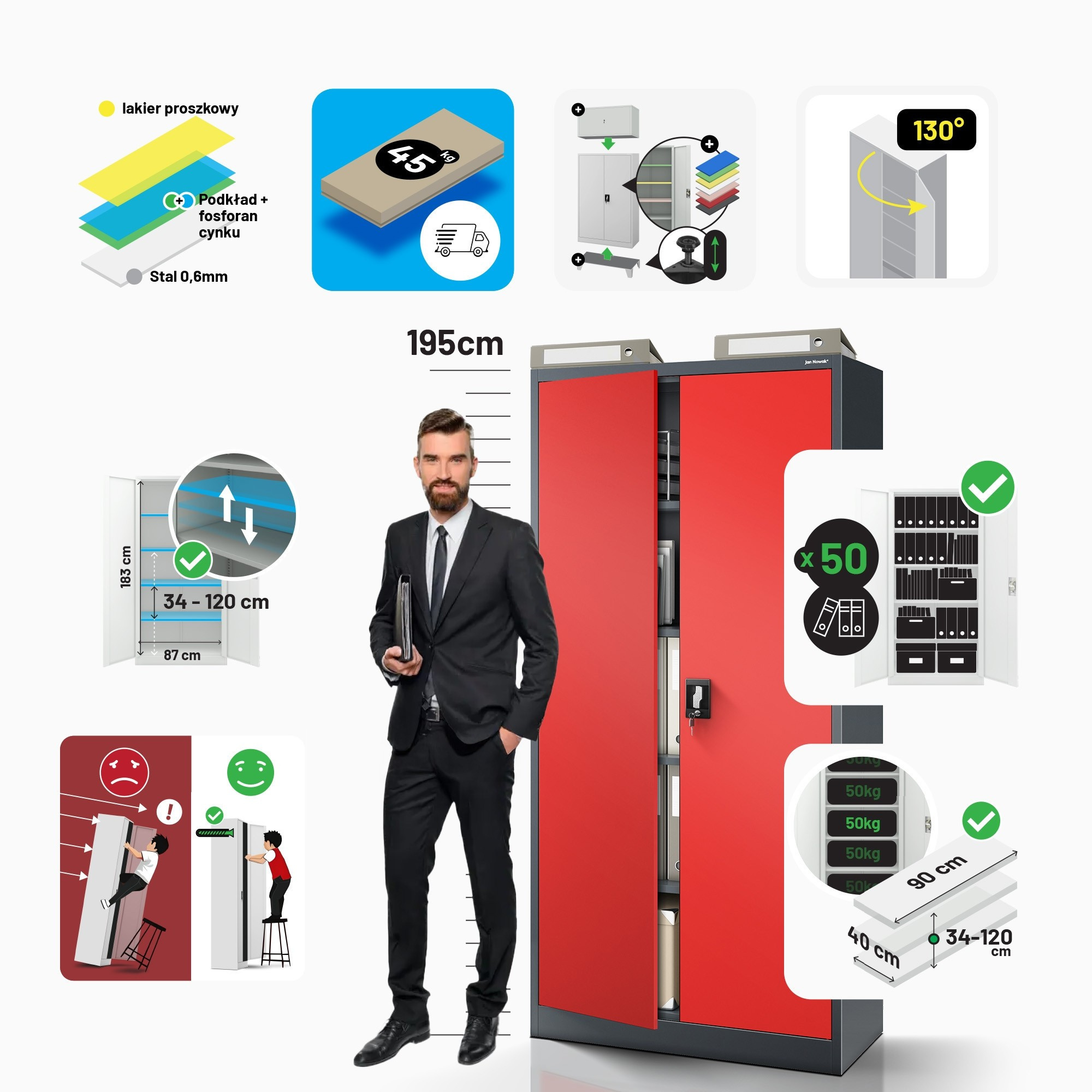 Skříň JAN H je investicí do kvality, trvanlivosti a bezpečnosti. Je vyrobena z nejlepších materiálů a s důrazem na detail. Můžete se spolehnout na její dlouhou životnost a bezproblémové používání.