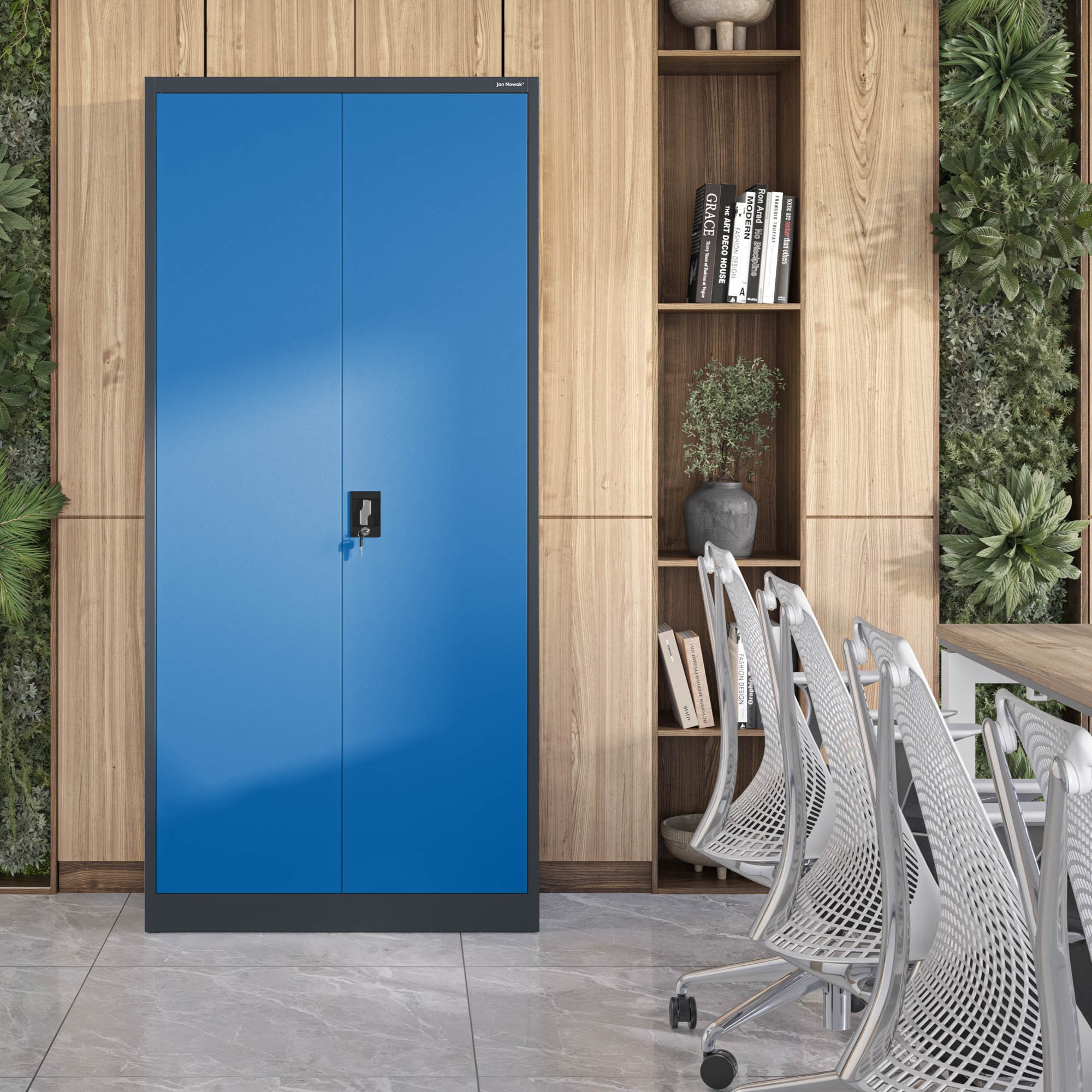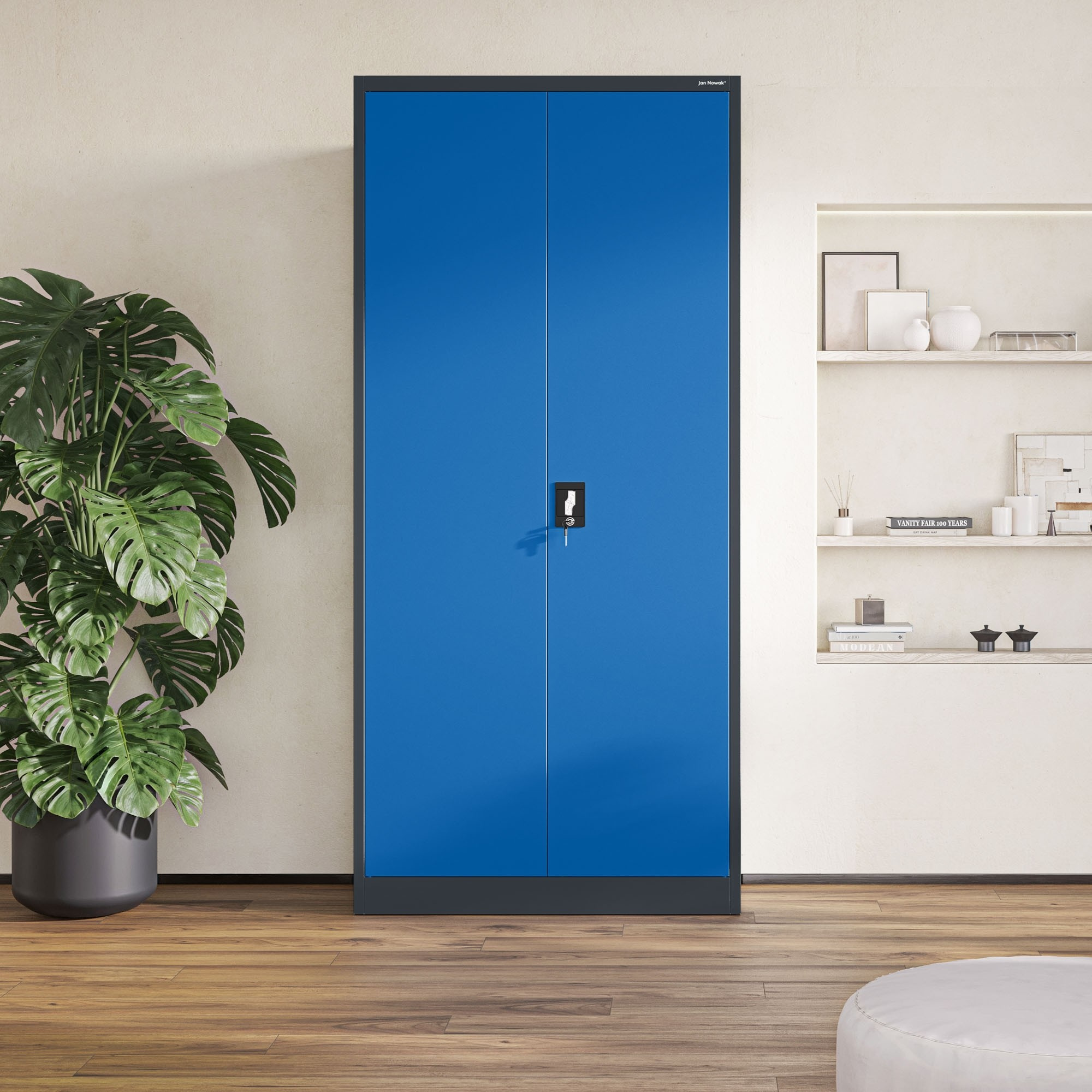 Antracitově-modrá barevná kombinace skříně JAN H je moderní a elegantní. Skříň se snadno začlení do různých stylů interiérů a dodá jim osobitý charakter. Její minimalistický design a čisté linie se hodí jak do kancelářských prostor, tak i do moderních domácností.