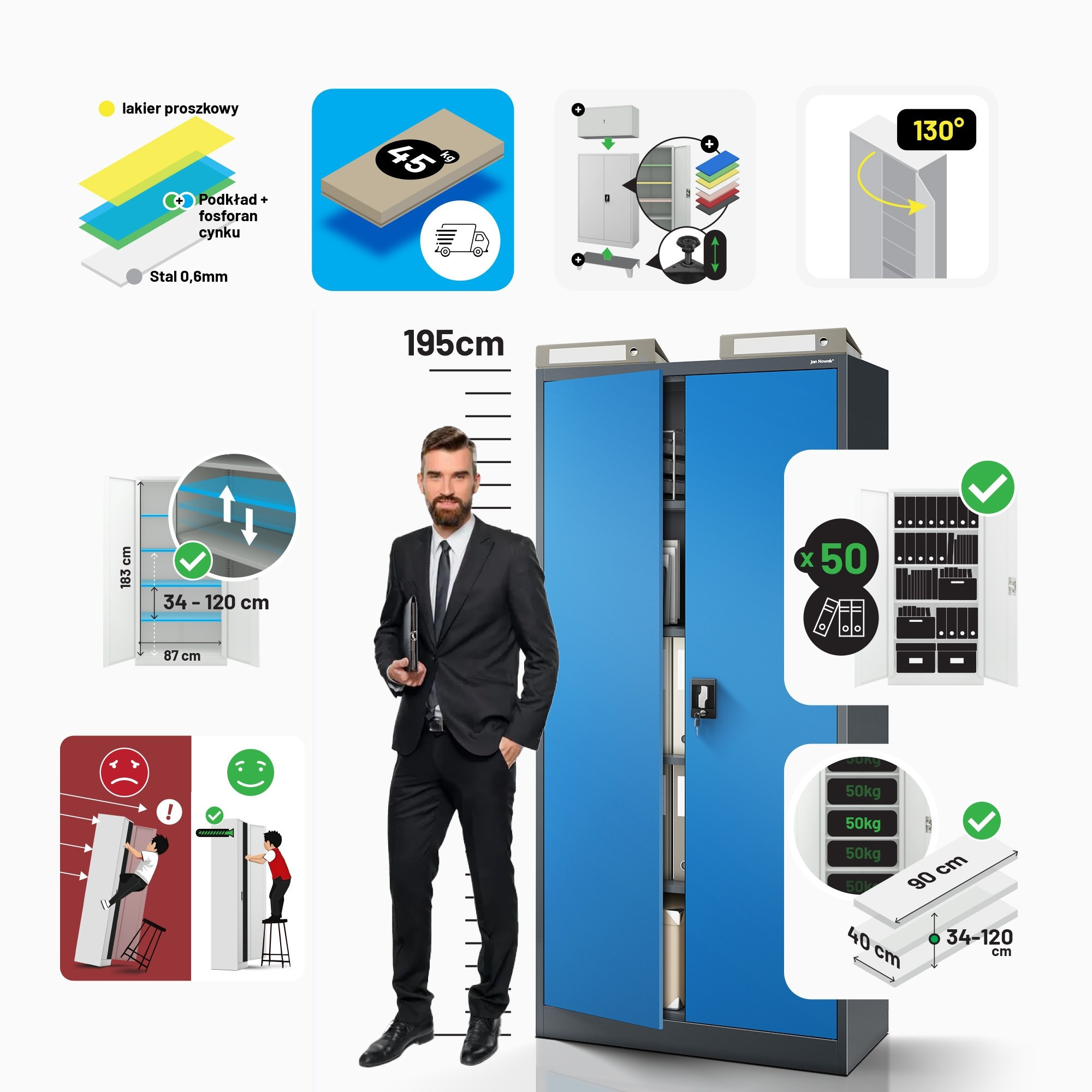 - Odolnost: Díky kvalitní oceli a práškovému lakování je skříň odolná proti poškození a korozi.