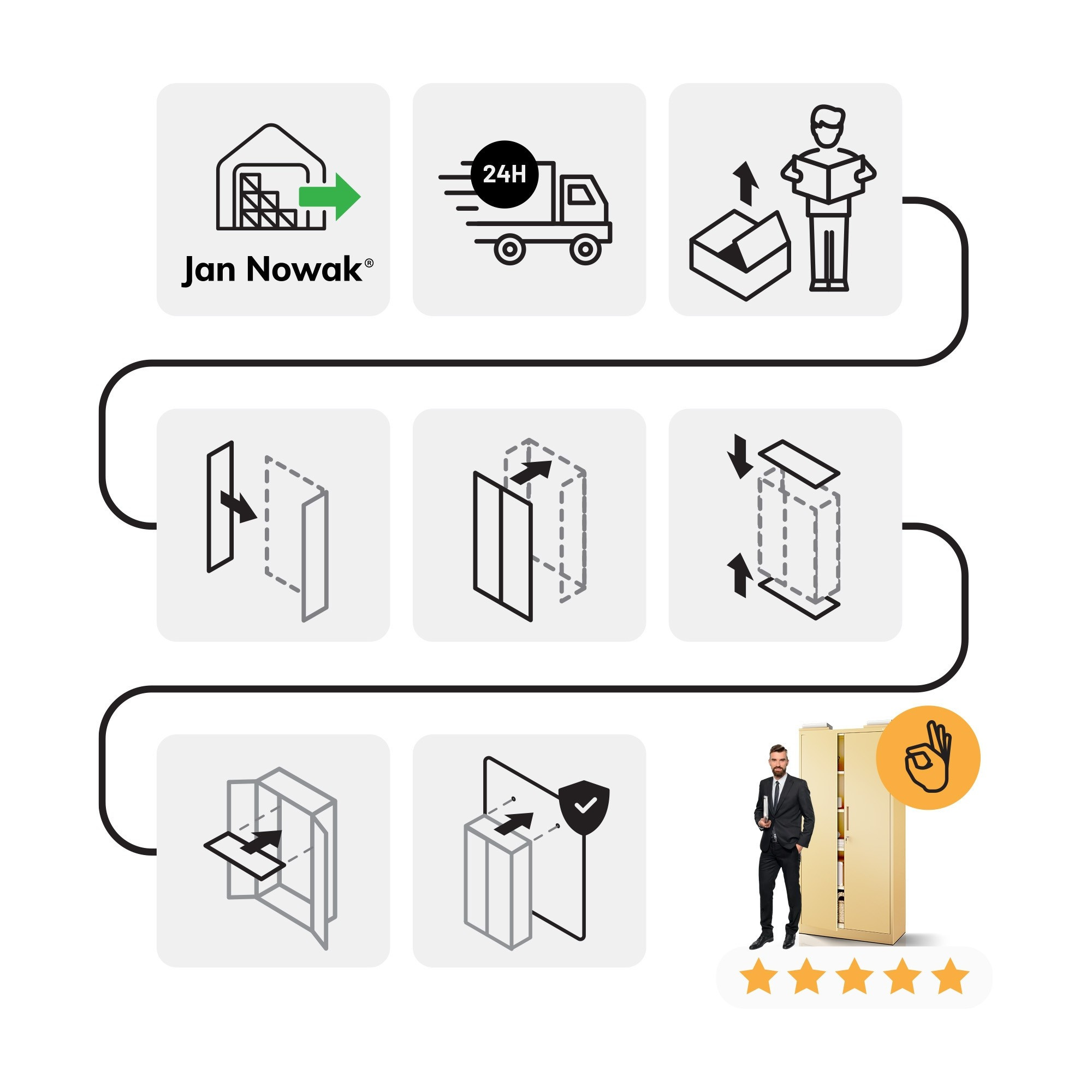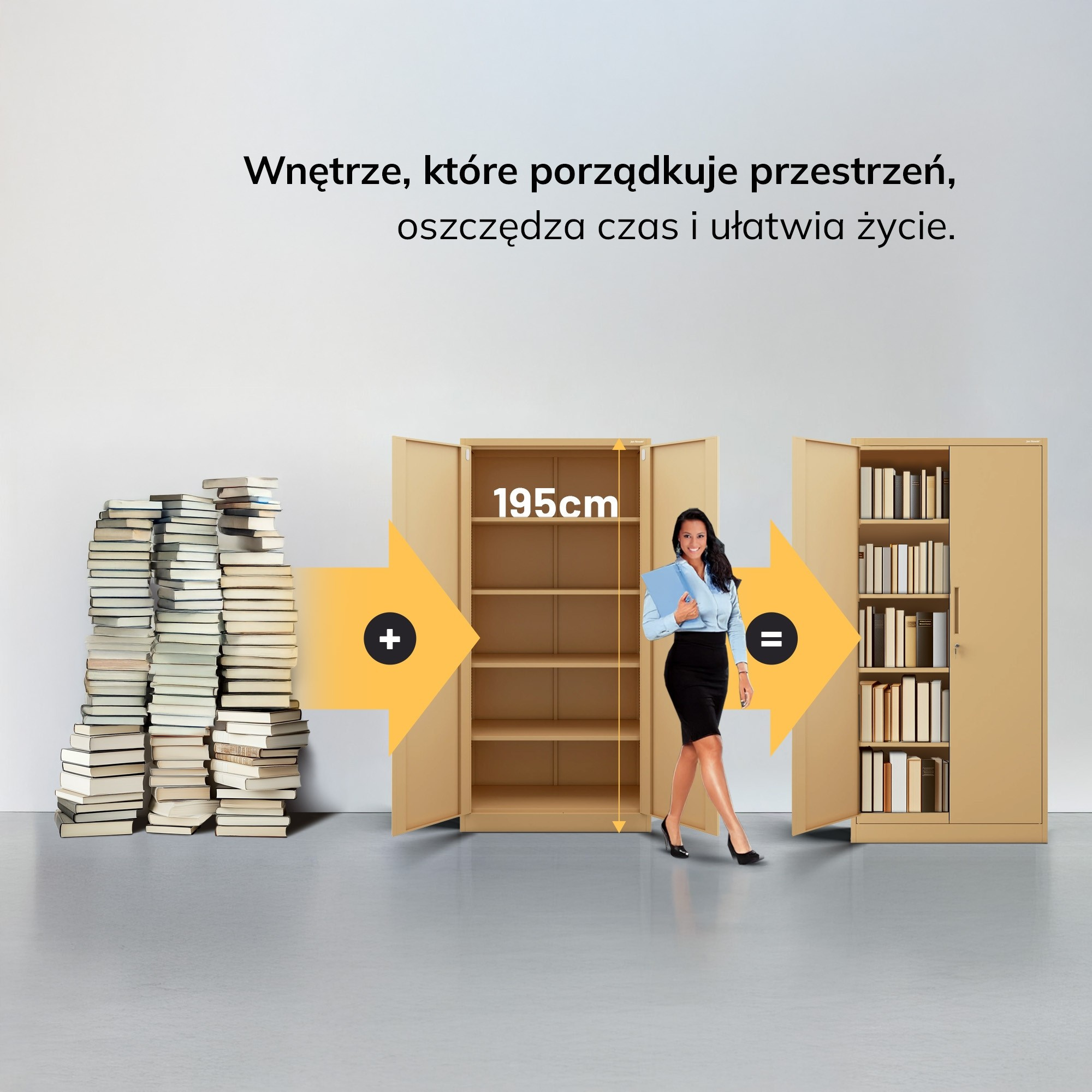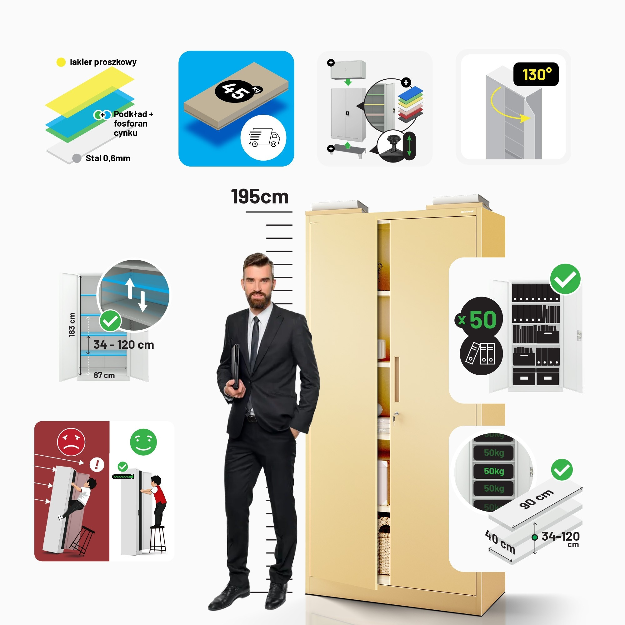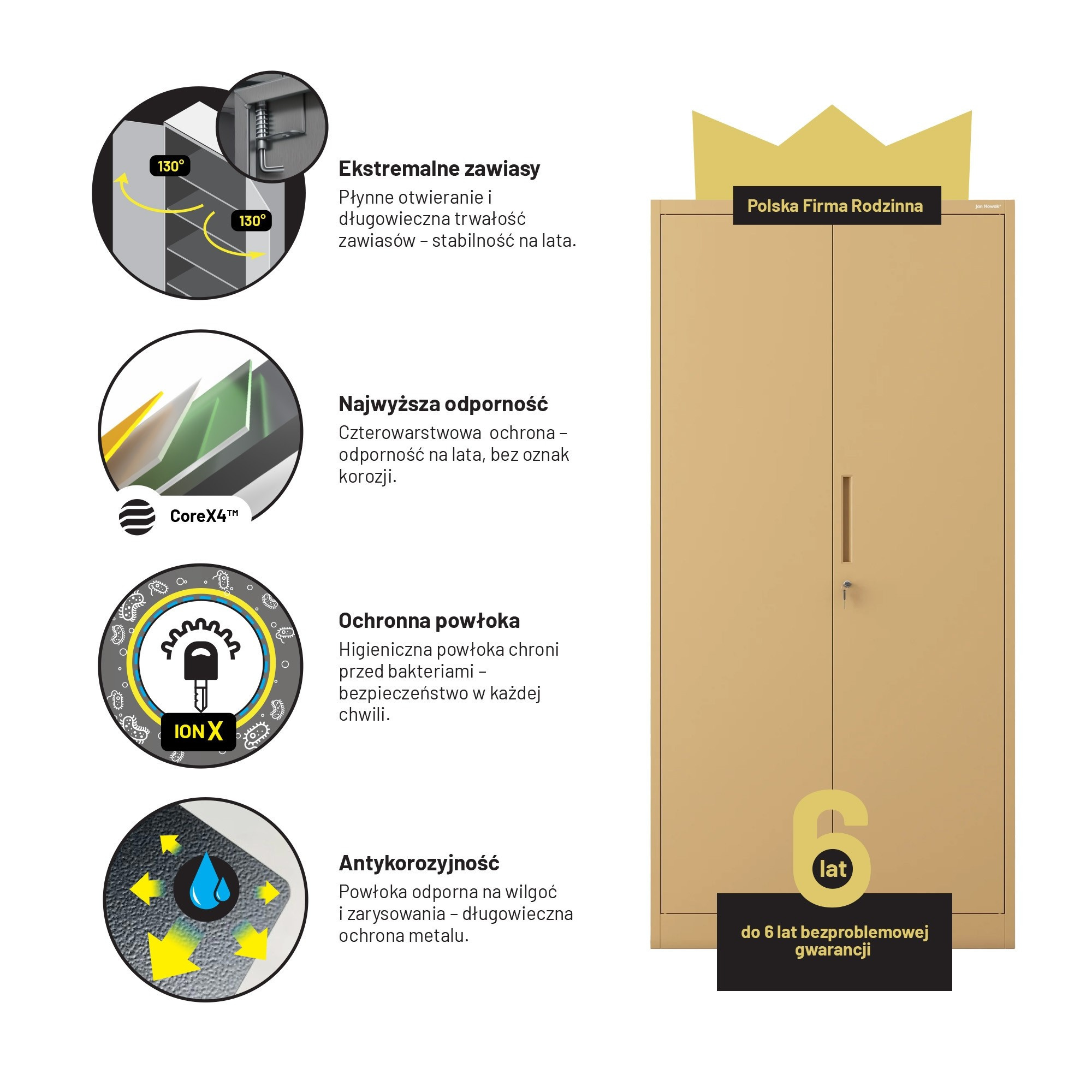 Zapomeňte na nudné a fádní skříně! Velká skříň s policemi JAN H přichází v elegantní béžové barvě RAL 1001, která se snadno hodí do jakéhokoli interiéru. Prášková barva je nejen krásná, ale také odolná proti poškrábání a korozi, takže si skříň udrží svůj skvělý vzhled po dlouhá léta.