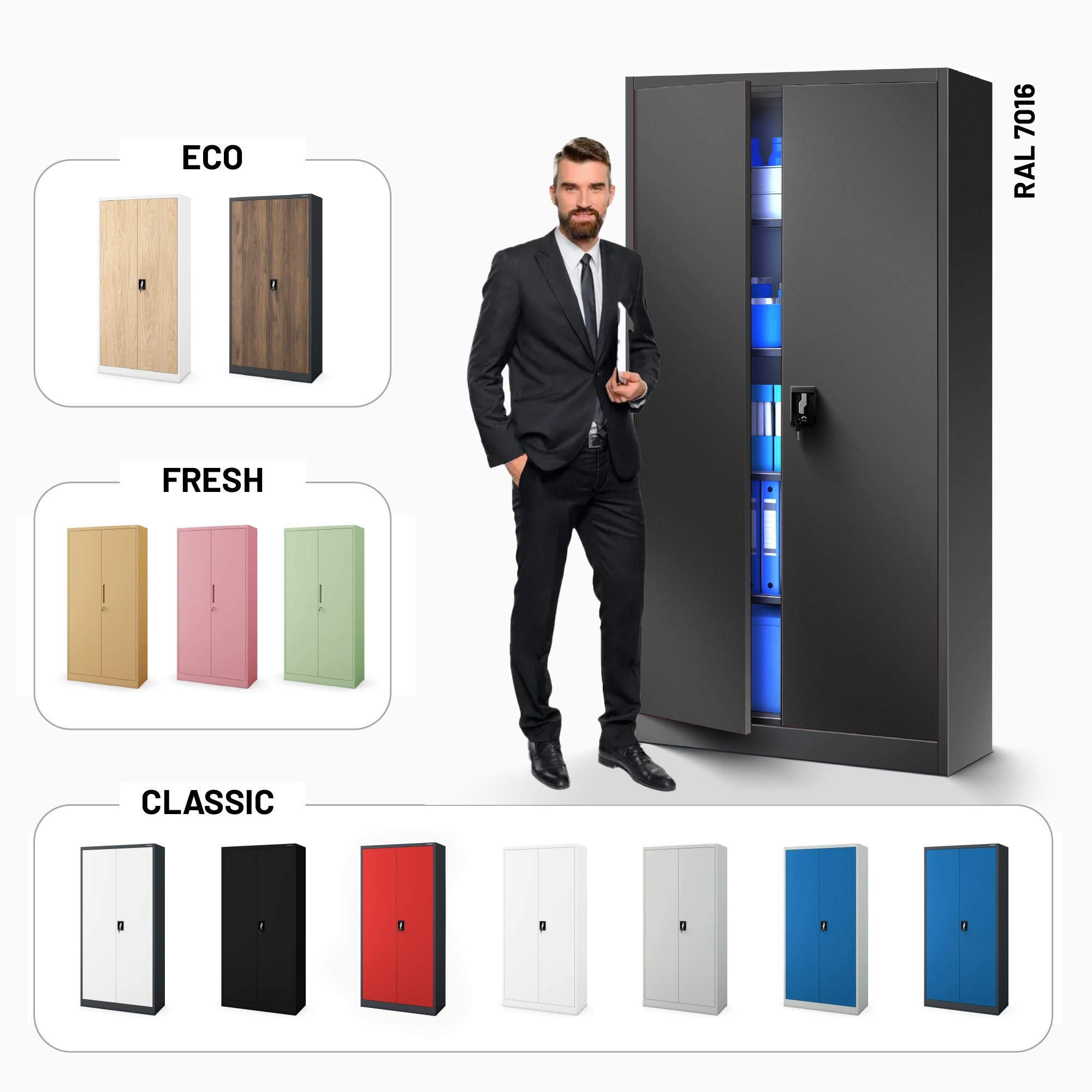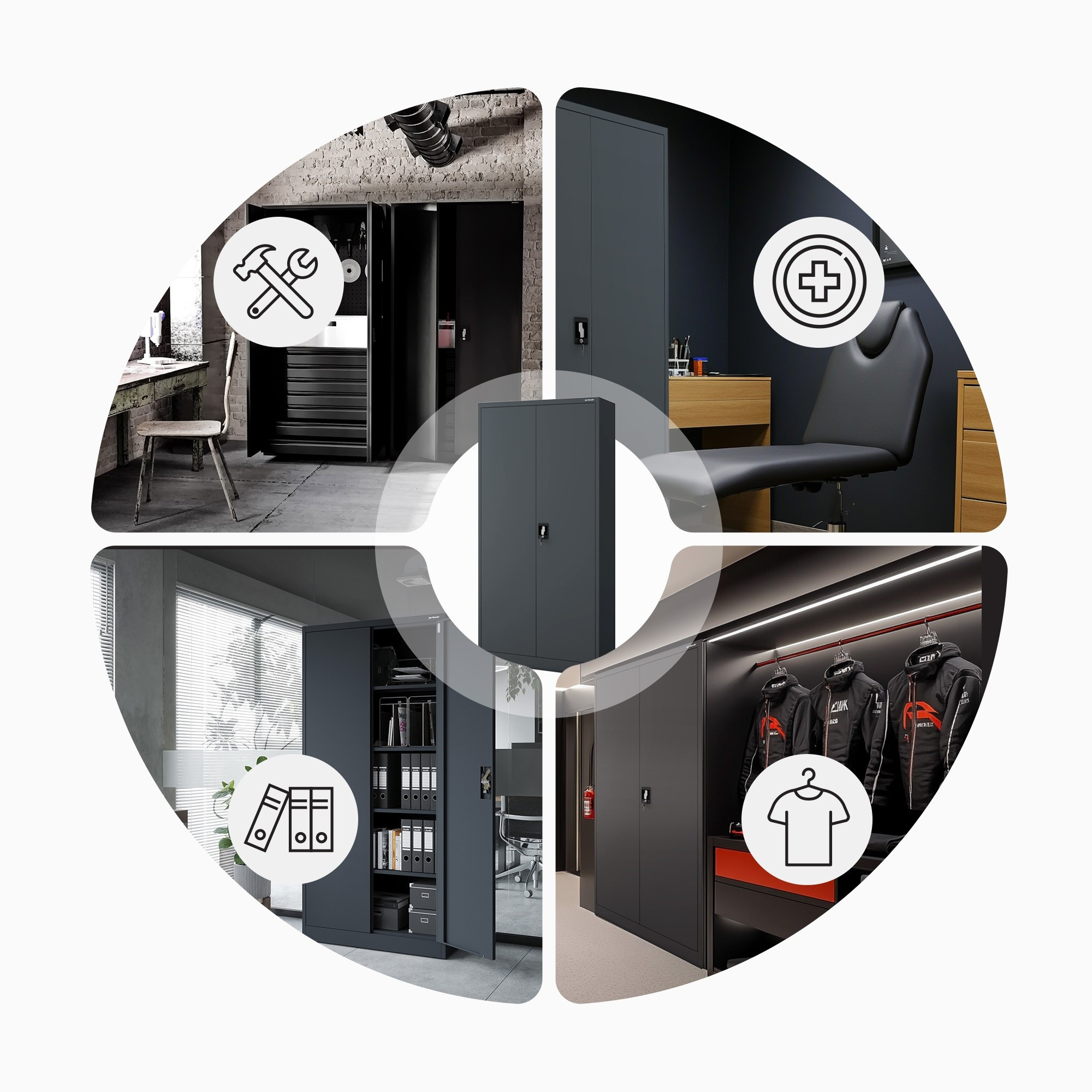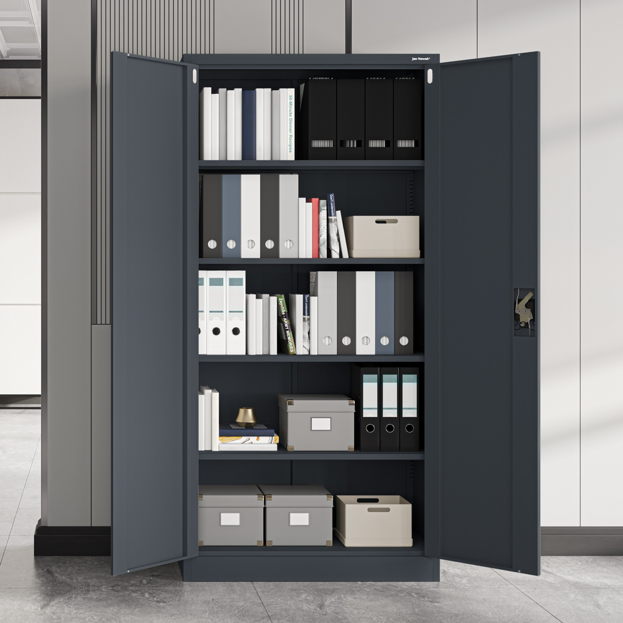Hledáte spolehlivé a elegantní řešení pro ukládání dokumentů, nářadí nebo léků? Představujeme vám uzamykatelnou kovovou skříň JAN v moderní antracitové barvě. Tato univerzální skříň se skvěle hodí do kanceláří, škol, dílen i domácností, kde oceníte její praktičnost a minimalistický design.