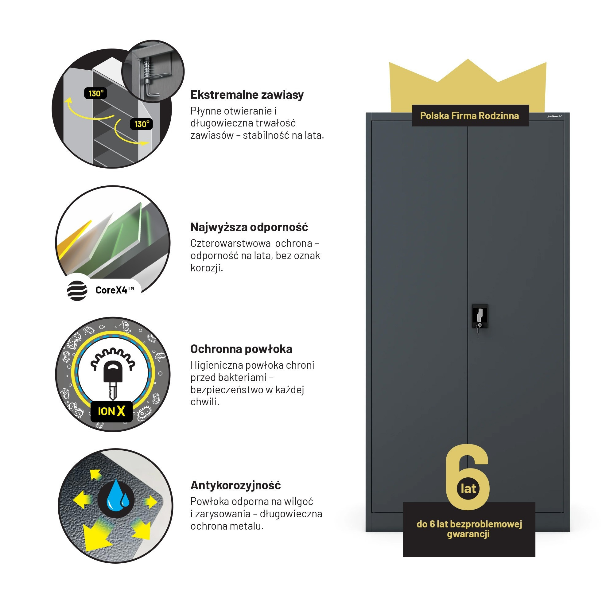 Skříň JAN je investicí do kvality, bezpečnosti a praktičnosti. Je vyrobena z nejlepších materiálů a s nekompromisním zpracováním, což zaručuje její dlouhou životnost a spolehlivost.