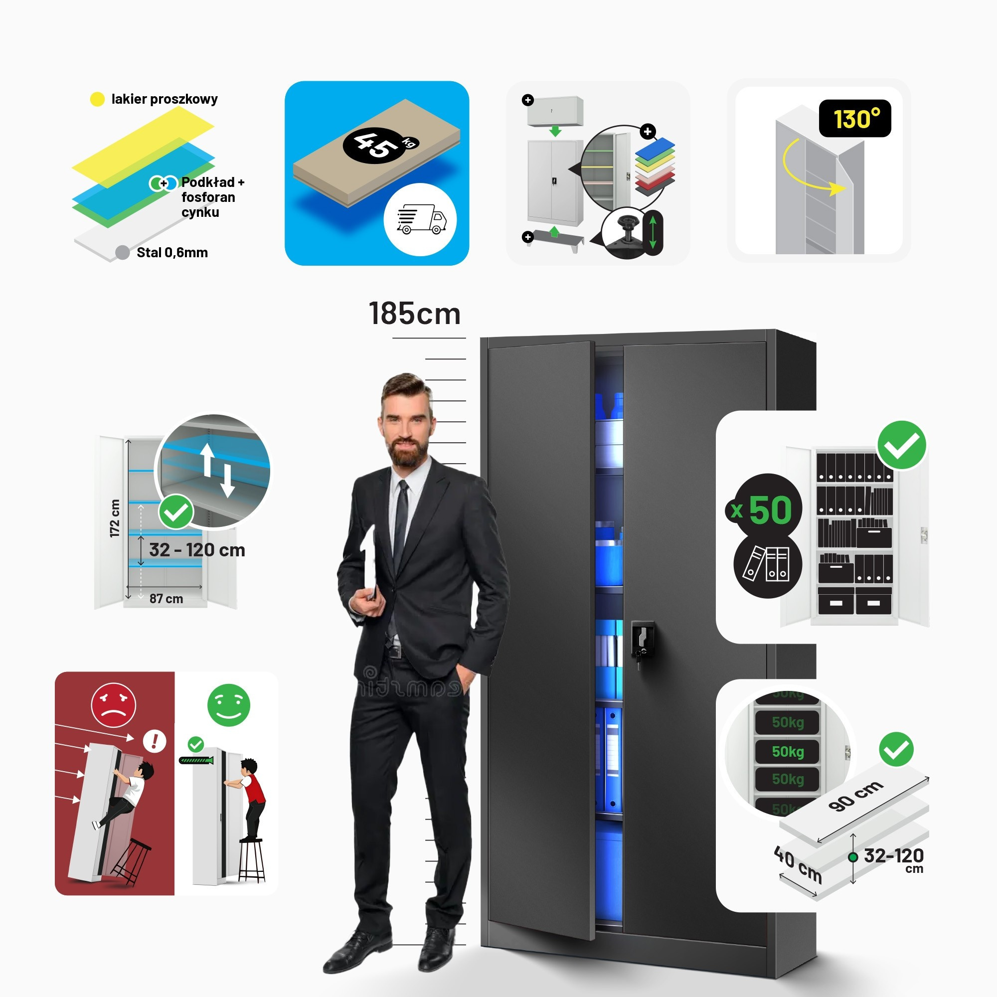 Skříň JAN je navržena tak, aby splňovala požadavky širokého spektra uživatelů. Ať už potřebujete bezpečně uložit firemní dokumenty, zdravotnické potřeby nebo dílenské nářadí, tato skříň vám poskytne dostatek prostoru a spolehlivou ochranu.