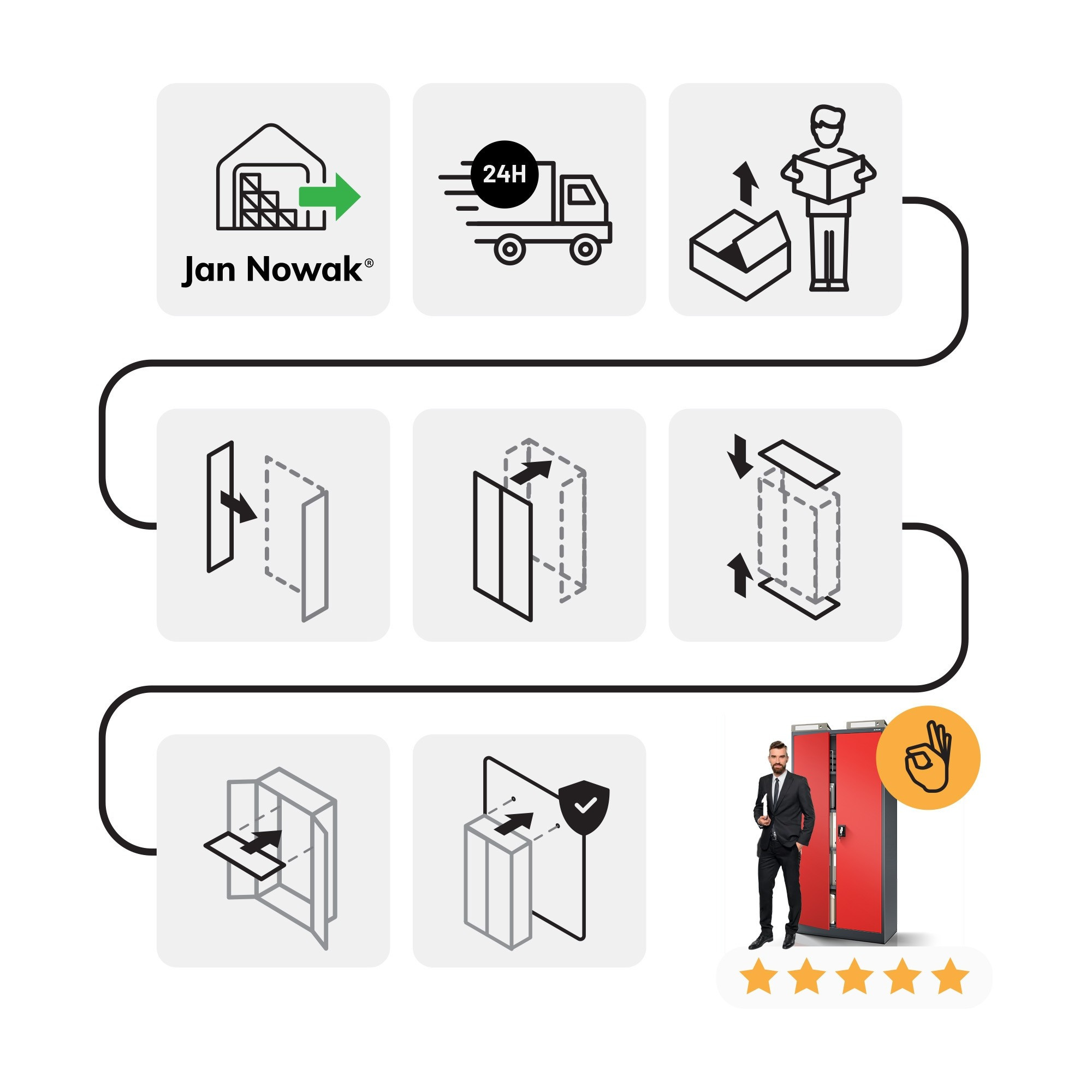 Skříň JAN je dodávána v demontovaném stavu, ale její montáž je jednoduchá a intuitivní. Součástí balení je podrobný návod, který vás krok za krokem provede celým procesem. Během krátké doby budete mít skříň připravenou k použití.