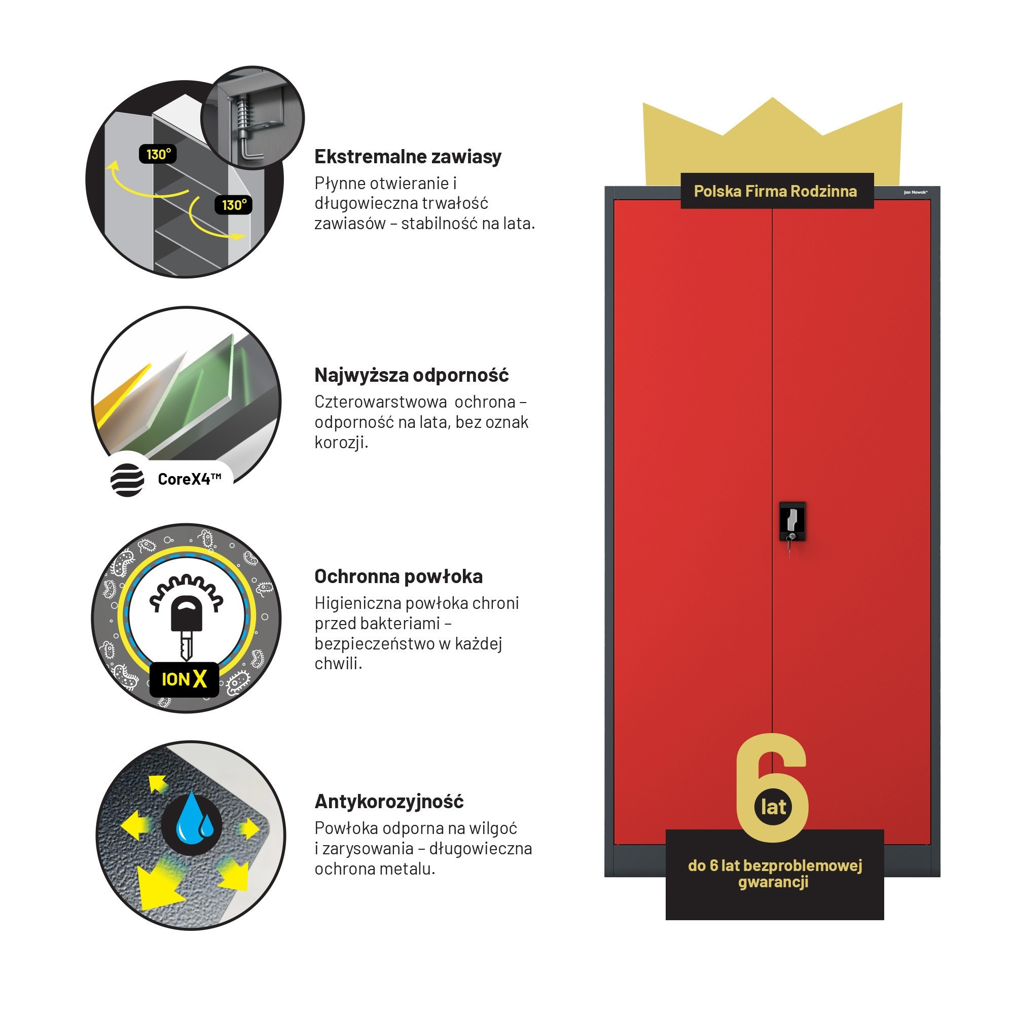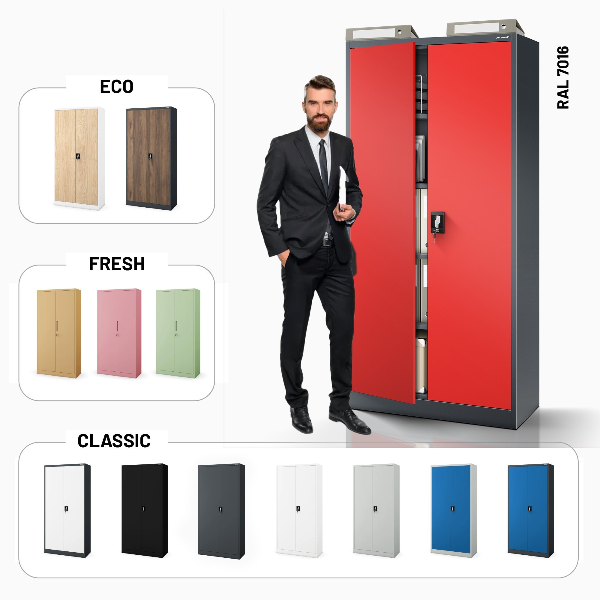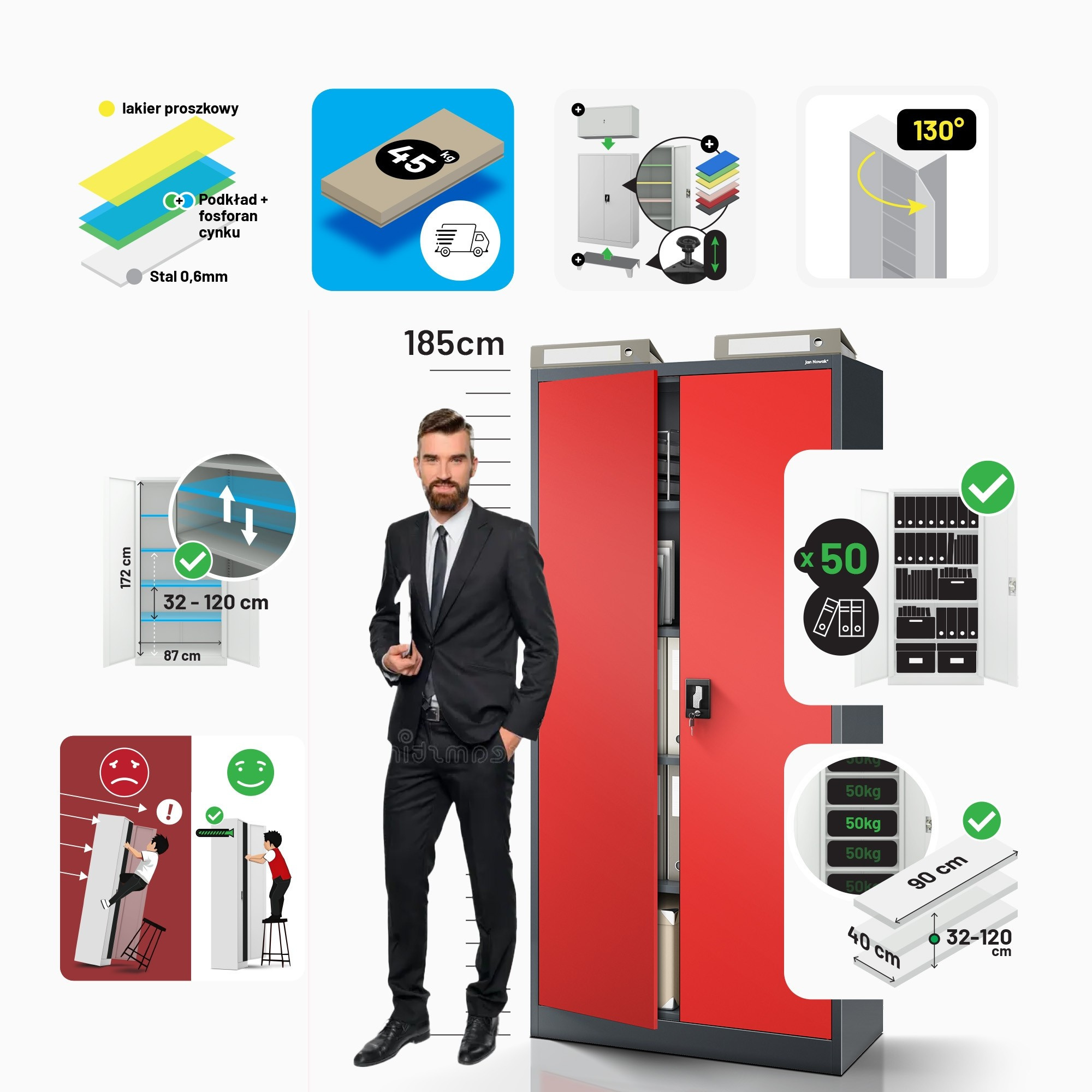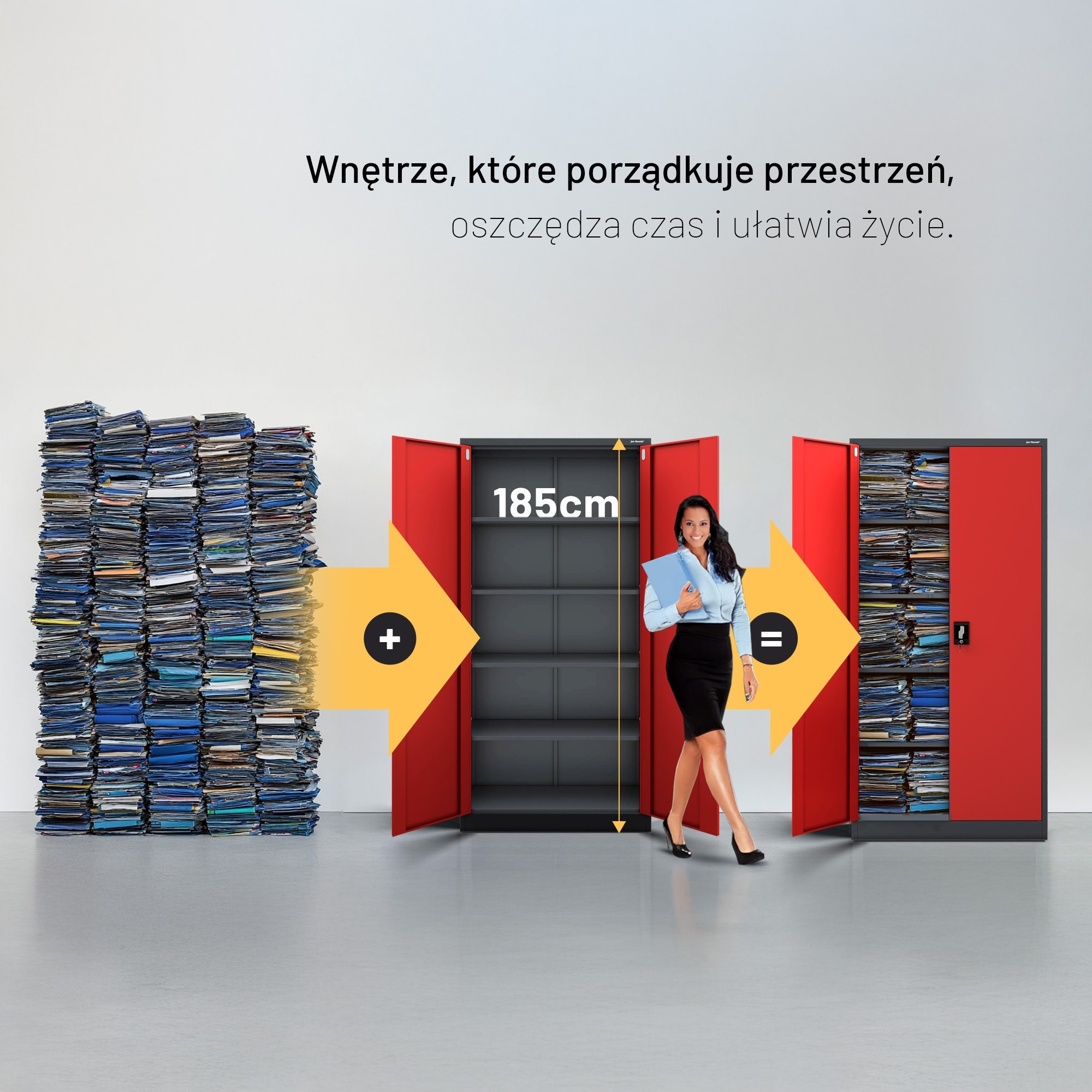 Hledáte dokonalé řešení pro uspořádání dokumentů a kancelářských potřeb? Představujeme vám kancelářskou skříň JAN v atraktivní antracitově-červené kombinaci, která se stane nejen praktickým, ale i designovým prvkem vašeho pracovního prostoru. Tato ocelová skříň je synonymem pro odolnost, funkčnost a moderní vzhled.