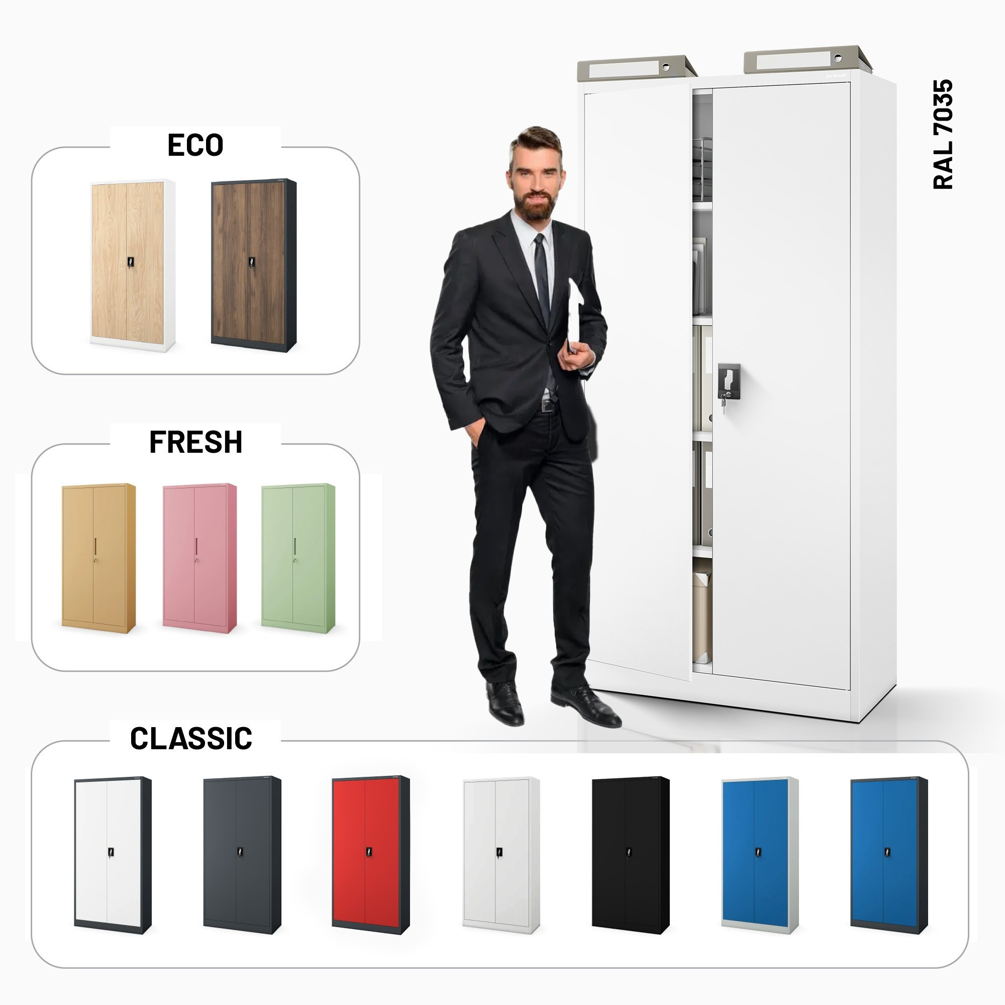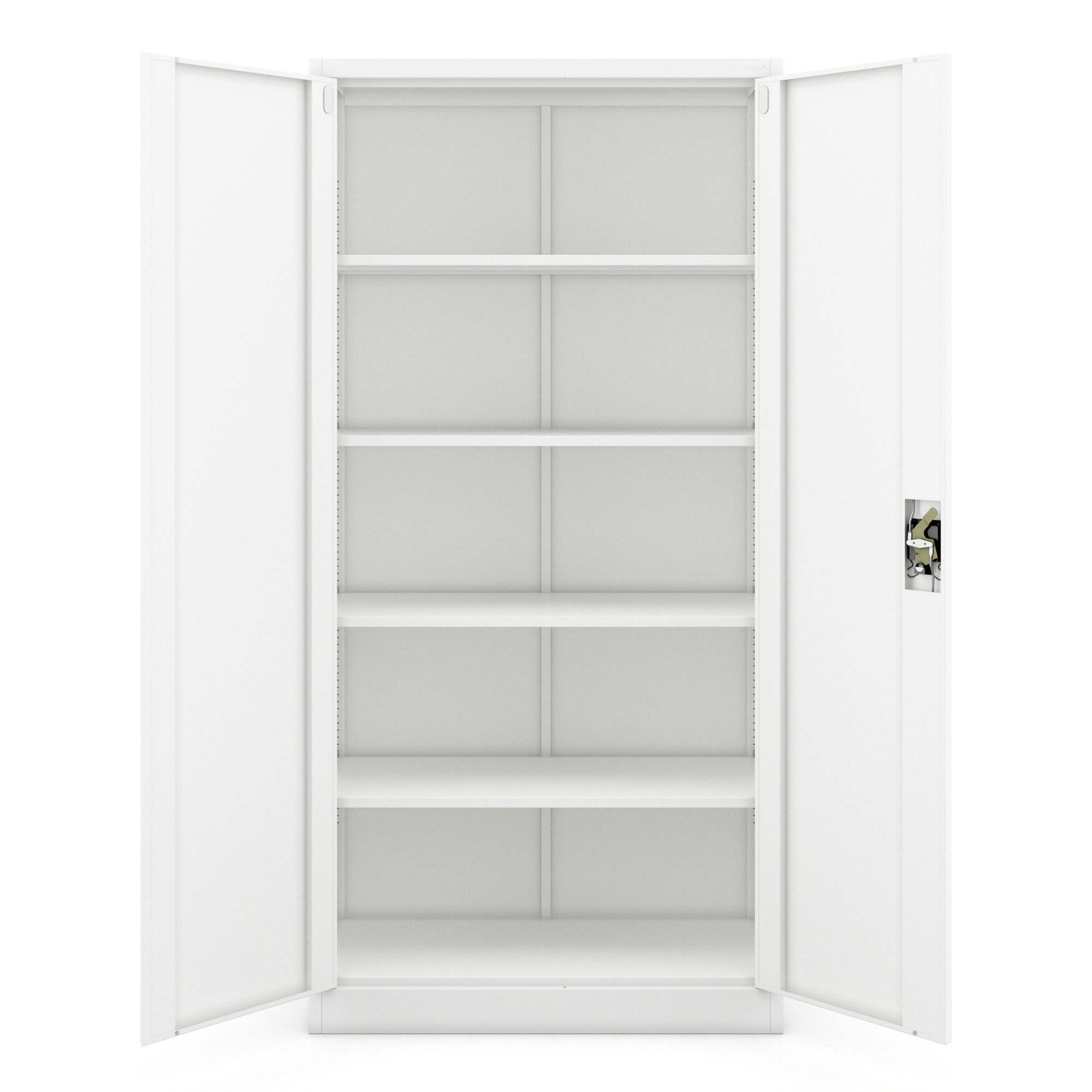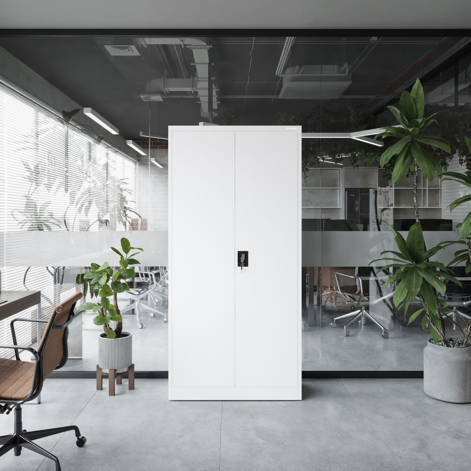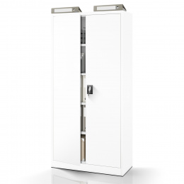 Skříň JAN se vyznačuje minimalistickým a funkčním designem, který se snadno začlení do jakéhokoli interiéru. Její neutrální bílá barva (RAL 9003) s elegantním matným povrchem působí čistě a profesionálně. Ať už preferujete moderní, industriální nebo klasický styl, skříň JAN se stane jeho přirozenou součástí.