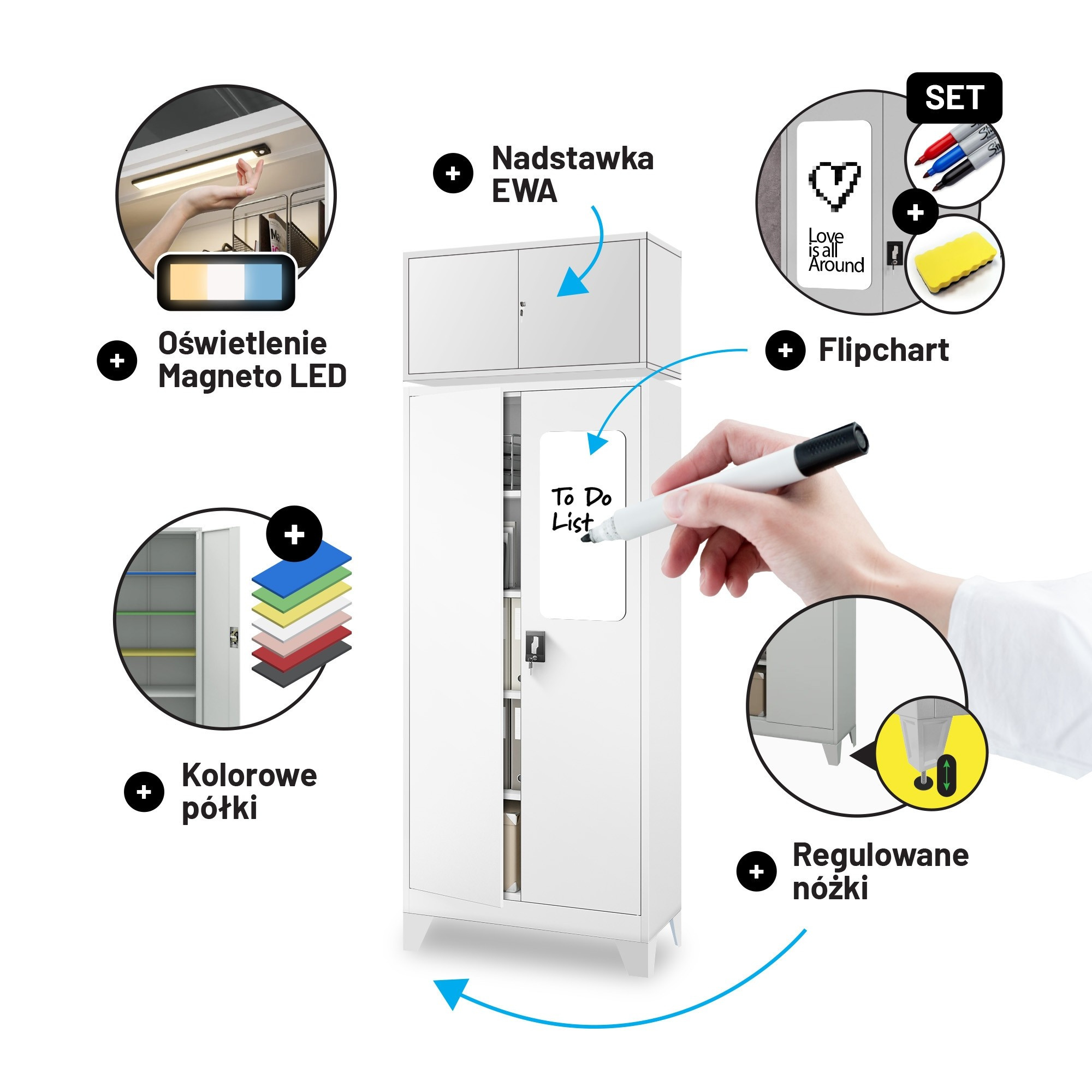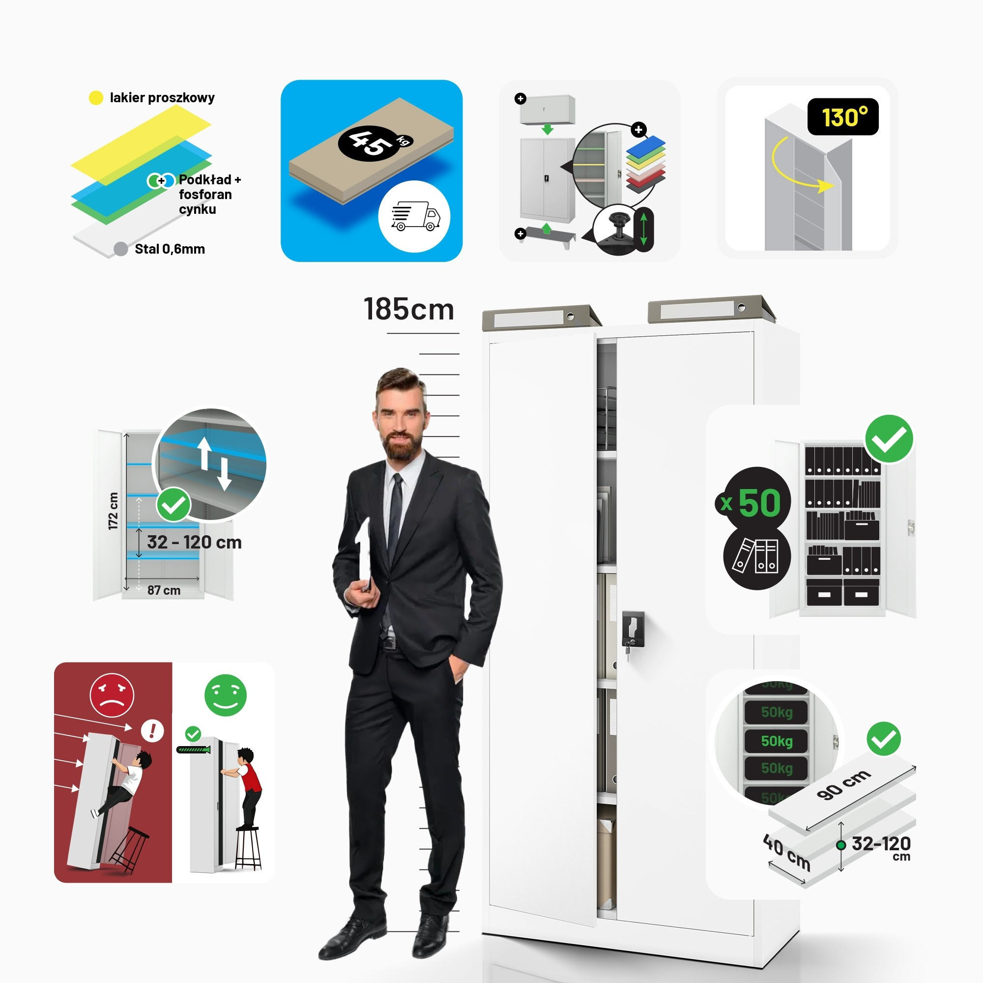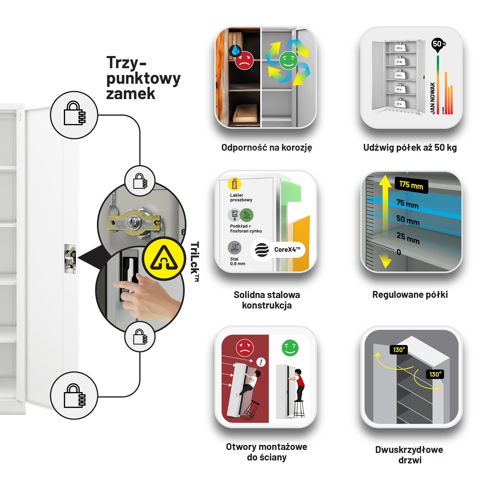 Skříň JAN je vyrobena z kvalitních materiálů a podléhá přísným kontrolám kvality. Můžete se spolehnout na její robustnost, odolnost a dlouhou životnost. Práškové lakování zajišťuje ochranu proti korozi a mechanickému poškození, takže si skříň zachová svůj perfektní vzhled po dlouhá léta.