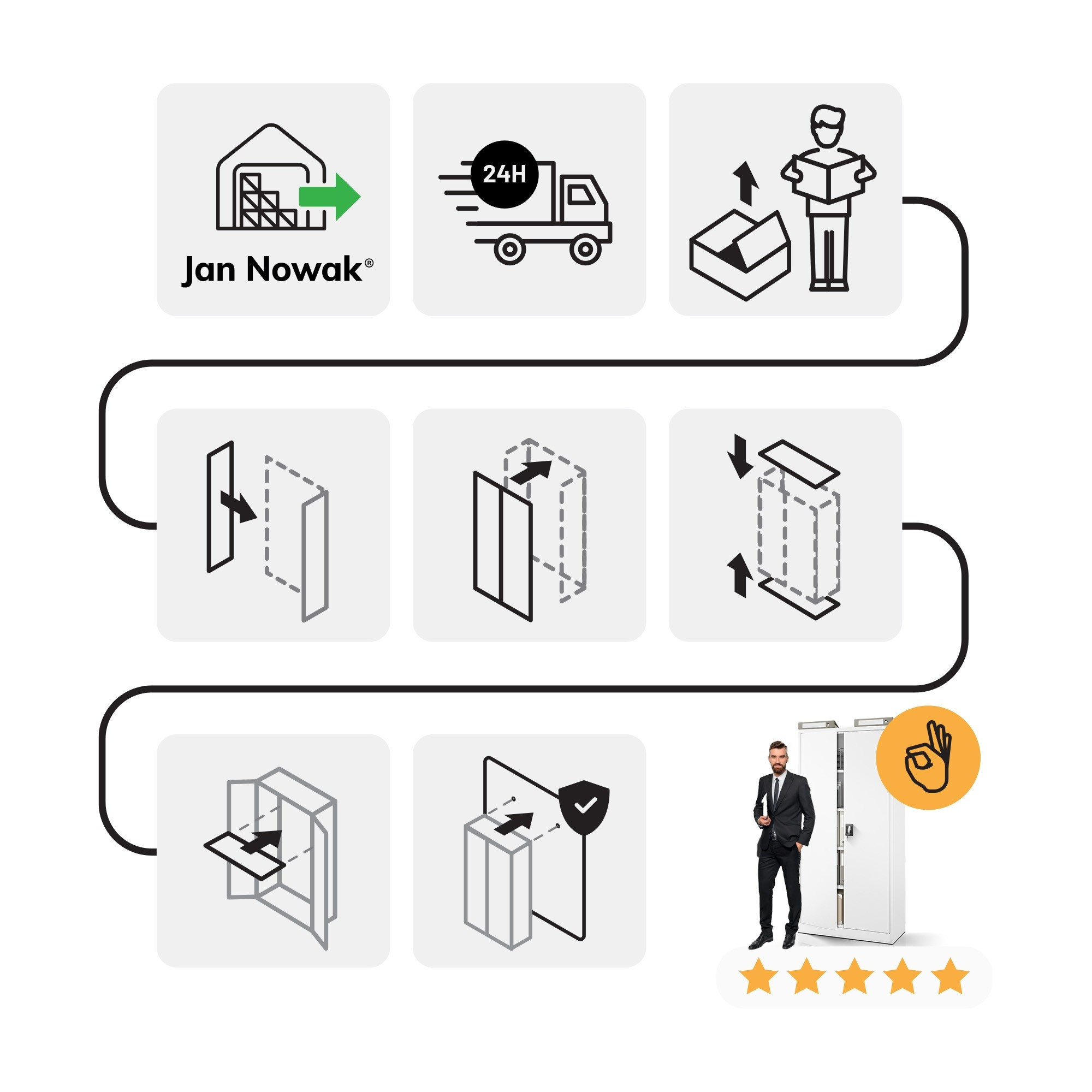 Skříň JAN je dodávána v demontovaném stavu, ale její montáž je velmi jednoduchá a intuitivní. Součástí balení je podrobný návod, který vás krok za krokem provede celým procesem. Během krátké chvíle budete mít skříň připravenou k použití.