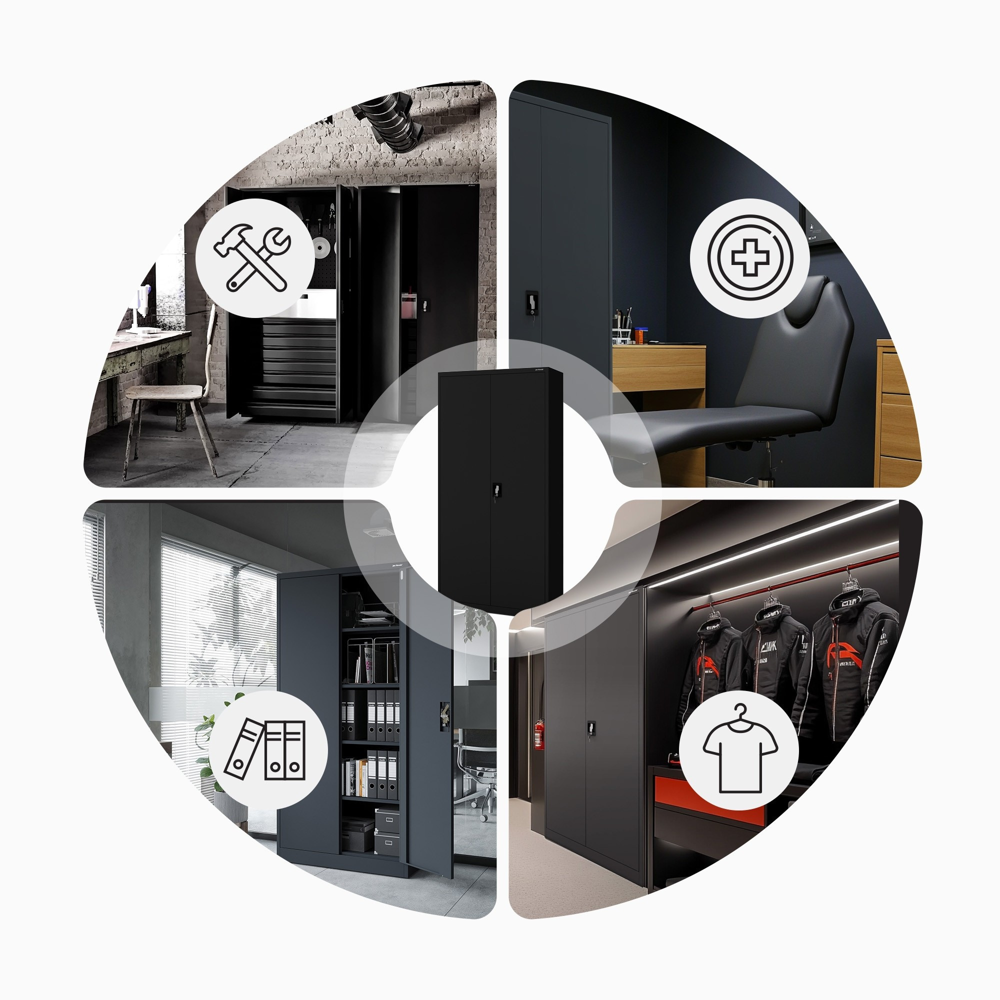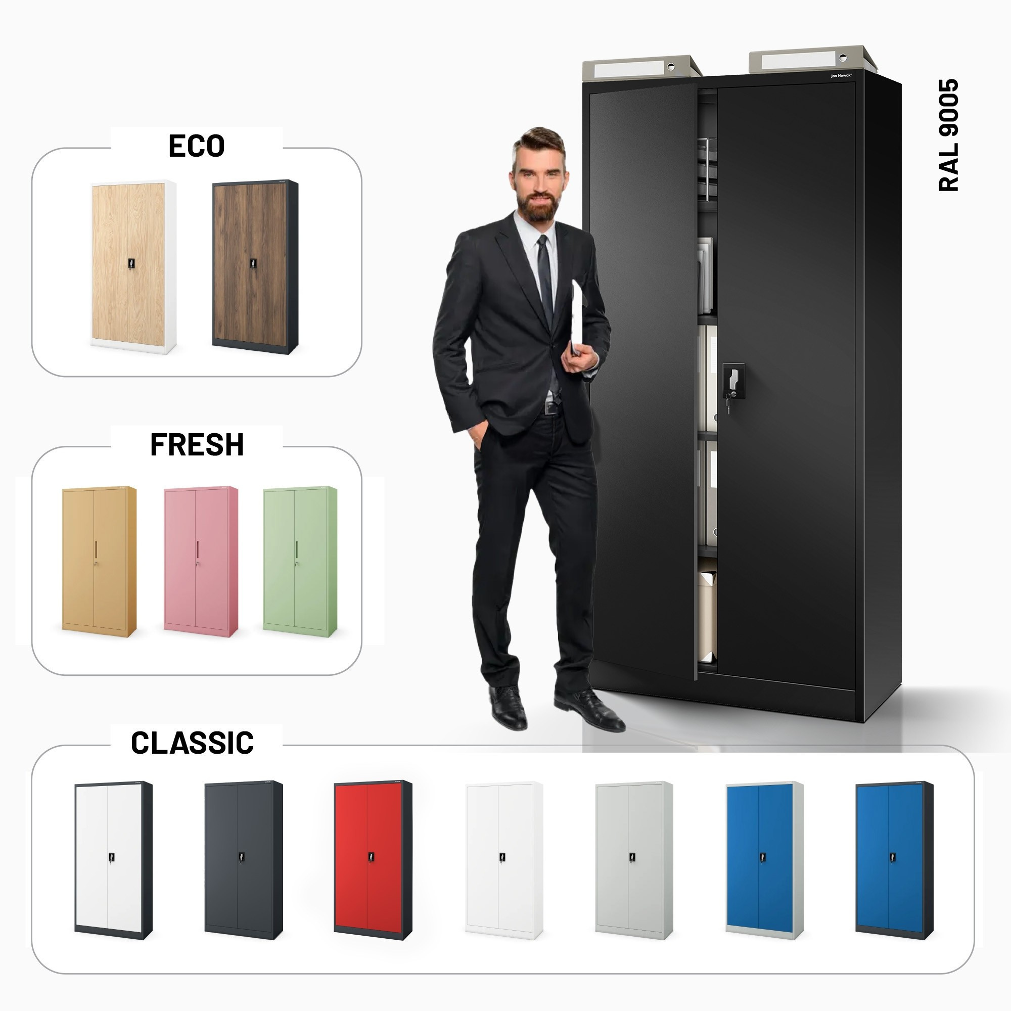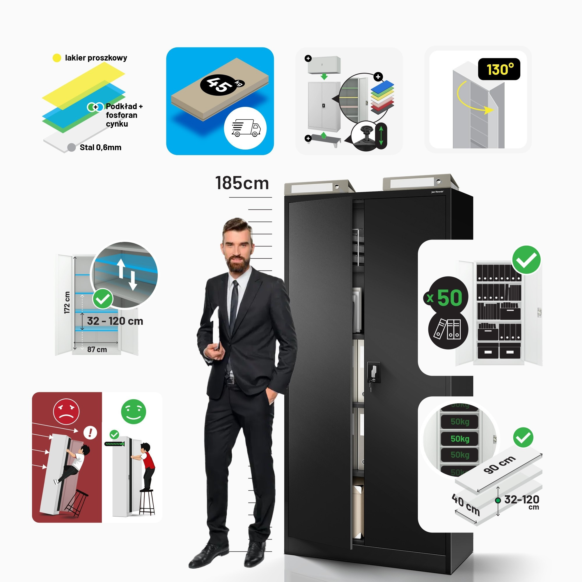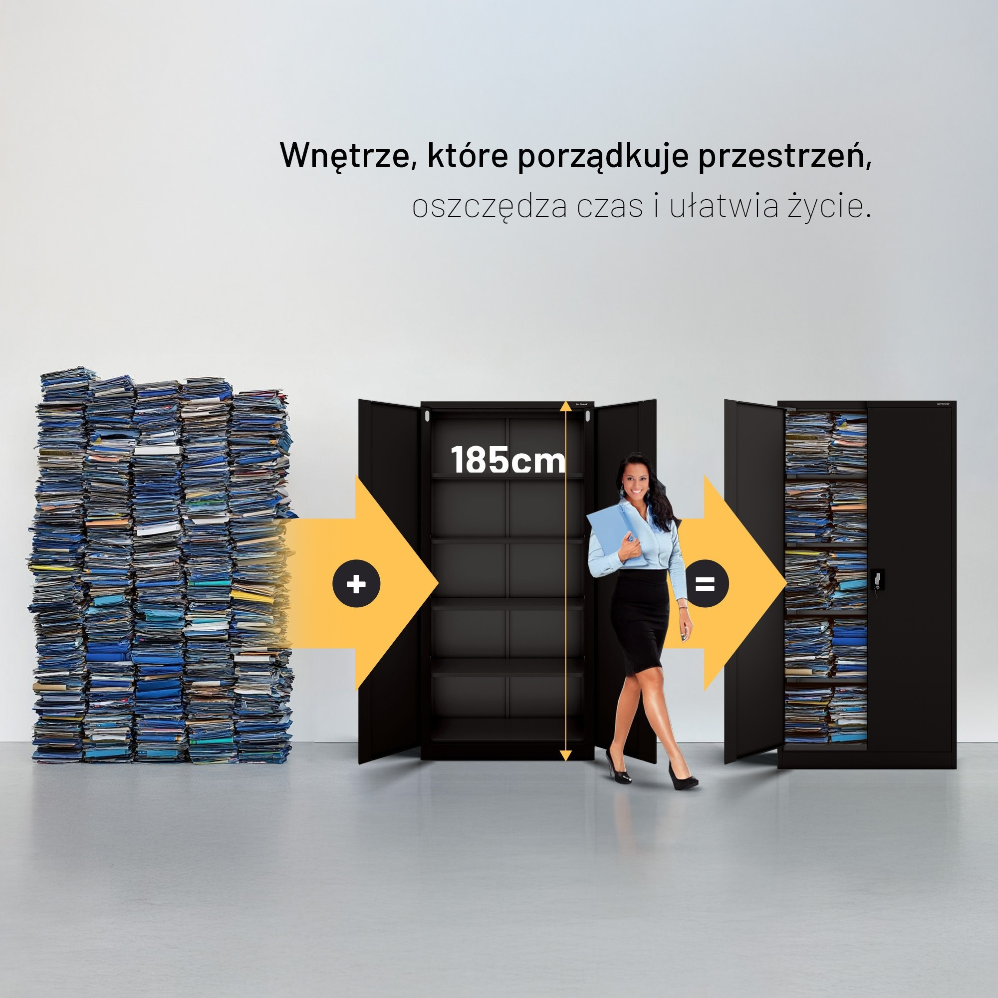 Hledáte spolehlivé a elegantní řešení pro uspořádání dokumentů a vybavení ve vaší kanceláři, ordinaci nebo dílně? Představujeme vám kancelářskou skříň JAN v nadčasové černé barvě (RAL 9005), která se stane nejen praktickým úložným prostorem, ale i stylovým doplňkem vašeho interiéru.