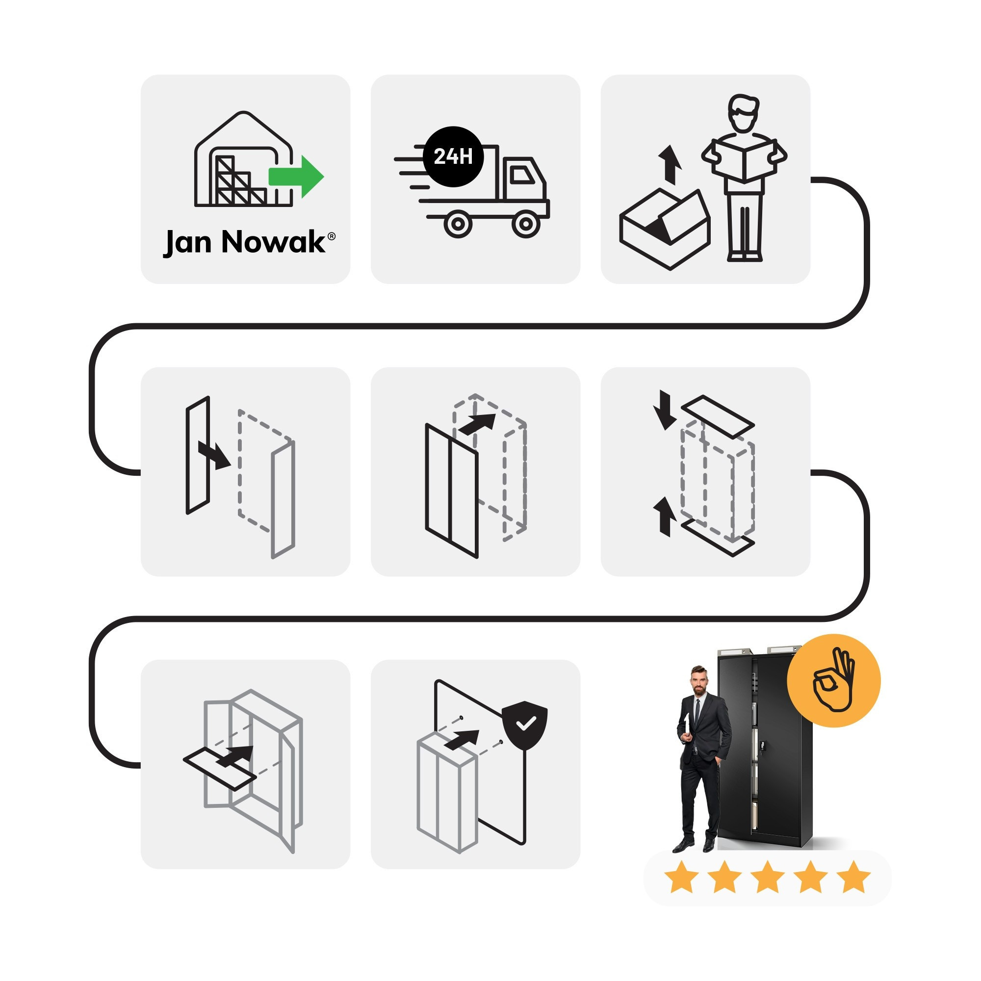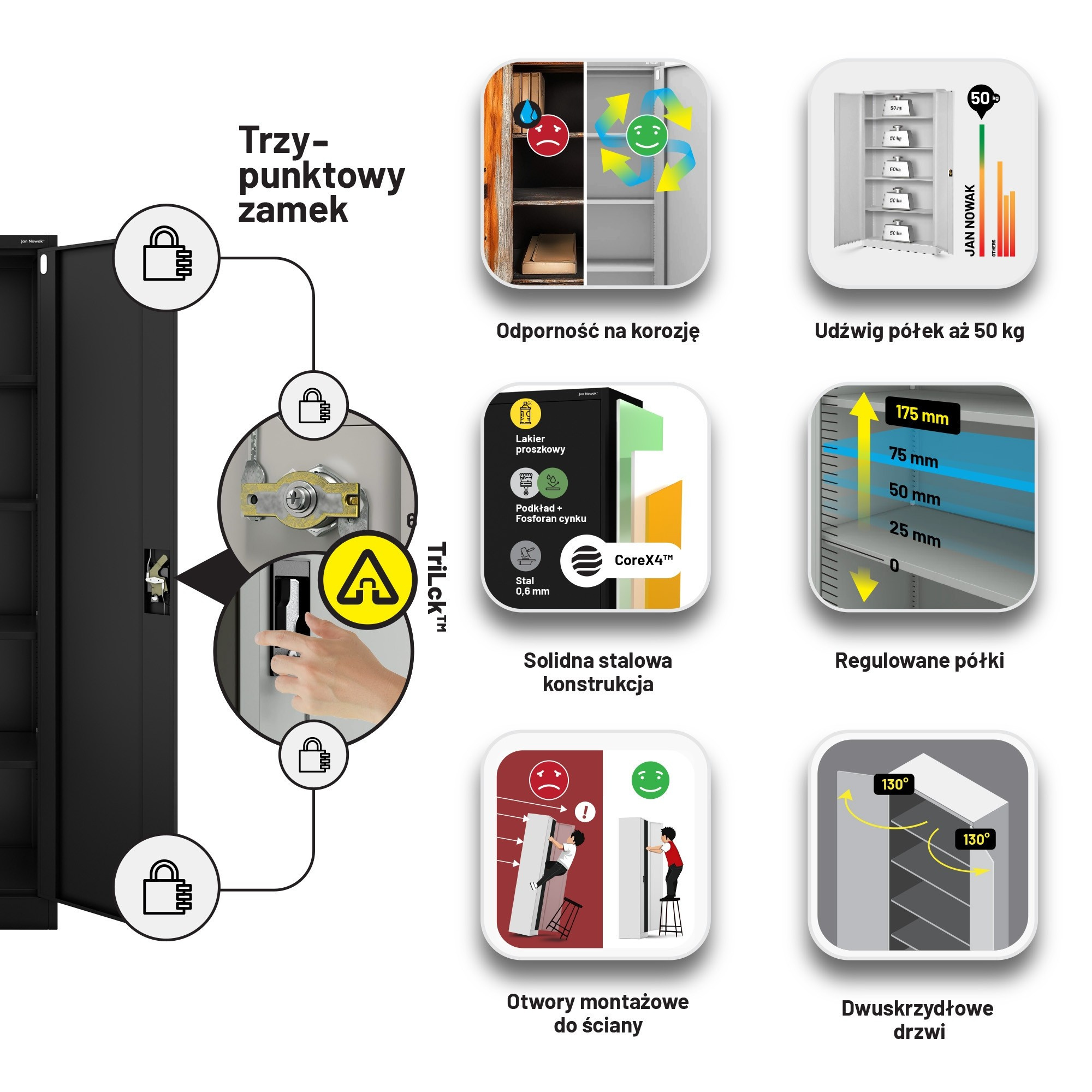 Skříň JAN kombinuje robustní konstrukci, vysokou kapacitu a bezpečnost. Je vyrobena z kvalitní oceli a opatřena práškovým lakem, který zajišťuje dlouhou životnost a odolnost proti poškození. Díky tomu vám bude sloužit spolehlivě po mnoho let.