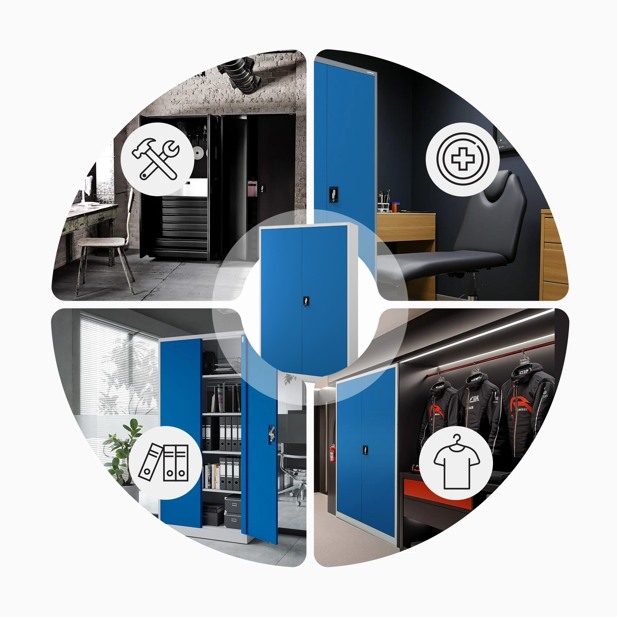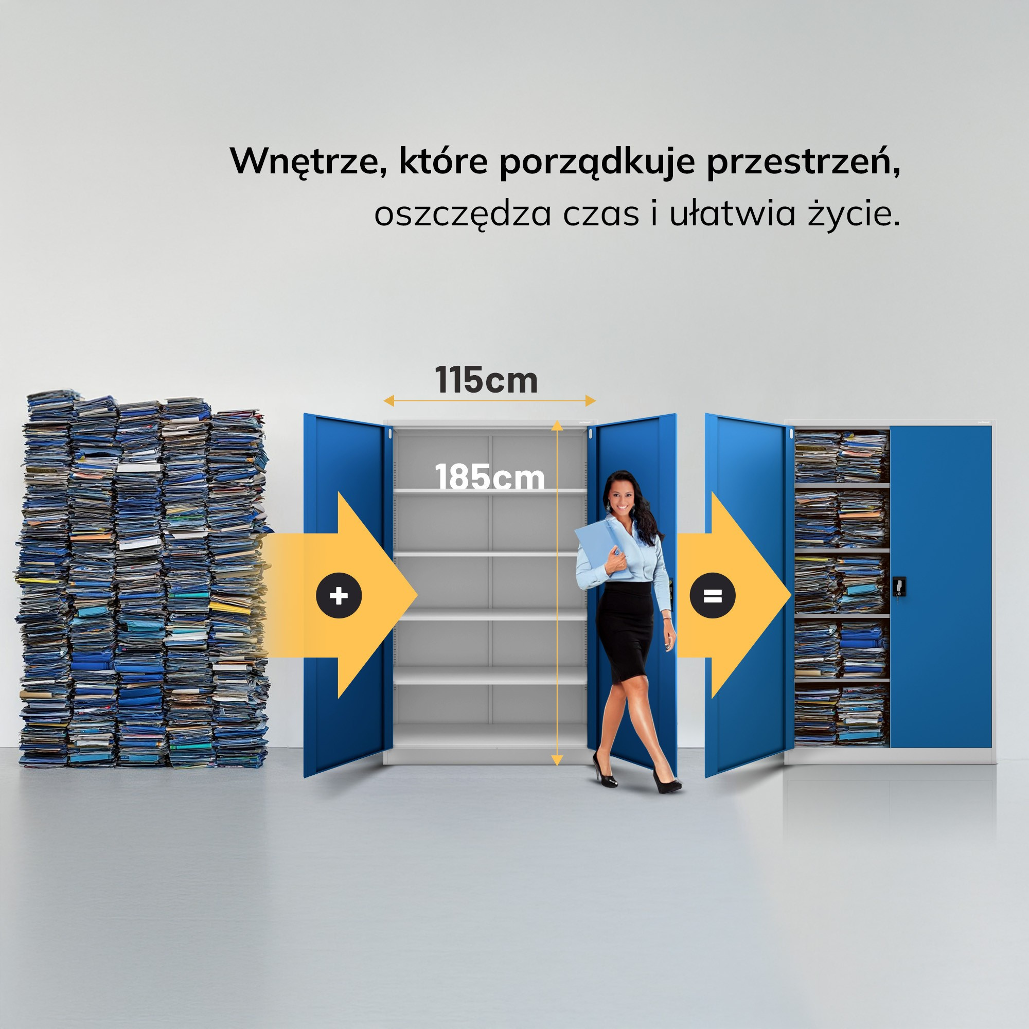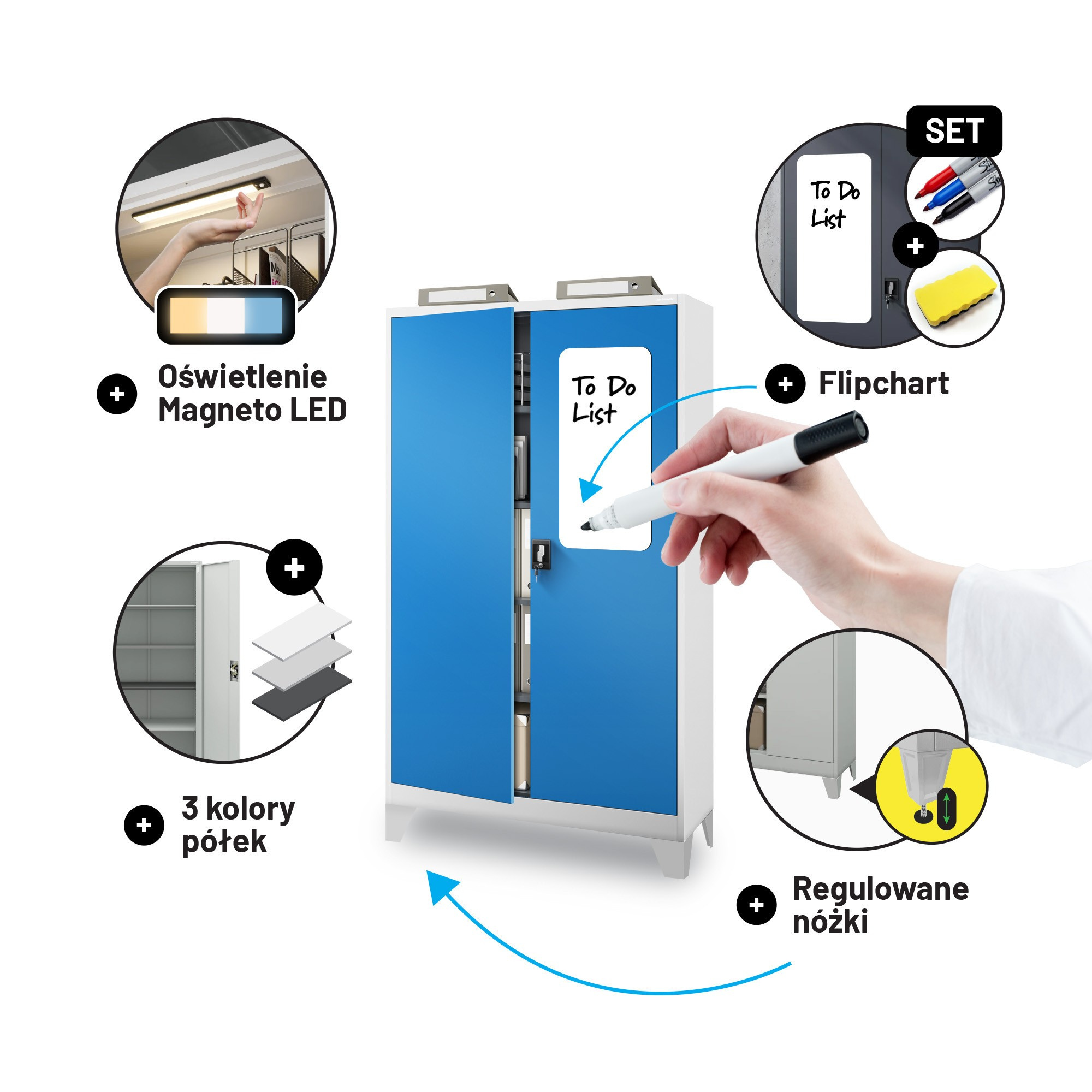 Hledáte spolehlivé a elegantní řešení pro ukládání dokumentů, nářadí nebo léků? Skříň JAN II v šedo-modré barvě je ideální volbou pro kanceláře, zdravotnická zařízení, dílny i moderní domácnosti. Její robustní konstrukce, variabilní uspořádání a stylový design z ní dělají nepostradatelného pomocníka pro organizaci a bezpečné uložení vašich věcí.