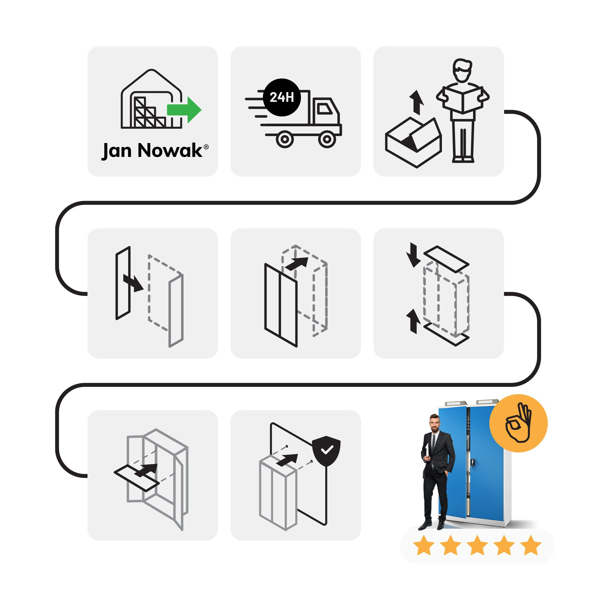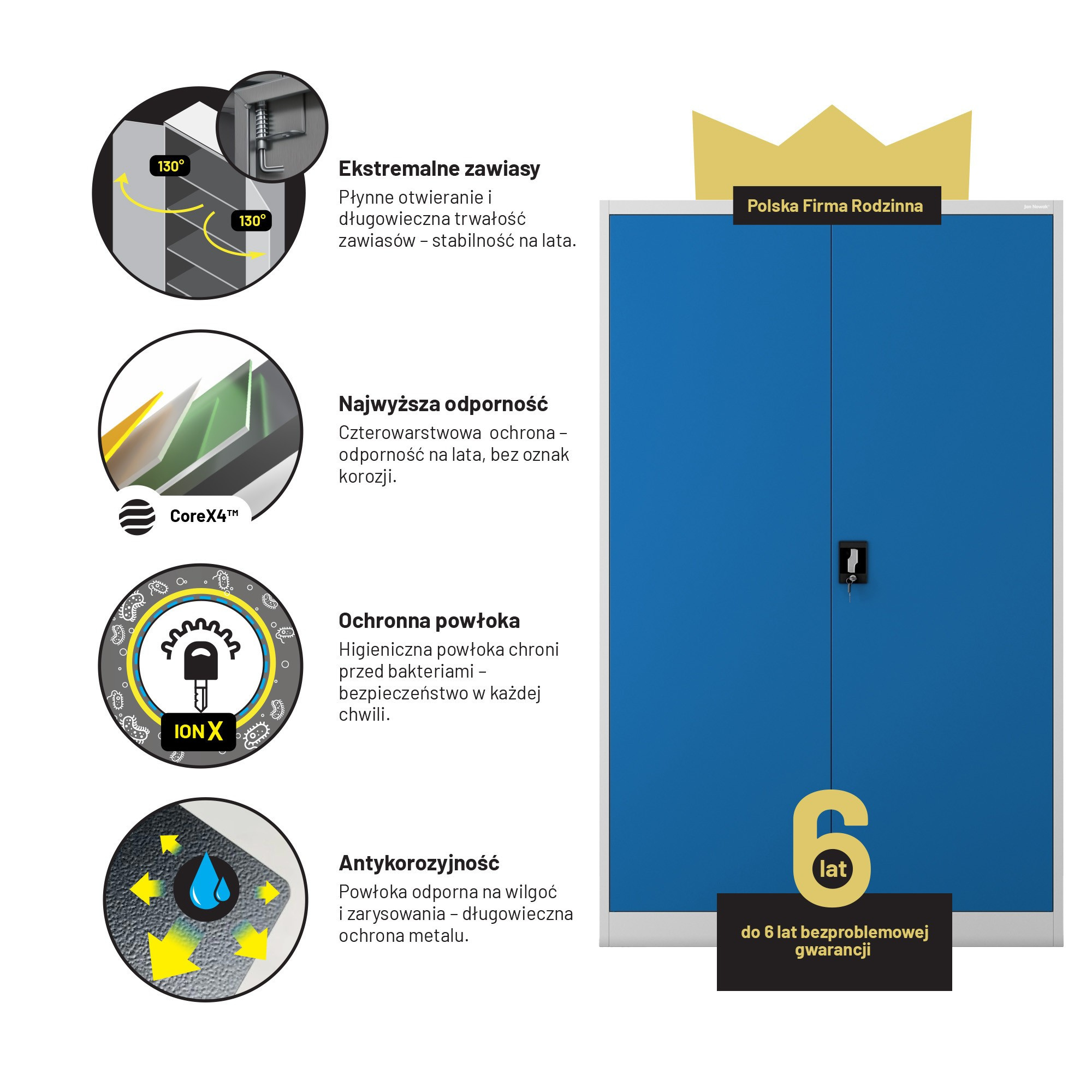 Skříň JAN II je investicí do pořádku, bezpečnosti a efektivity. Je to spolehlivý partner pro vaši kancelář, dílnu, zdravotnické zařízení i domácnost. Objednejte si ji ještě dnes a užijte si dokonalý úložný prostor!