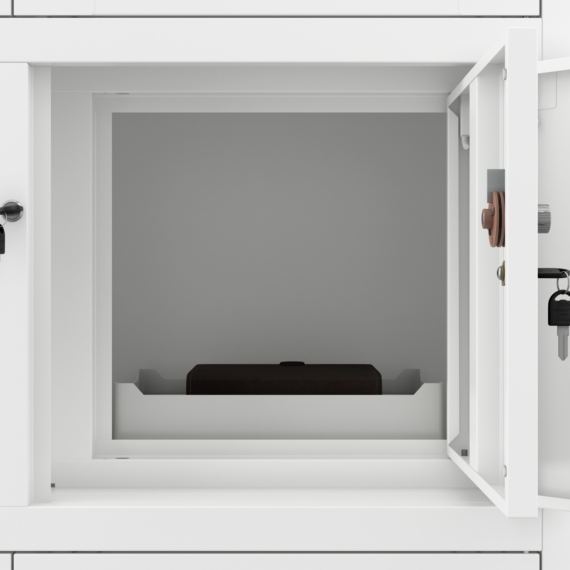 - Samostatně uzamykatelnými moduly: Prosklená vitrína, tři zásuvky, trezor a skříňka – každý modul je chráněn samostatným zámkem.