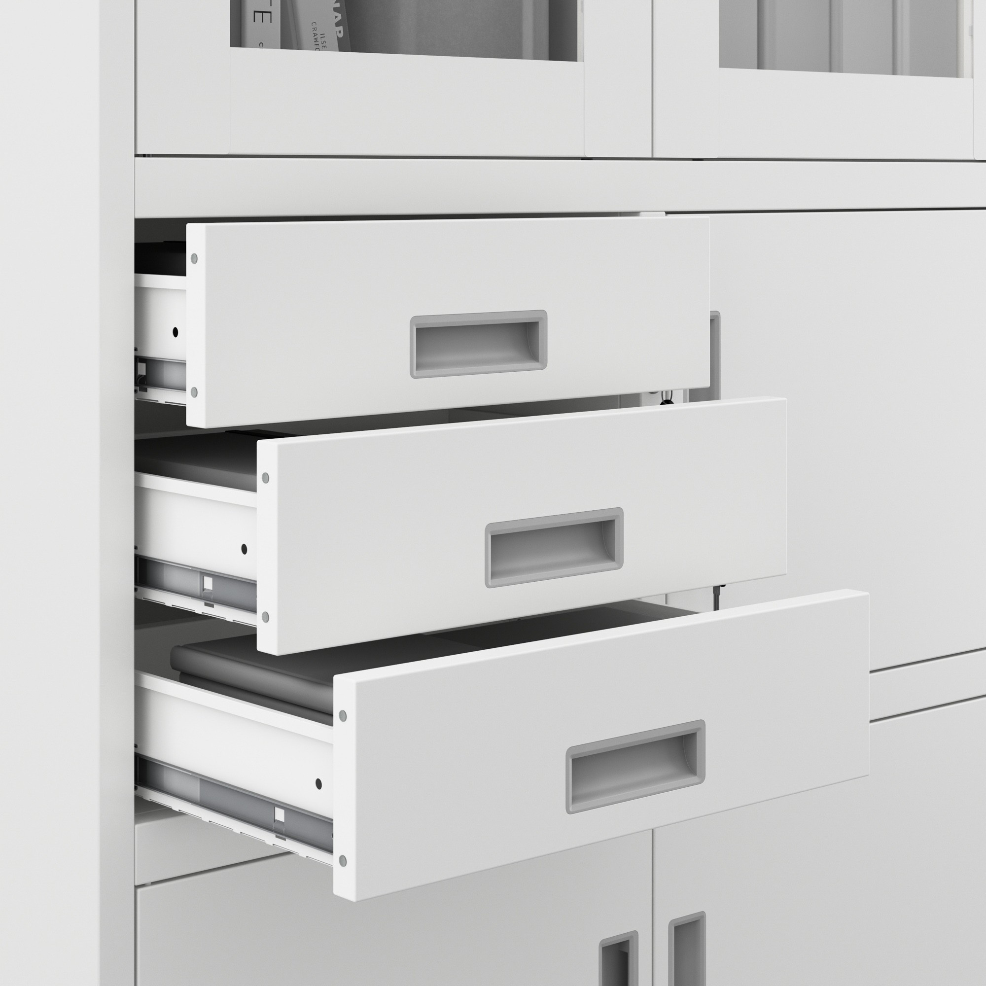 - Prostorné zásuvky a vitrína: Pro přehledné uspořádání.
