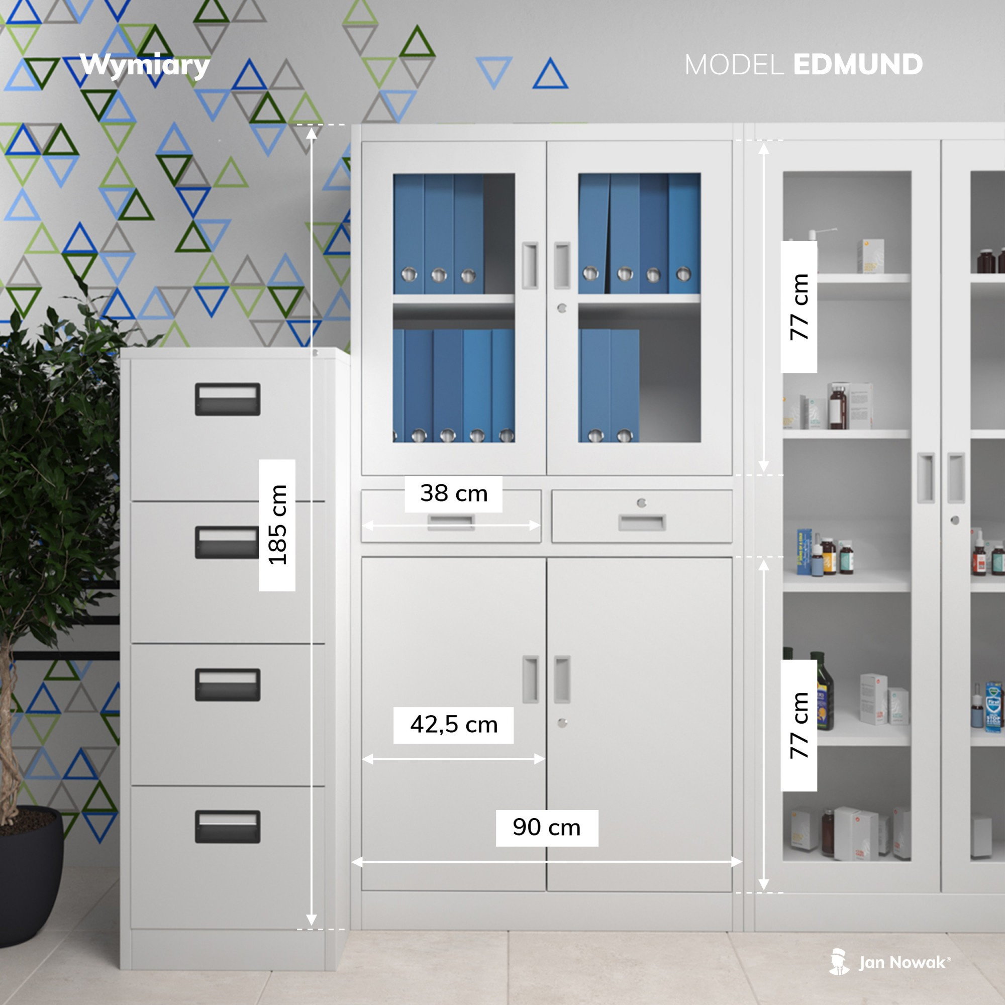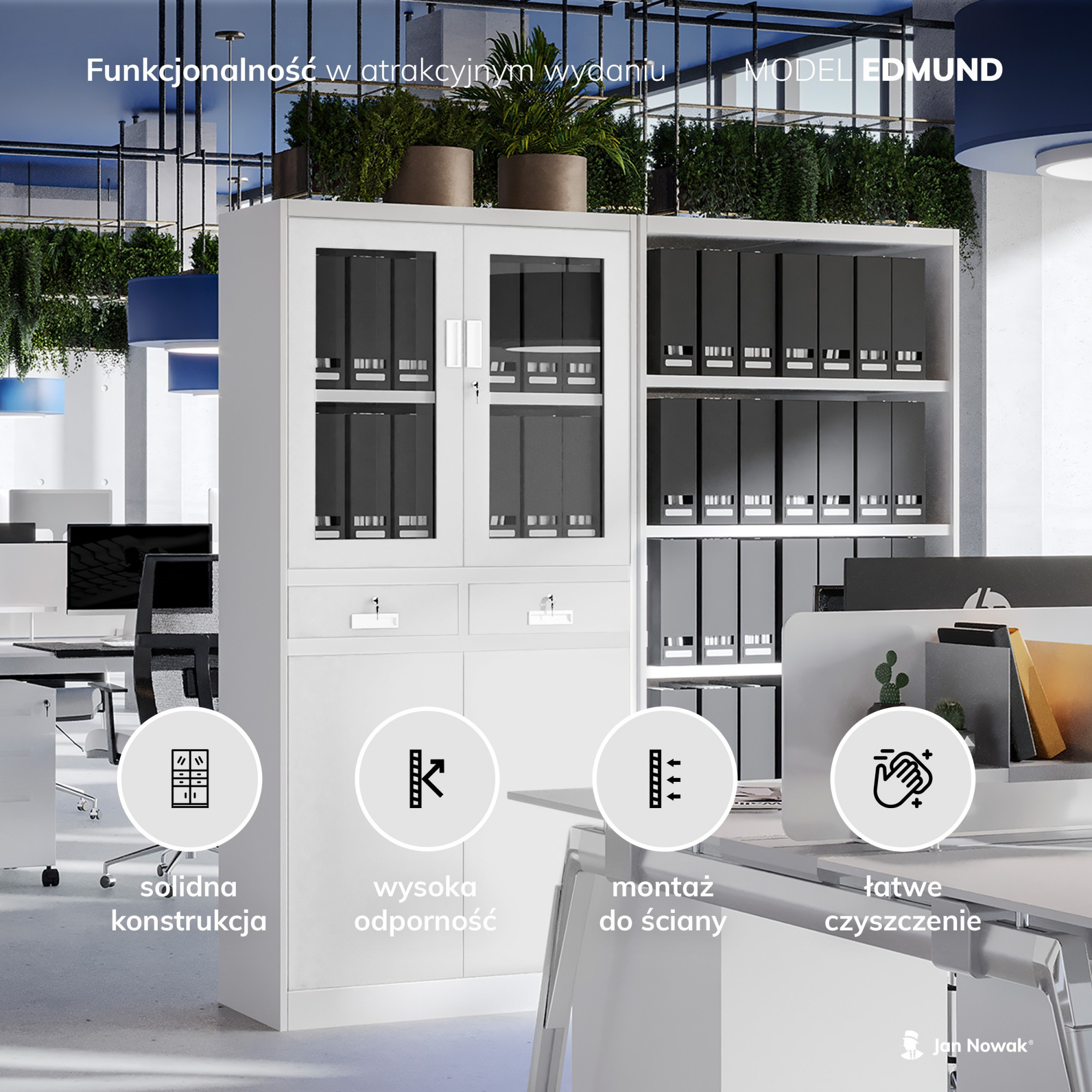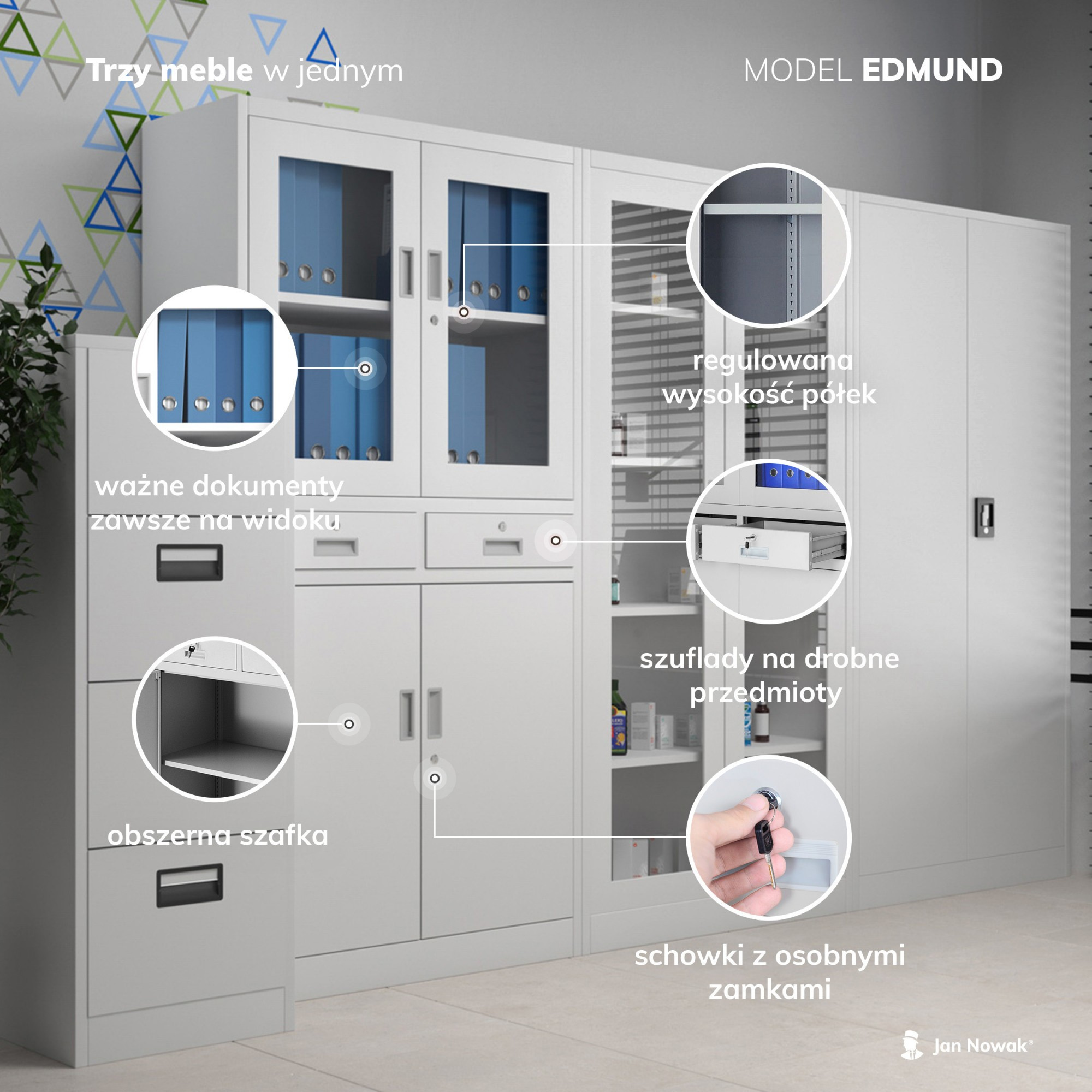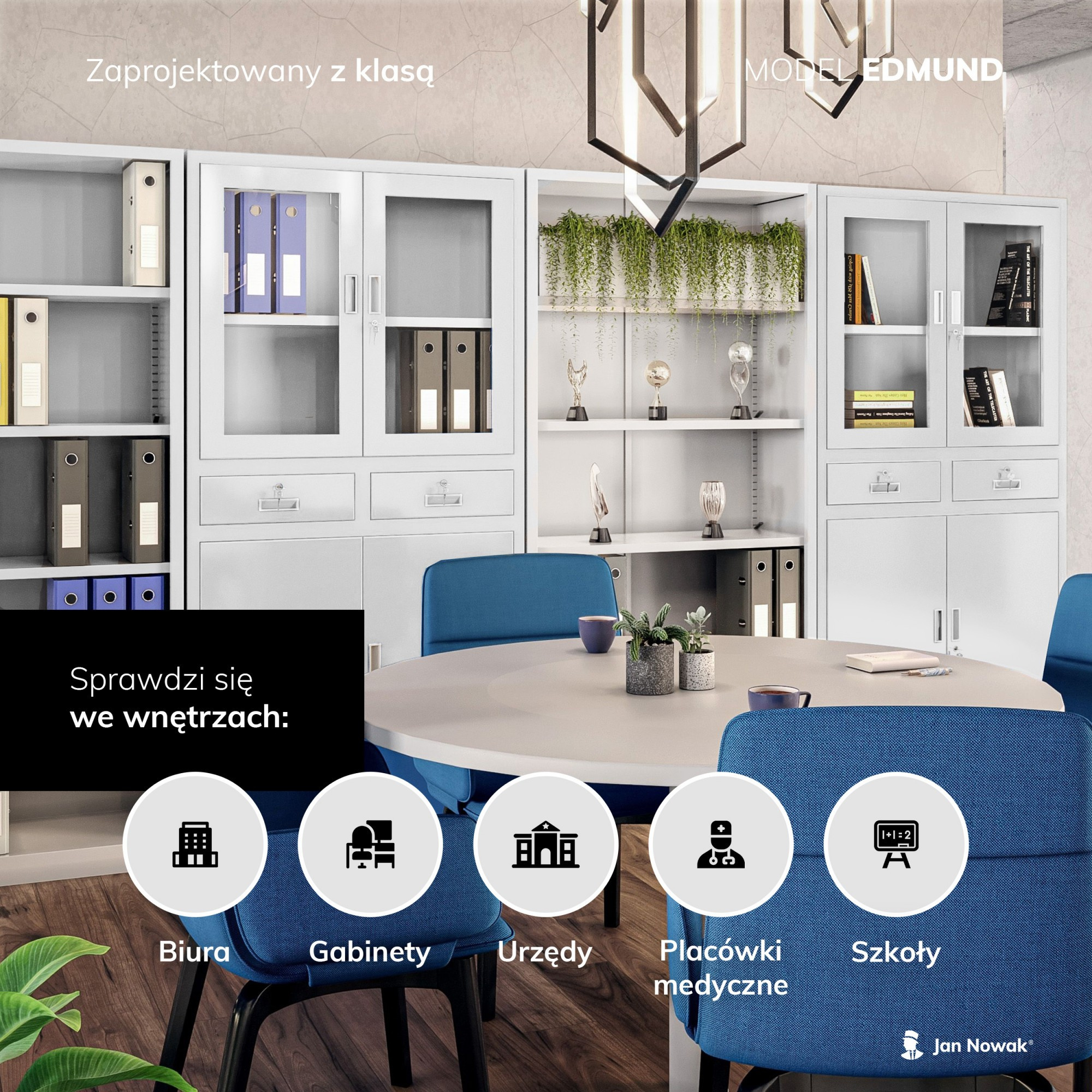 Skříň EDMUND kombinuje klasický styl a moderní prvky, což z ní činí elegantní a funkční doplněk každé kanceláře. Její šedá barva se snadno kombinuje s ostatním nábytkem a interiérovými prvky. Skříň EDMUND dodá vaší kanceláři profesionální a reprezentativní vzhled.