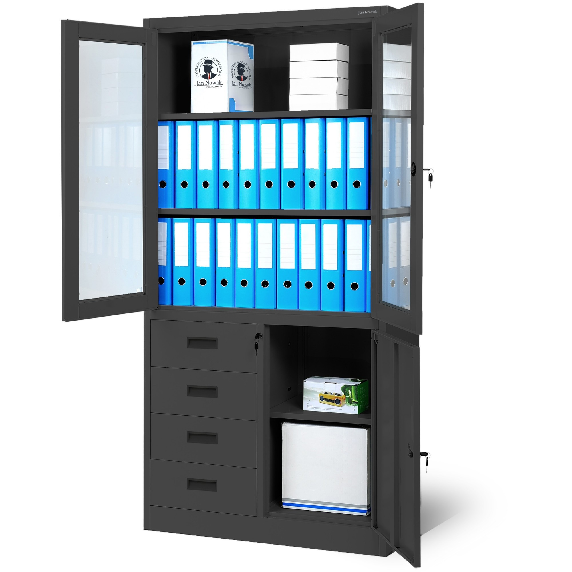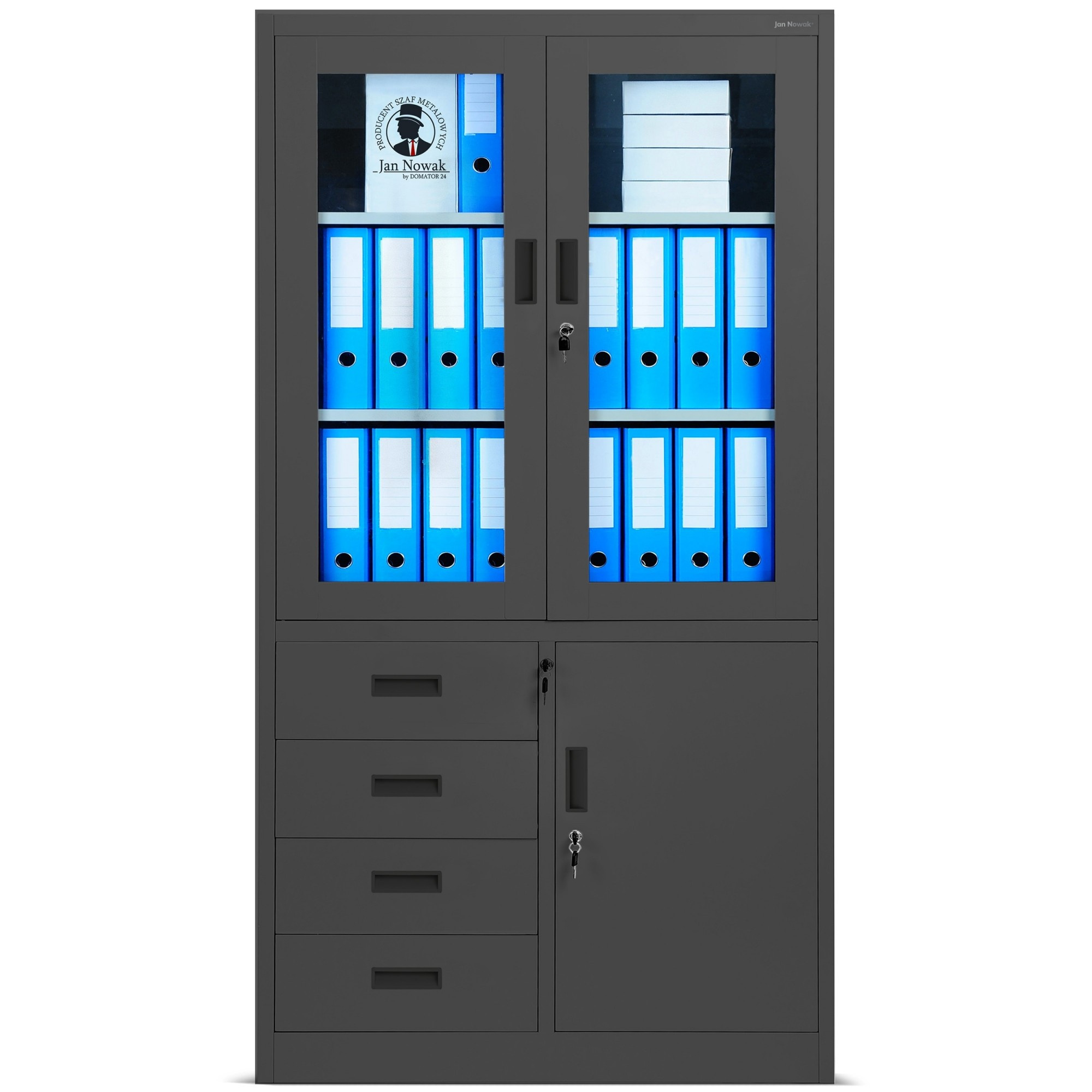 Kancelářská prosklená kovová skříň na dokumenty se zásuvkami WIOLA, 900 x 1850 x 400 mm, antracitová