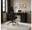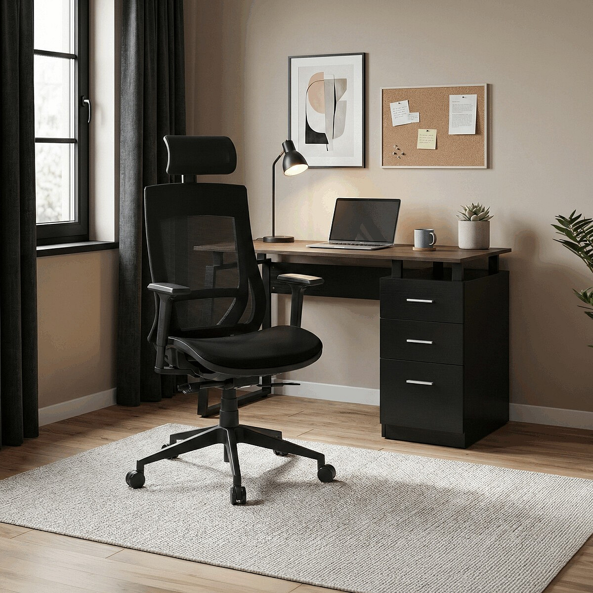 Kancelářská židle v černé síťovině nabízí moderní ergonomii a komfort pro dlouhé hodiny práce. Opěradlo je vybaveno pevnou bederní opěrkou a výškově nastavitelnou hlavovou opěrkou, která podporuje správné držení hlavy a krční páteře. Sedák s posuvným mechanismem umožňuje individuální nastavení hloubky sedu pro maximální pohodlí. Synchronní mechanika umožňuje aretaci opěradla ve více polohách, což zvyšuje flexibilitu sezení. Výškově stavitelné jednosměrné područky přispívají k ergonomickému držení paží, zatímco plastový kříž s kolečky je určený pro tvrdé podlahy a zajišťuje stabilitu i snadnou mobilitu.