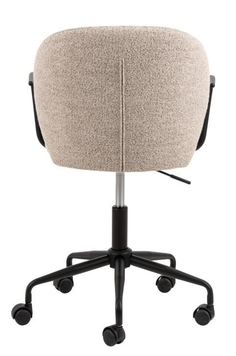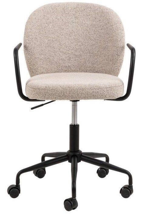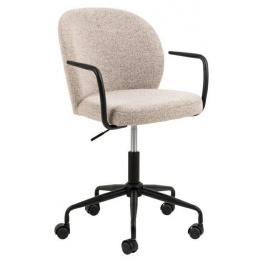 Vyznačující se sofistikovaným vzhledem, kancelářská židle má zaoblené opěradlo, trubkové černé područky a měkké béžové čalounění typu bouclé. Podporované na 5-hvězdičkové otočné základně s kolečky s měkkou brzdou a plynovým pístem, křeslo umožňuje plynulý pohyb a snadné nastavení výšky. Židle byla navržena s ohledem na zvýšení standardu domácího pracovního místa. Židle k psacímu stolu s nastavitelnou výškou a područkami. Čalouněné texturovaným béžovým materiálem připomínajícím bouclé. Plynový píst, otočná funkce a kolečka s měkkou brzdou. Plynový píst umožňuje nastavení výšky sedadla v rozmezí 45-55 cm. 5hvězdičková ocelová základna lakovaná práškově na černo. Kolečka s brzdou pro bezpečnost a otočná funkce pro snadné přemísťování. Šířka sedáku: 47 cm Hloubka sedáku: 45 cm Výška opěradla: 39,5 cm Vyžaduje montáž. Maximální zatížení 110 kg. Hmotnost křesla: 9,7 kg Rozměry kartonu: 62x59x52 cm