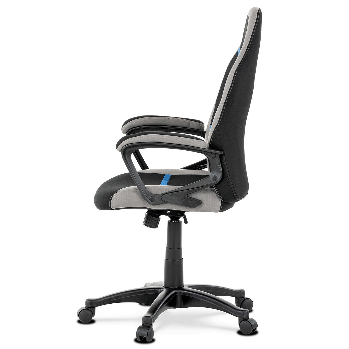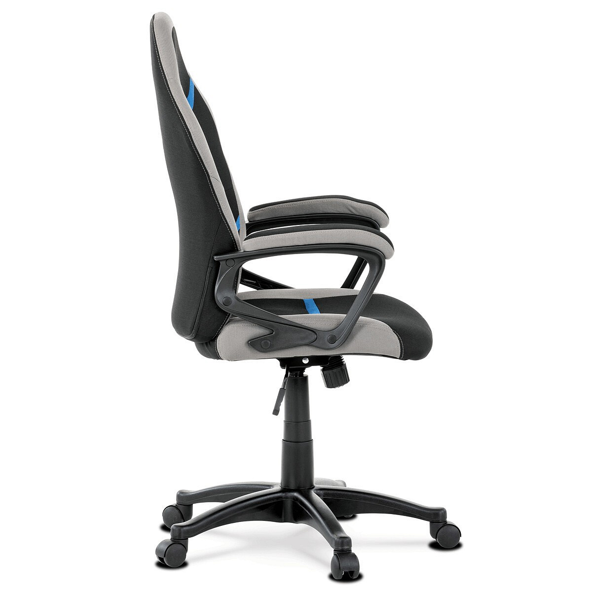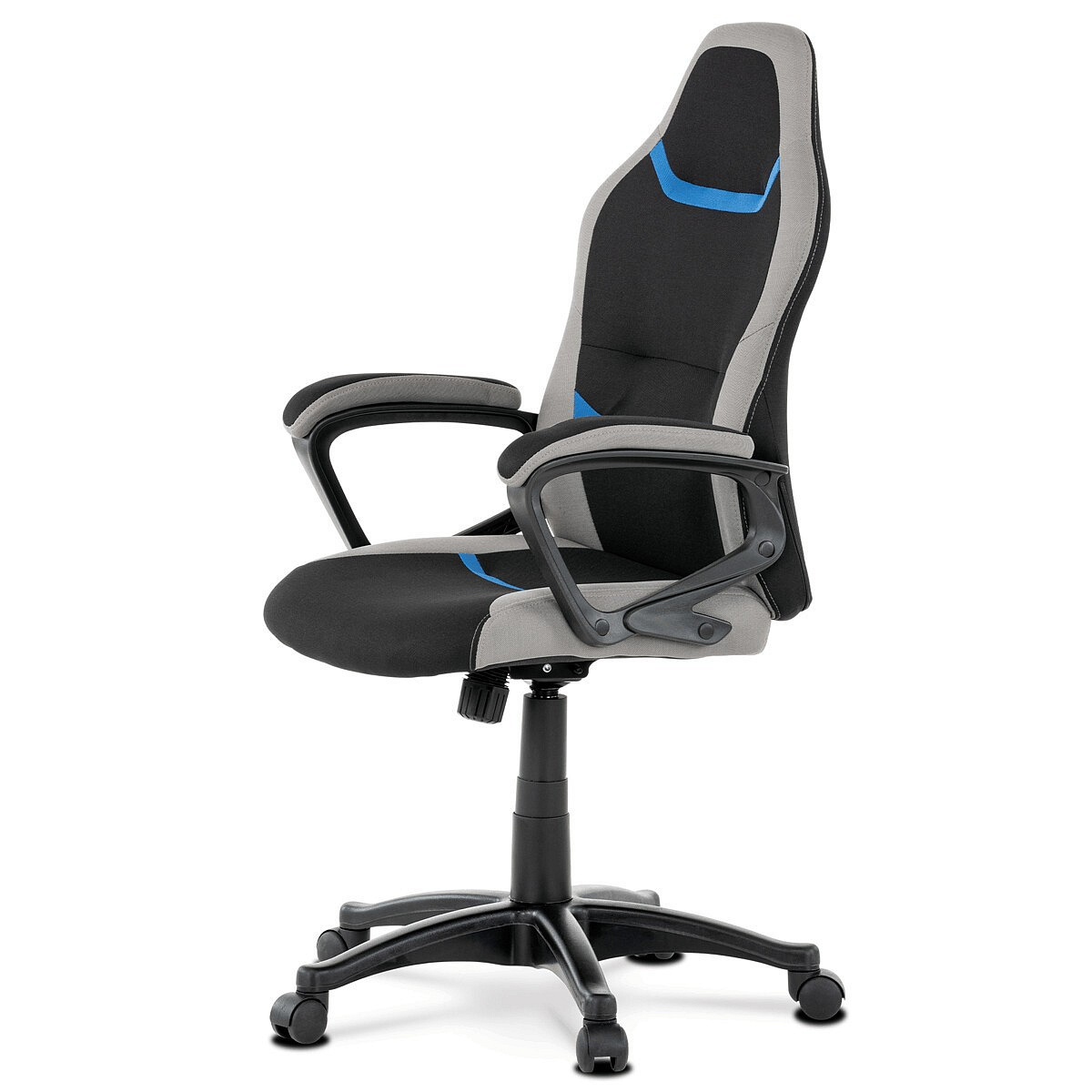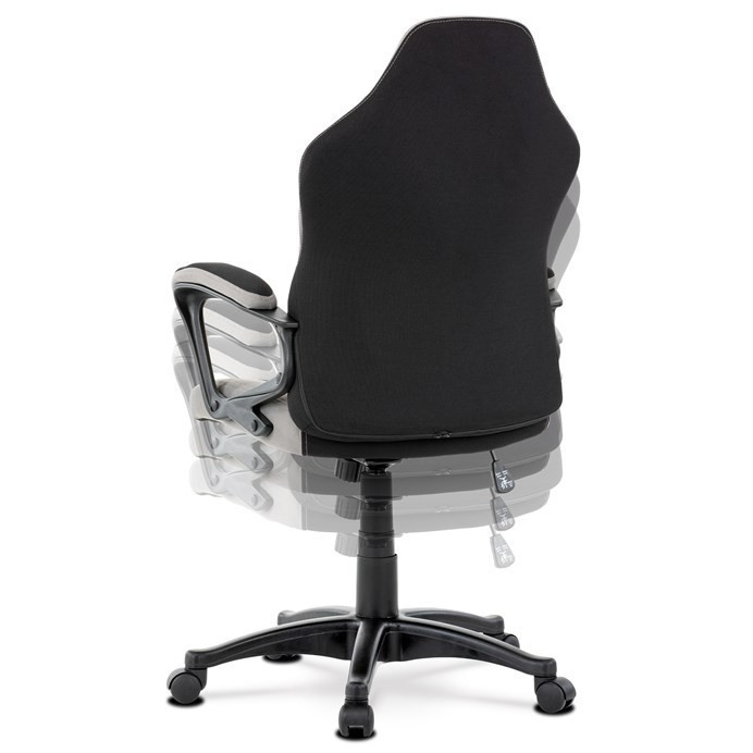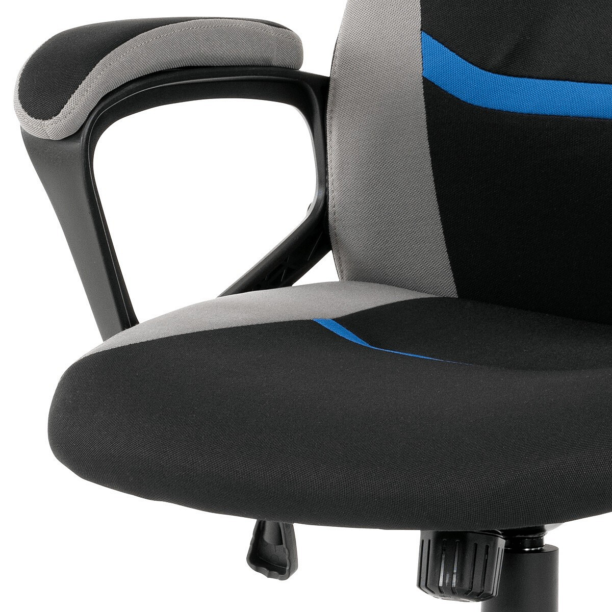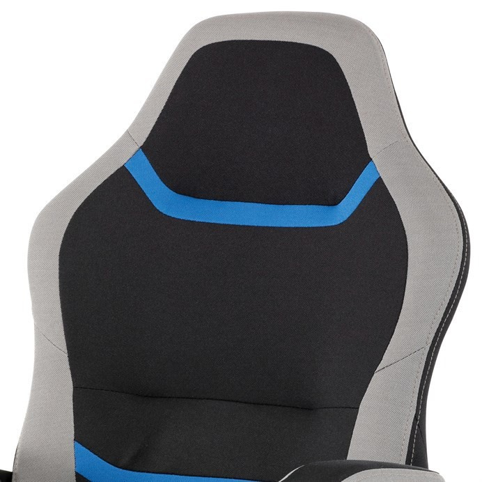 Elegantní kancelářská i herní židle se zaoblenými liniemi, obvodovým prošitím v šedé barvě a výrazným tvarovým prošitím sedáku i opěráku. Potah je kombinací černé a světle šedé látky hladké látky s decentním modrým detailem na opěráku i sedáku. Polstrování je z kvalitní PU pěny. Židle je vybavena houpacím mechanismem s nastavením protiváhy a aretací v základní poloze. Tuhost protiváhy lze regulovat velkým plastovým šroubem, umístěným pod sedákem. Výška sezení se upravuje páčkou na pravé straně přes kvalitní plynový píst. Znavené ruce si velice pohodlně položíte na plastové područky, na ložné ploše polstrované černou a šedou látkou. Šíře područek je úžasných 7,5 cm, ložná plocha 31 cm a výška 3 cm. Opěrák je vyšší, částečně prodyšný a s integrovanou statickou opěrkou hlavy. Zvýšené okraje sedáku i opěráku podporují správné držení těla i páteře a slouží jako výborná opora. Kříž je černý plastový o průměru je 65 cm, což zajišťuje výbornou stabilitu i u fyzicky náročnějších her. Kolečka jsou plastová pr. 5 cm. Nosnost židle je až 120 kg.