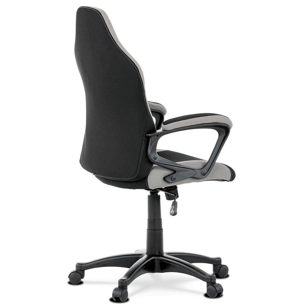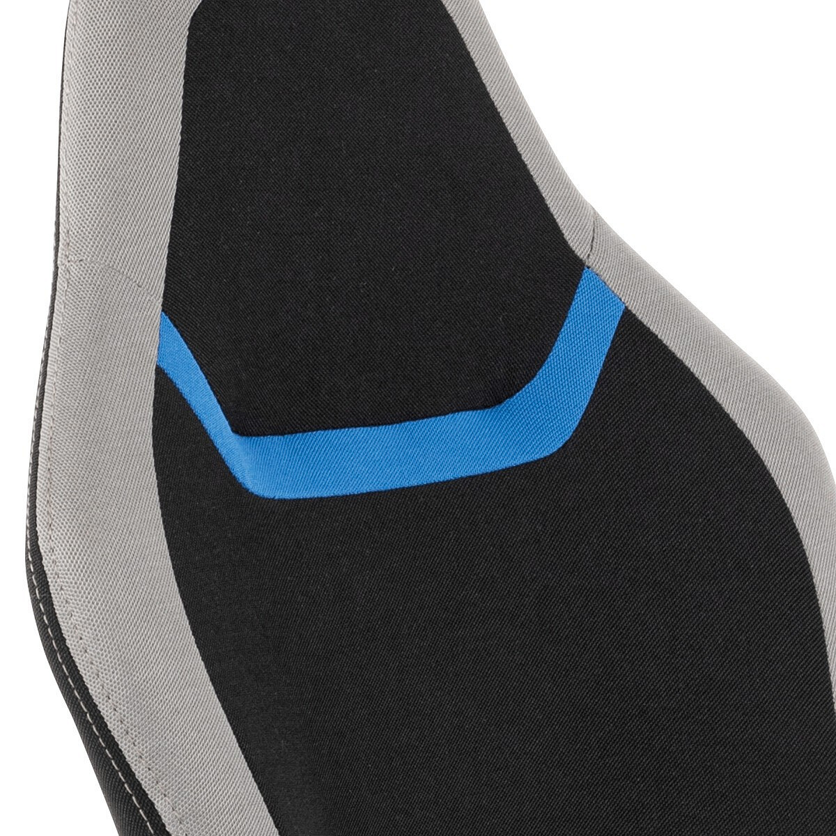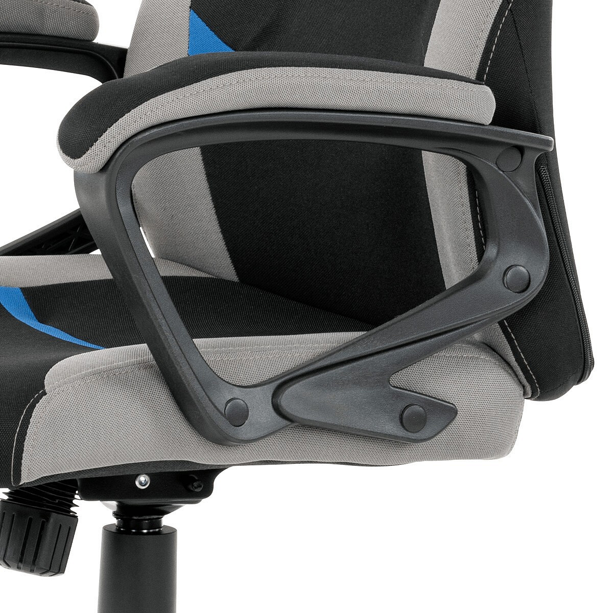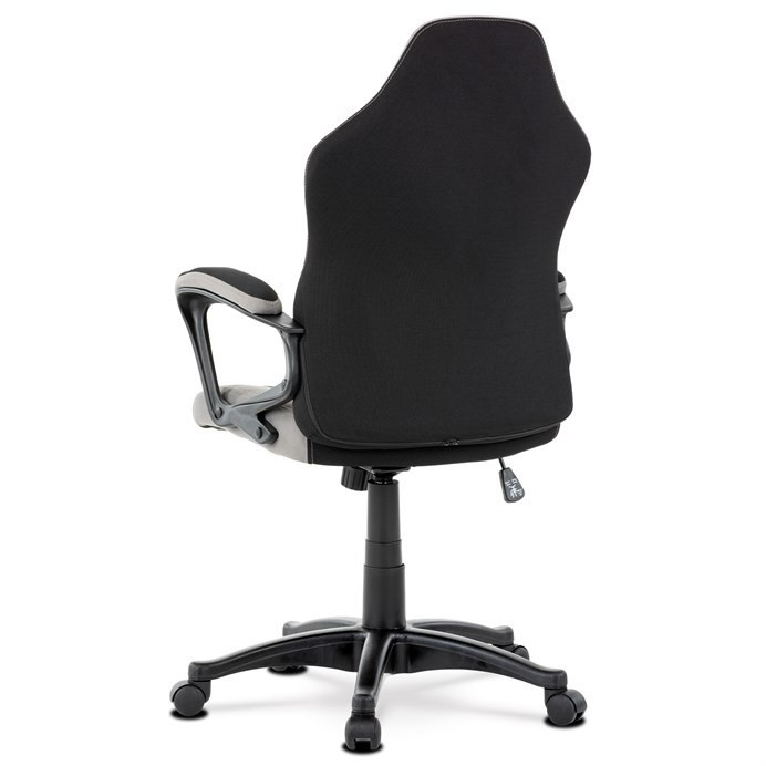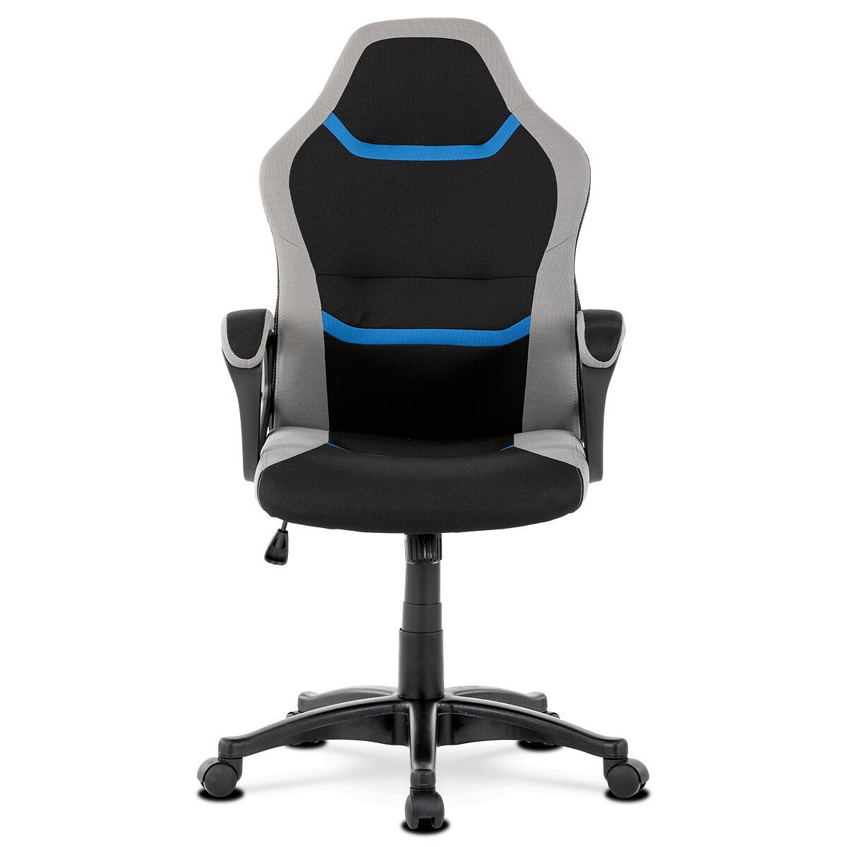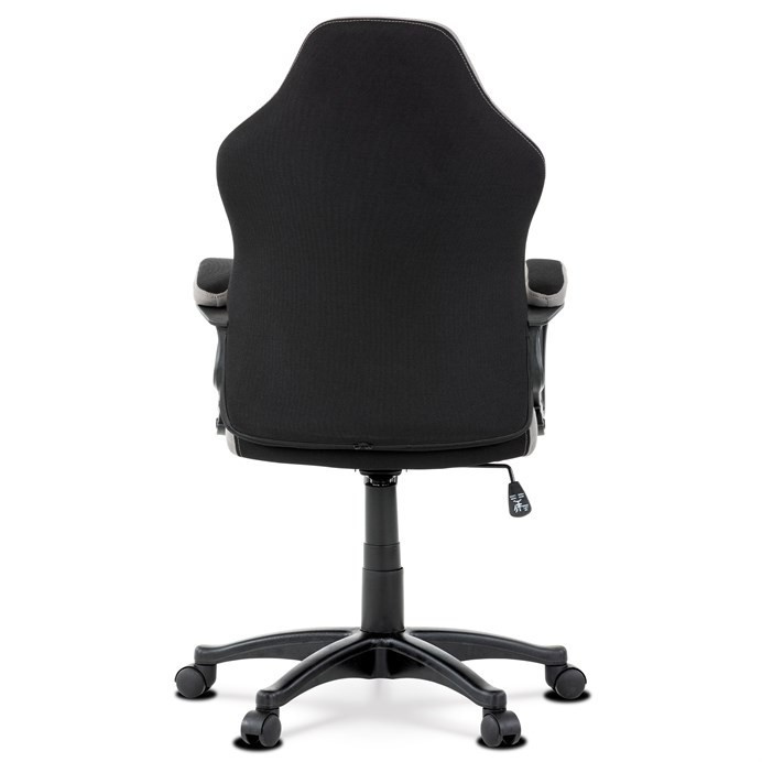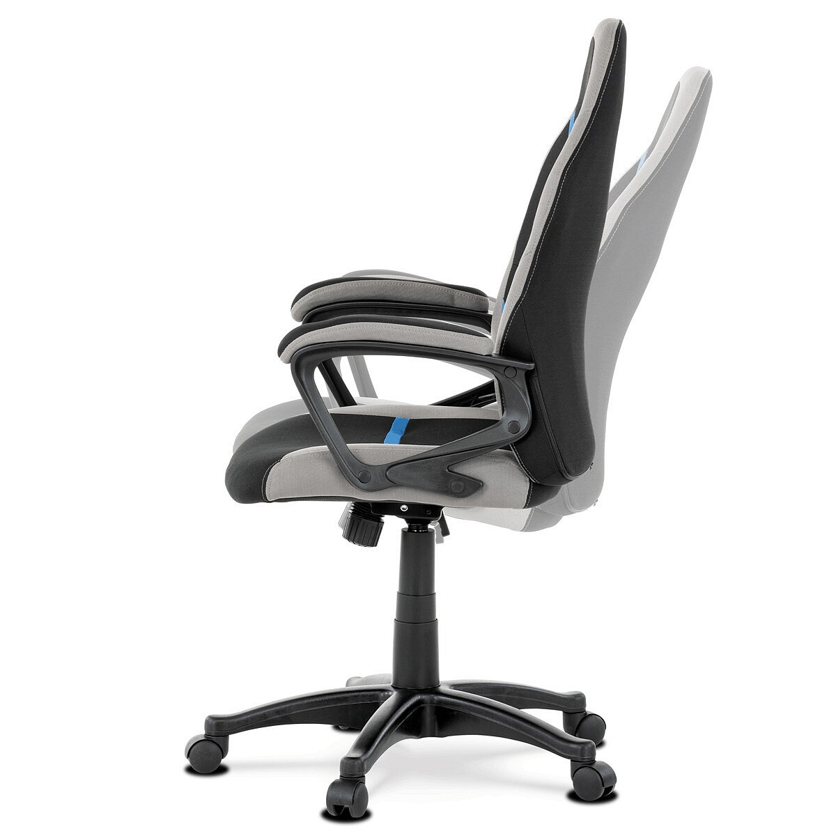 Elegantní kancelářská i herní židle se zaoblenými liniemi, obvodovým prošitím v šedé barvě a výrazným tvarovým prošitím sedáku i opěráku. Potah je kombinací černé a světle šedé látky hladké látky s decentním modrým detailem na opěráku i sedáku. Polstrování je z kvalitní PU pěny. Židle je vybavena houpacím mechanismem s nastavením protiváhy a aretací v základní poloze. Tuhost protiváhy lze regulovat velkým plastovým šroubem, umístěným pod sedákem. Výška sezení se upravuje páčkou na pravé straně přes kvalitní plynový píst. Znavené ruce si velice pohodlně položíte na plastové područky, na ložné ploše polstrované černou a šedou látkou. Šíře područek je úžasných 7,5 cm, ložná plocha 31 cm a výška 3 cm. Opěrák je vyšší, částečně prodyšný a s integrovanou statickou opěrkou hlavy. Zvýšené okraje sedáku i opěráku podporují správné držení těla i páteře a slouží jako výborná opora. Kříž je černý plastový o průměru je 65 cm, což zajišťuje výbornou stabilitu i u fyzicky náročnějších her. Kolečka jsou plastová pr. 5 cm. Nosnost židle je až 120 kg.