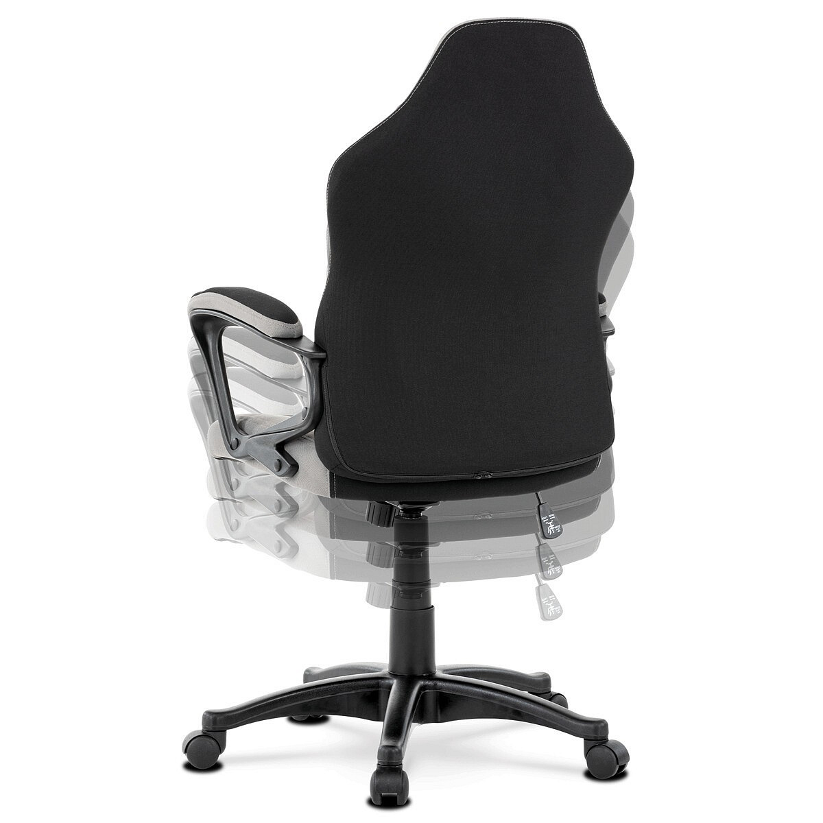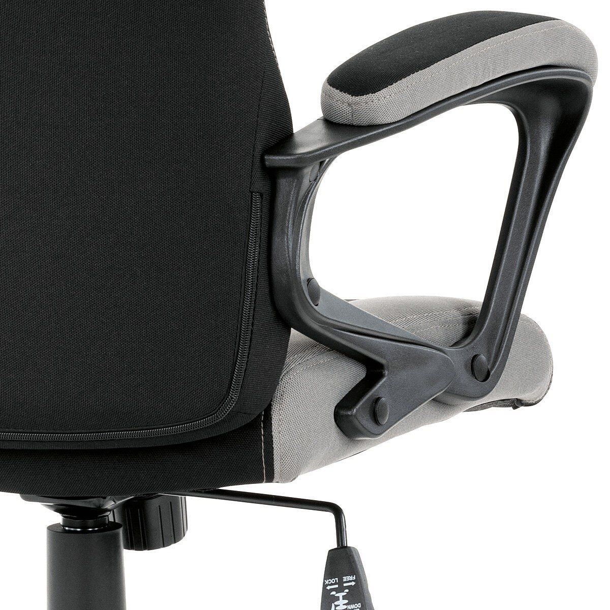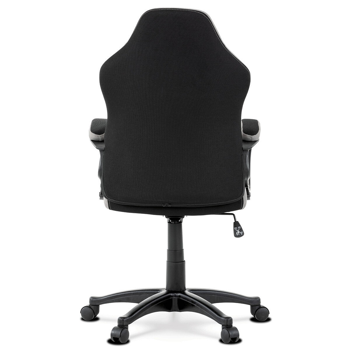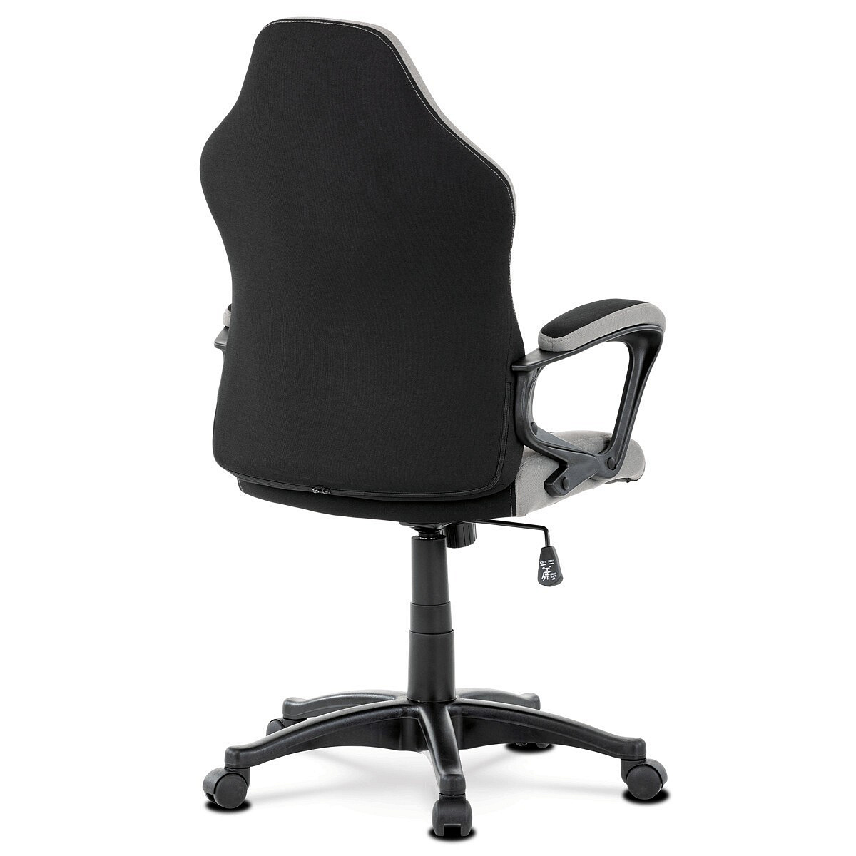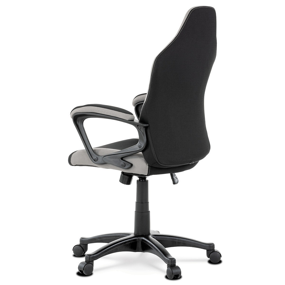 Elegantní kancelářská i herní židle se zaoblenými liniemi, obvodovým prošitím v šedé barvě a výrazným tvarovým prošitím sedáku i opěráku. Potah je kombinací černé a světle šedé látky hladké látky s decentním modrým detailem na opěráku i sedáku. Polstrování je z kvalitní PU pěny. Židle je vybavena houpacím mechanismem s nastavením protiváhy a aretací v základní poloze. Tuhost protiváhy lze regulovat velkým plastovým šroubem, umístěným pod sedákem. Výška sezení se upravuje páčkou na pravé straně přes kvalitní plynový píst. Znavené ruce si velice pohodlně položíte na plastové područky, na ložné ploše polstrované černou a šedou látkou. Šíře područek je úžasných 7,5 cm, ložná plocha 31 cm a výška 3 cm. Opěrák je vyšší, částečně prodyšný a s integrovanou statickou opěrkou hlavy. Zvýšené okraje sedáku i opěráku podporují správné držení těla i páteře a slouží jako výborná opora. Kříž je černý plastový o průměru je 65 cm, což zajišťuje výbornou stabilitu i u fyzicky náročnějších her. Kolečka jsou plastová pr. 5 cm. Nosnost židle je až 120 kg.