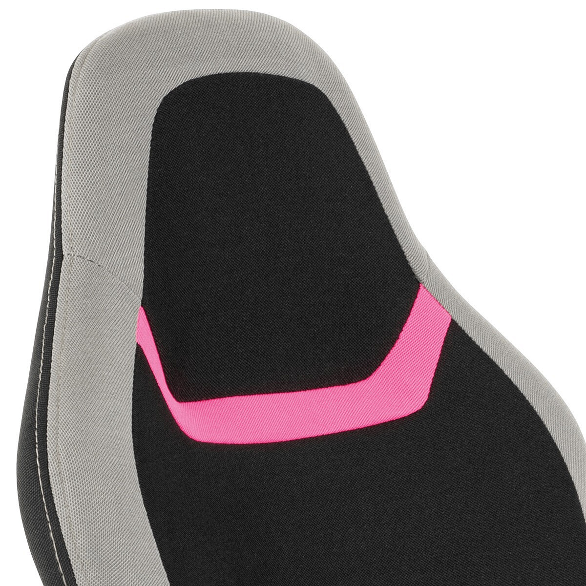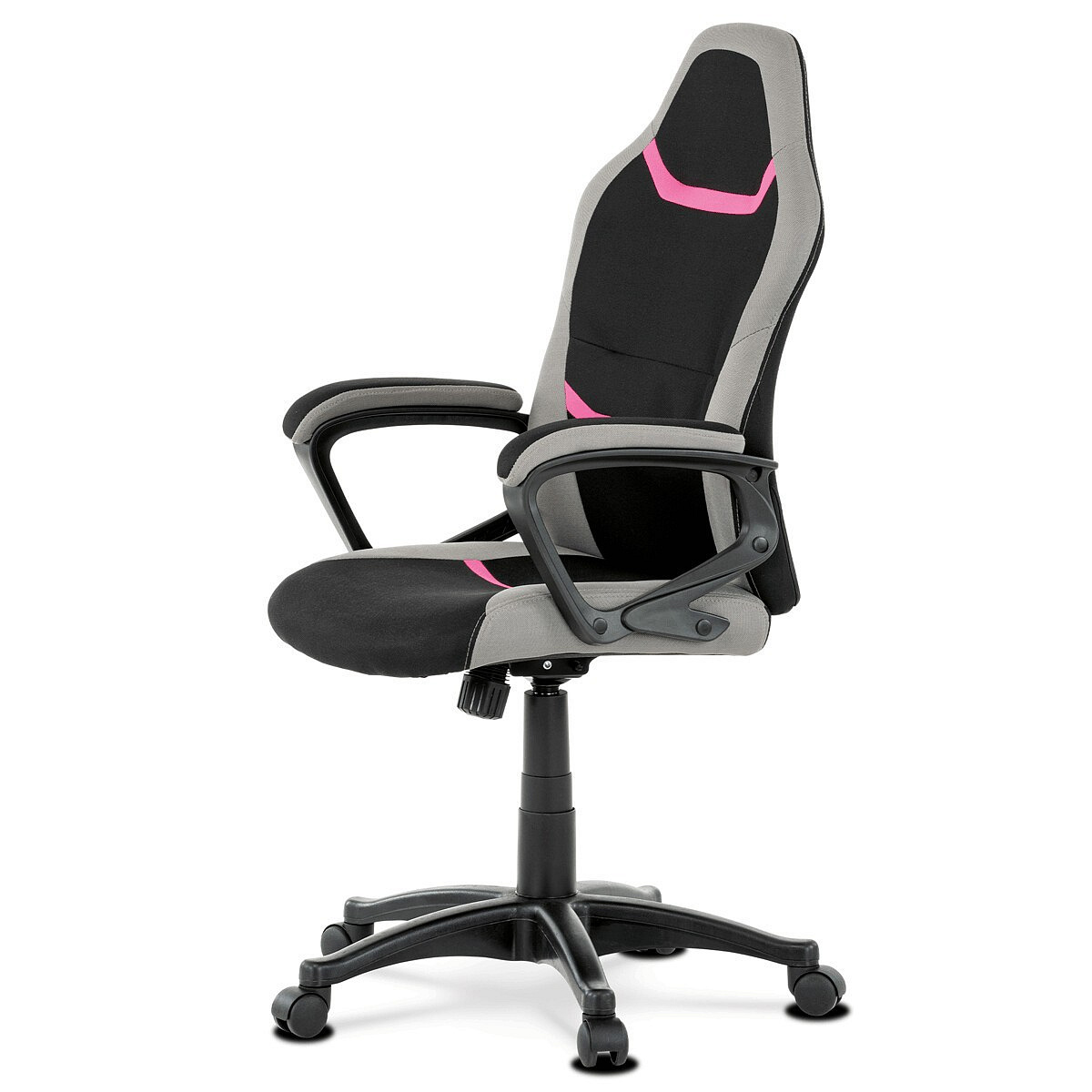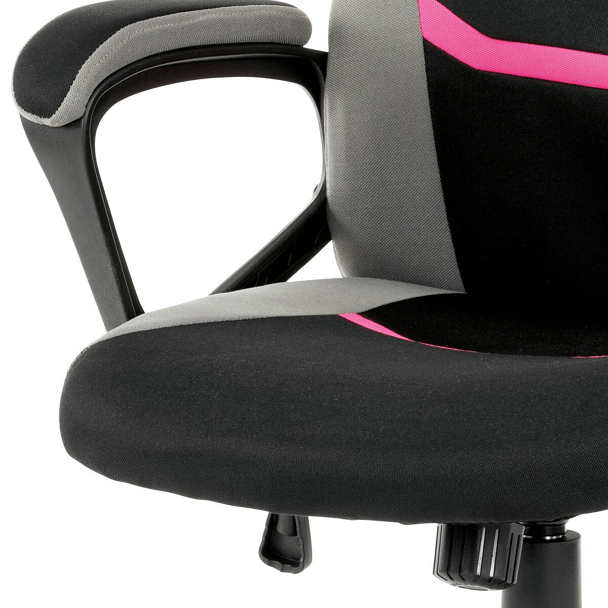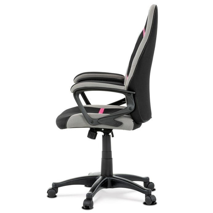 Elegantní kancelářská i herní židle se zaoblenými liniemi, obvodovým prošitím v šedé barvě a výrazným tvarovým prošitím sedáku i opěráku. Potah je kombinací černé a světle šedé látky hladké látky s decentním růžovým detailem na opěráku i sedáku. Polstrování je z kvalitní PU pěny. Židle je vybavena houpacím mechanismem s nastavením protiváhy a aretací v základní poloze. Tuhost protiváhy lze regulovat velkým plastovým šroubem, umístěným pod sedákem. Výška sezení se upravuje páčkou na pravé straně přes kvalitní plynový píst. Znavené ruce si velice pohodlně položíte na plastové područky, na ložné ploše polstrované černou a šedou látkou. Šíře područek je úžasných 7,5 cm, ložná plocha 31 cm a výška 3 cm. Opěrák je vyšší, částečně prodyšný a s integrovanou statickou opěrkou hlavy. Zvýšené okraje sedáku i opěráku podporují správné držení těla i páteře a slouží jako výborná opora. Kříž je černý plastový o průměru je 65 cm, což zajišťuje výbornou stabilitu i u fyzicky náročnějších her. Kolečka jsou plastová pr. 5 cm. Nosnost židle je až 120 kg.