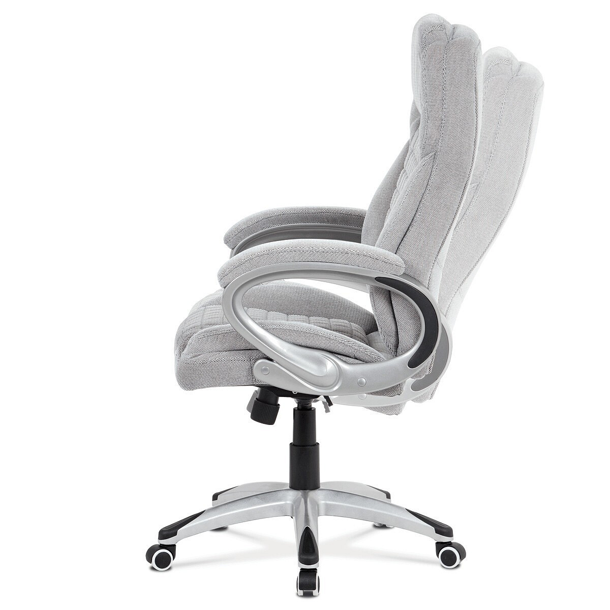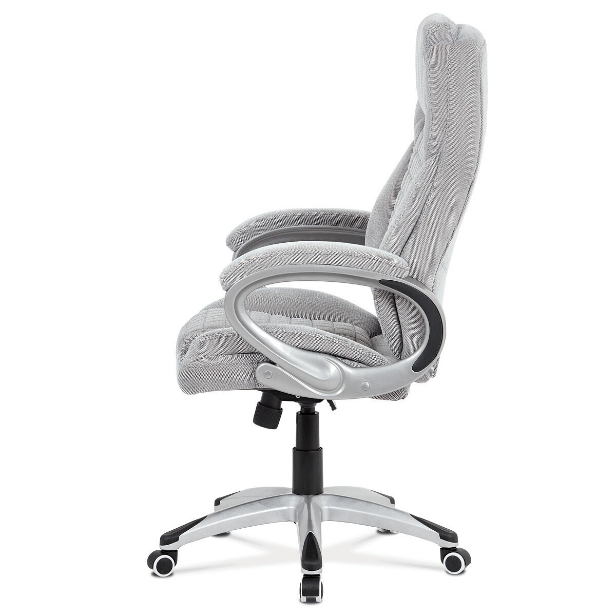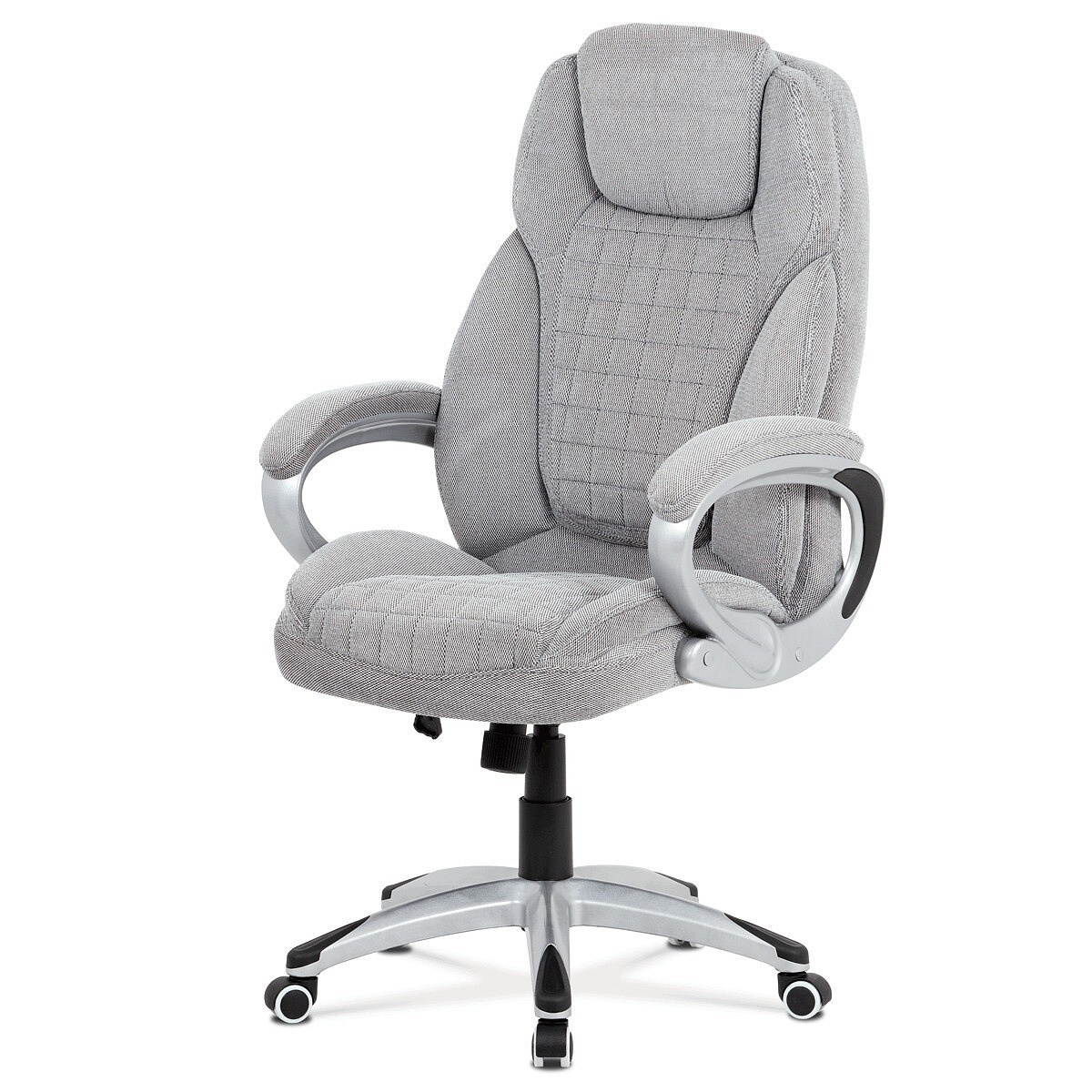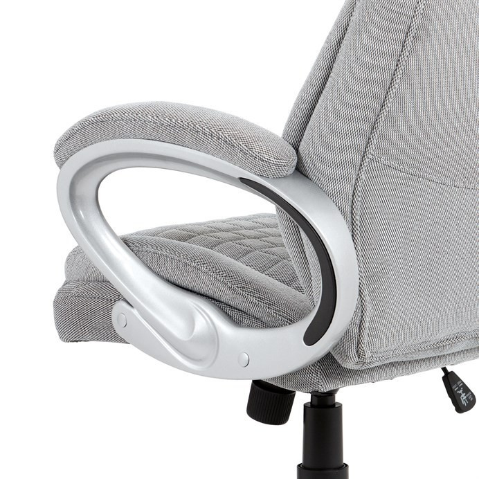 Kancelářská židle v šedé látce nabízí komfortní sezení díky houpacímu mechanismu s možností výškového nastavení. Čalouněné pevné područky s vyměkčenou vrchní částí zajišťují pohodlí při delším používání. Sedák a opěradlo jsou zdobeny designovým prošitím, které zároveň přispívá k estetice židle. Plastový stříbrný kříž poskytuje stabilní základnu s kolečky pro snadnou mobilitu. Židle je vhodná pro kancelářské prostředí, kde je kladen důraz na komfort a funkčnost.