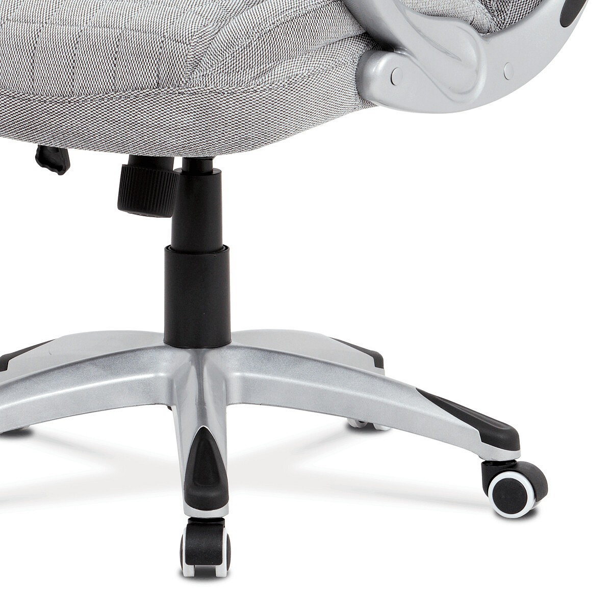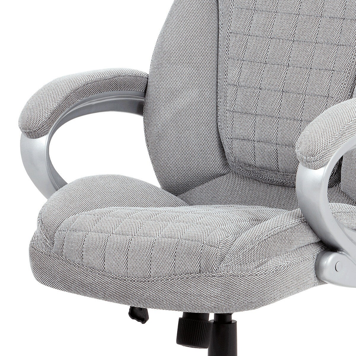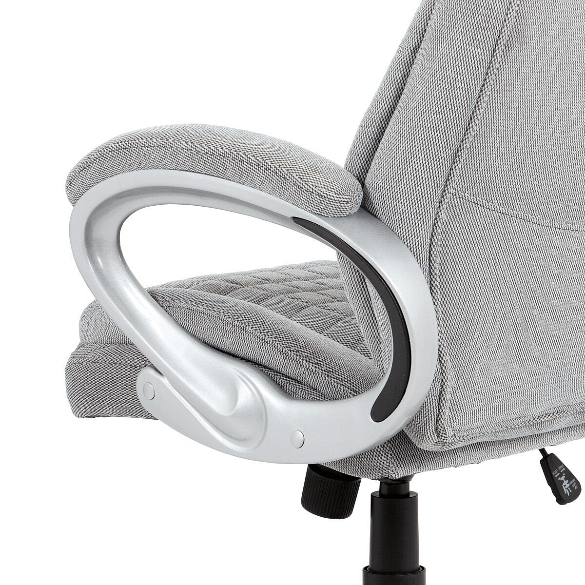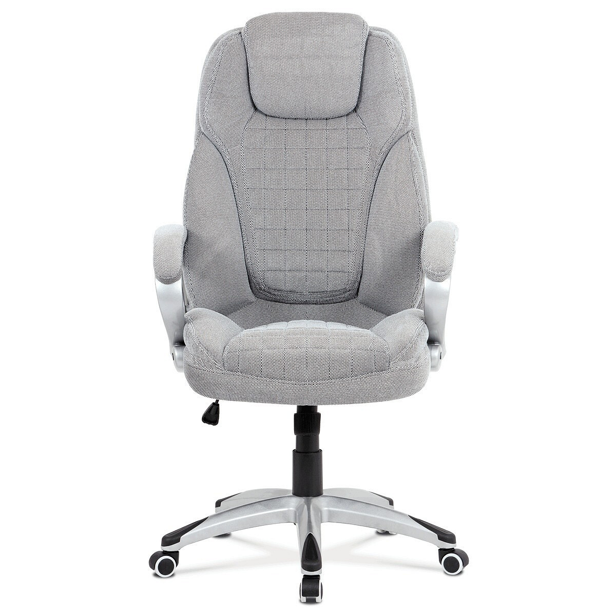 Kancelářská židle v šedé látce nabízí komfortní sezení díky houpacímu mechanismu s možností výškového nastavení. Čalouněné pevné područky s vyměkčenou vrchní částí zajišťují pohodlí při delším používání. Sedák a opěradlo jsou zdobeny designovým prošitím, které zároveň přispívá k estetice židle. Plastový stříbrný kříž poskytuje stabilní základnu s kolečky pro snadnou mobilitu. Židle je vhodná pro kancelářské prostředí, kde je kladen důraz na komfort a funkčnost.