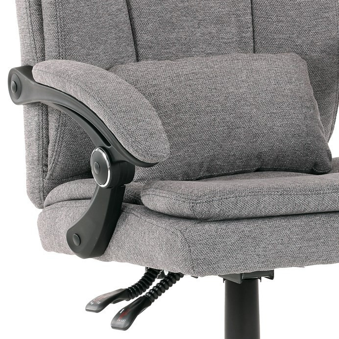 Kancelářské křeslo s šedým látkovým potahem nabízí komfortní sezení díky permanent contact mechanismu s aretací, který umožňuje plynulé nastavení úhlu opěradla a jeho zajištění v požadované poloze. Pevné čalouněné područky doplňují ergonomický design, který podporuje správné držení těla během práce. Sedák i opěradlo jsou vyplněny měkkou pěnou pro příjemný pocit při dlouhodobém sezení. Plastový kříž zajišťuje stabilitu a lehkost celé konstrukce, zatímco kolečka umožňují snadnou mobilitu. Výškově nastavitelná sedací plocha umožňuje přizpůsobení individuálním potřebám uživatele.