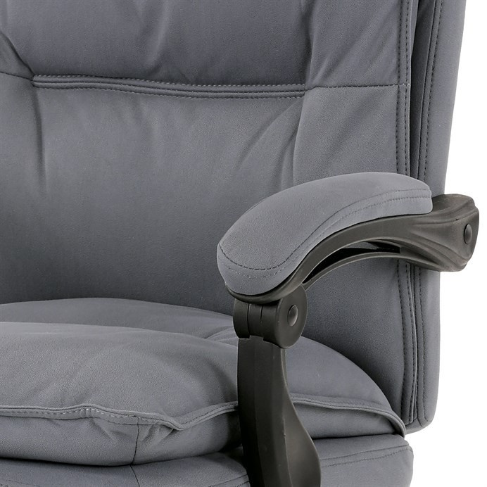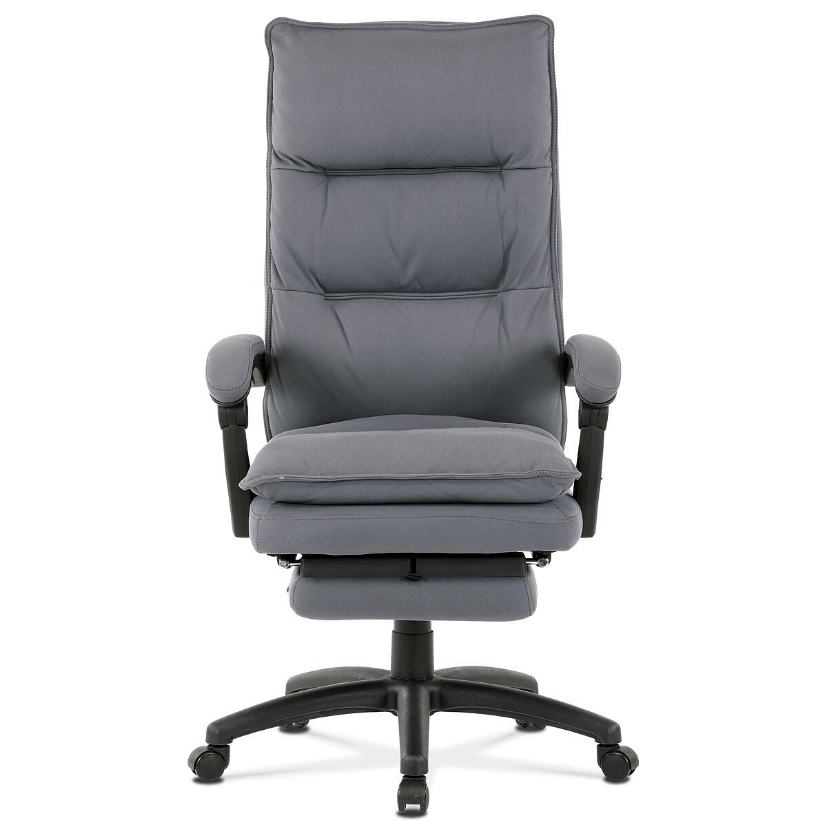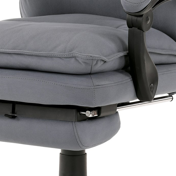 Luxusní kancelářské křeslo z kolekce TOP manager. Jedná se o moderní designové křeslo, navržené pro náročnou kancelářskou práci nebo jen relaxační lenošení. Jemný šedý odstín potahové látky doplní jakýkoli interiér, takže je univerzálním doplňkem do každé kanceláře. Výplň dvojitého sedáku i vysokého opěráku je z velmi kvalitní PU pěny. Křeslo je vybaveno houpacím mechanismem s plynulou aretací. Při vypnutí aretace je možné s opěradlem volně pohupovat. Područky jsou plastové, z vrchní části polstrované. Jedinečnost područek spočívá v synchronní mechanice, která upravuje jejich polohu při polohování opěráku. Vaše ruce budou mít při odpočinku dokonalou a velmi měkkou podporu. Jako TOP vybavení slouží výsuvná a výklopná polstrovaná podnožka. Nosnost židle je až 130 kg. Černá kostra područek a podnoží jí dodává nádech elegance a zajišťuje, že v každém prostředí vynikne jako výrazný kousek.