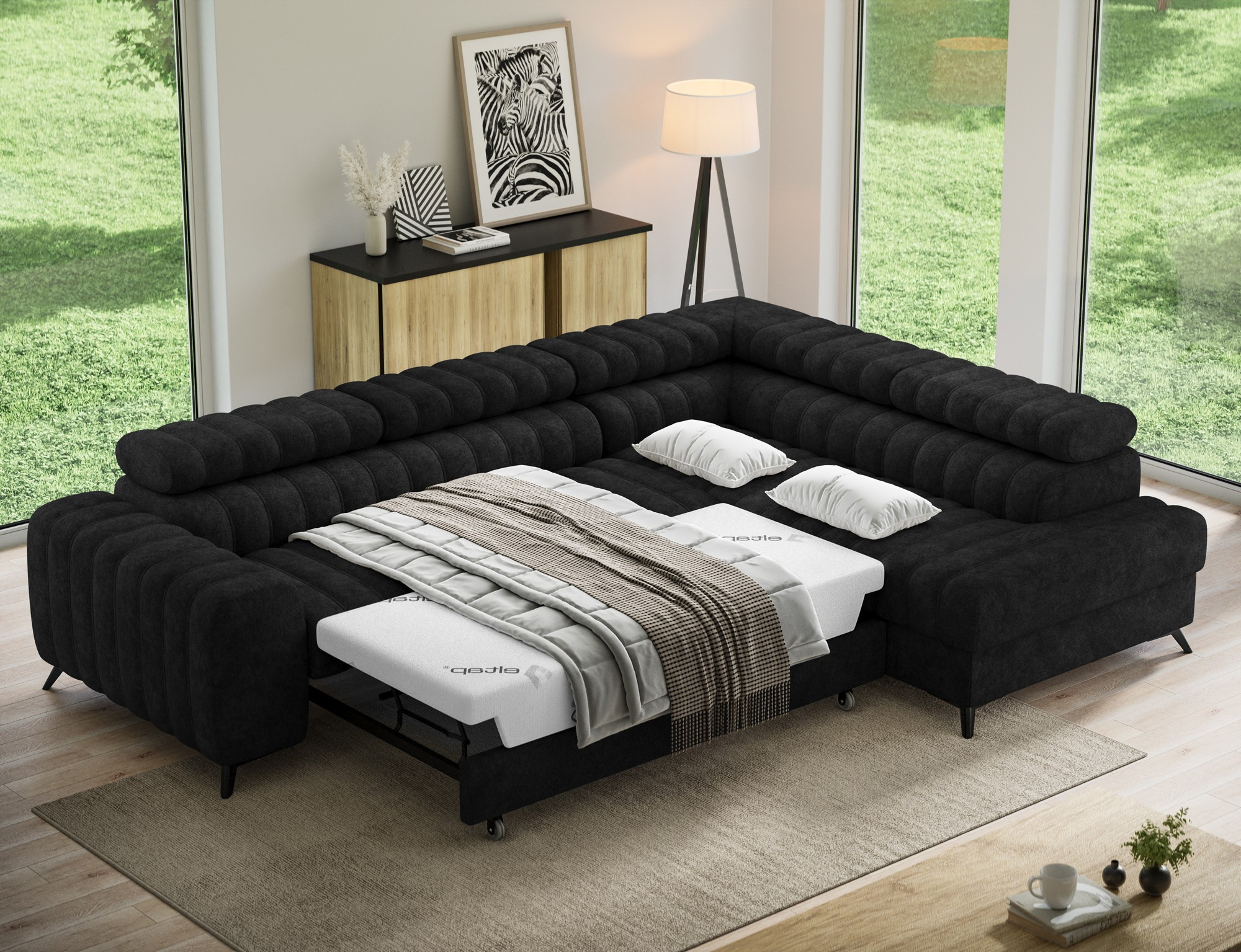 - Úložný prostor: Souprava je vybavena praktickým úložným prostorem, který vám umožní snadno uschovat deky, polštáře nebo jiné předměty, které chcete mít po ruce, ale zároveň je mít úhledně uklizené.