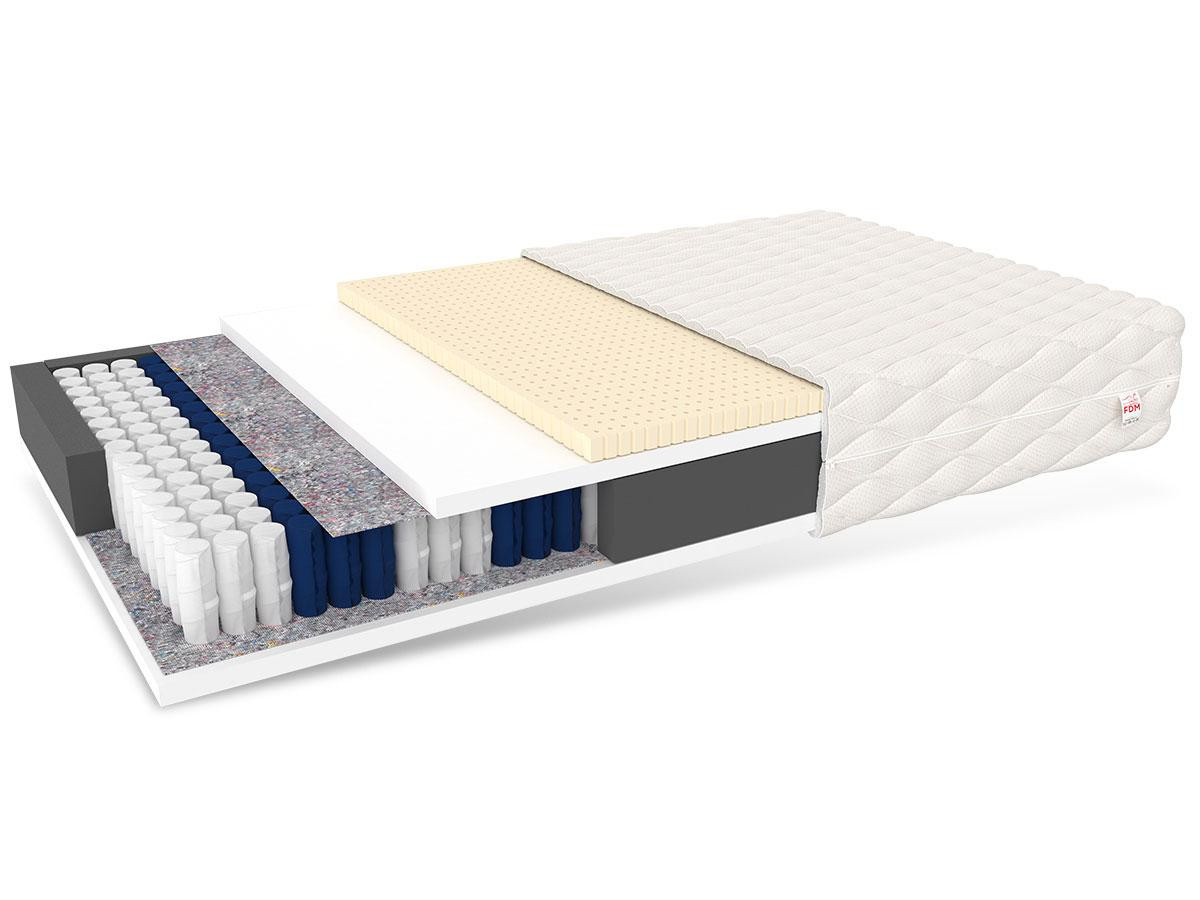 Model BOLONIA používá kapesní formát. Kapesní pružiny jsou vyrobeny technologií NanoHARD, jejíž drát tvrzený pod vodou výrazně prodlužuje jejich životnost. Díky použití 7 zón s různou tvrdostí poskytuje matrace ergonomickou polohu těla při odpočinku. Nezávislá práce pružin eliminuje vliv ohýbání velké plochy matrace při tlaku na její malou plochu. Tímto způsobem druhá osoba nepocítí žádné otáčení nebo vrtání. Vložka kapsy je obklopena polyuretanovou pěnou T25, která je odolná proti deformaci. Byla také použita latexová vložka, která zajišťuje vhodnou cirkulaci vzduchu. To zabraňuje nadměrnému pocení během spánku. Specifikace: tvrdost: H3 středně tvrdá, tloušťka: 19 cm. Složení: perforovaný latex: 2 cm, polyuretanová pěna T25: 2 cm, potah: 1 cm, výška pružiny: 12 cm, polyuretanová pěna T25: 2 cm.