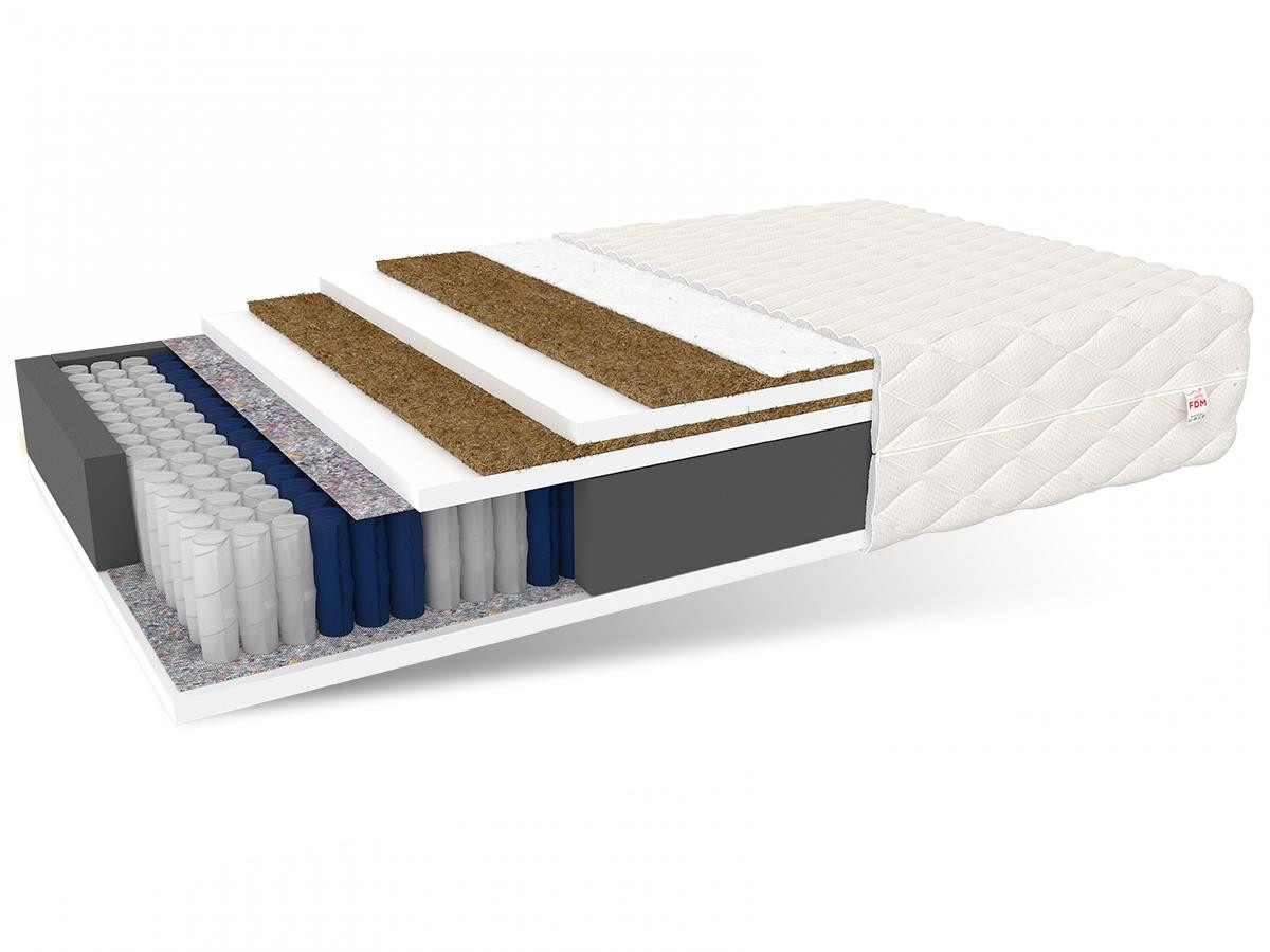Matrace FAMILY MAX DOUBLE je ideálním řešením pro jednu nebo dvě osoby. Jádro matrace tvoří taštičkové jádro. Kapesní pružiny jsou vyrobeny technologií NanoHARD, jejíž drát tvrzený pod vodou výrazně prodlužuje jejich životnost. Díky použití 7 zón s různou tvrdostí poskytuje matrace ergonomickou polohu těla při odpočinku. Nezávislá práce pružin eliminuje vliv ohýbání velké plochy matrace při tlaku na její malou plochu. Tímto způsobem druhá osoba nepocítí žádné otáčení nebo vrtání. Vložka kapsy je obklopena polyuretanovou pěnou T25, která je odolná proti deformaci. Vrstva kokosu dodává matraci tuhost. Kokosová vlákna jsou lehká a vzdušná a zároveň velmi trvanlivá a pružná, odolná vůči vlhkosti a deformaci. Mají také řadu antialergických vlastností. Specifikace: tvrdost: H3 středně tvrdá; H5 velmi tvrdá, tloušťka: 26 cm. Složení: kokosová vložka: 1 cm, klimatizační vlákno: 1 ks., Polyuretanová pěna T25: 2 cm, Potah: 1 cm, Výška pružiny: 18 cm, Polyuretanová pěna T25: 2 cm, Vložka z kokosového vlákna: 1 cm.