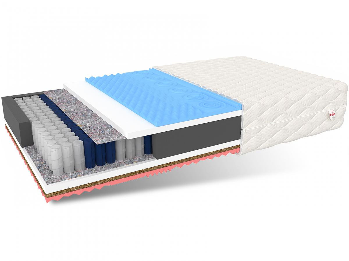 Základem matrace GINASO je kapsový formát. Kapesní pružiny jsou vyrobeny technologií NanoHARD, jejíž drát tvrzený pod vodou výrazně prodlužuje jejich životnost. Díky použití 7 zón s různou tvrdostí poskytuje matrace ergonomickou polohu těla při odpočinku. Nezávislá práce pružin eliminuje vliv ohýbání velké plochy matrace při tlaku na její malou plochu. Tímto způsobem druhá osoba nepocítí žádné otáčení nebo vrtání. Vložka kapsy je obklopena polyuretanovou pěnou T25, která je odolná proti deformaci. Vynikající ventilaci zajišťuje tvarovaná HR pěna s vysokou odolností. Matrace je tvořena miliony bublinek, které zajišťují, že se dokonale přizpůsobí anatomickému tvaru těla a zaručují pohodlí při spánku. Vložka z kokosového vlákna zabraňuje růstu plísní, roztočů a hub. Díky tomu je matrace také stabilnější. Vložka z termoplastické pěny VISCO se vlivem tepla a tlaku přizpůsobuje tvaru těla. Specifikace: tvrdost: H4 hard; H3 medium hard, tloušťka: 22 cm. Složení: kokosová vložka: 1 cm, profilovaná pěna N25: 2 cm, polyuretanová pěna T25: 2 cm, potah: 1 cm, výška pružiny: 12 cm, polyuretanová pěna T25: 2 cm, profilovaná pěna V40: 2 cm.