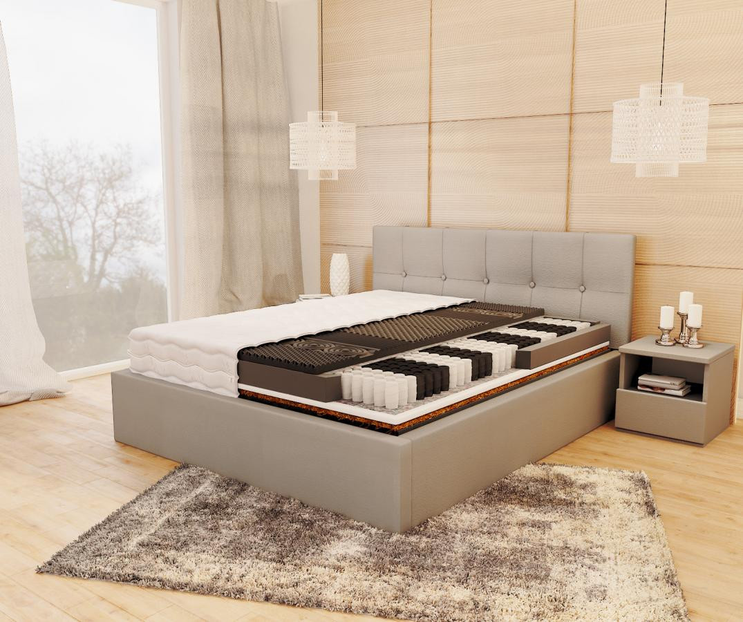 Základem matrace GINASO je kapsový formát. Kapesní pružiny jsou vyrobeny technologií NanoHARD, jejíž drát tvrzený pod vodou výrazně prodlužuje jejich životnost. Díky použití 7 zón s různou tvrdostí poskytuje matrace ergonomickou polohu těla při odpočinku. Nezávislá práce pružin eliminuje vliv ohýbání velké plochy matrace při tlaku na její malou plochu. Tímto způsobem druhá osoba nepocítí žádné otáčení nebo vrtání. Vložka kapsy je obklopena polyuretanovou pěnou T25, která je odolná proti deformaci. Vynikající ventilaci zajišťuje tvarovaná HR pěna s vysokou odolností. Matrace je tvořena miliony bublinek, které zajišťují, že se dokonale přizpůsobí anatomickému tvaru těla a zaručují pohodlí při spánku. Vložka z kokosového vlákna zabraňuje růstu plísní, roztočů a hub. Díky tomu je matrace také stabilnější. Vložka z termoplastické pěny VISCO se vlivem tepla a tlaku přizpůsobuje tvaru těla. Specifikace: tvrdost: H4 hard; H3 medium hard, tloušťka: 22 cm. Složení: kokosová vložka: 1 cm, profilovaná pěna N25: 2 cm, polyuretanová pěna T25: 2 cm, potah: 1 cm, výška pružiny: 12 cm, polyuretanová pěna T25: 2 cm, profilovaná pěna V40: 2 cm.