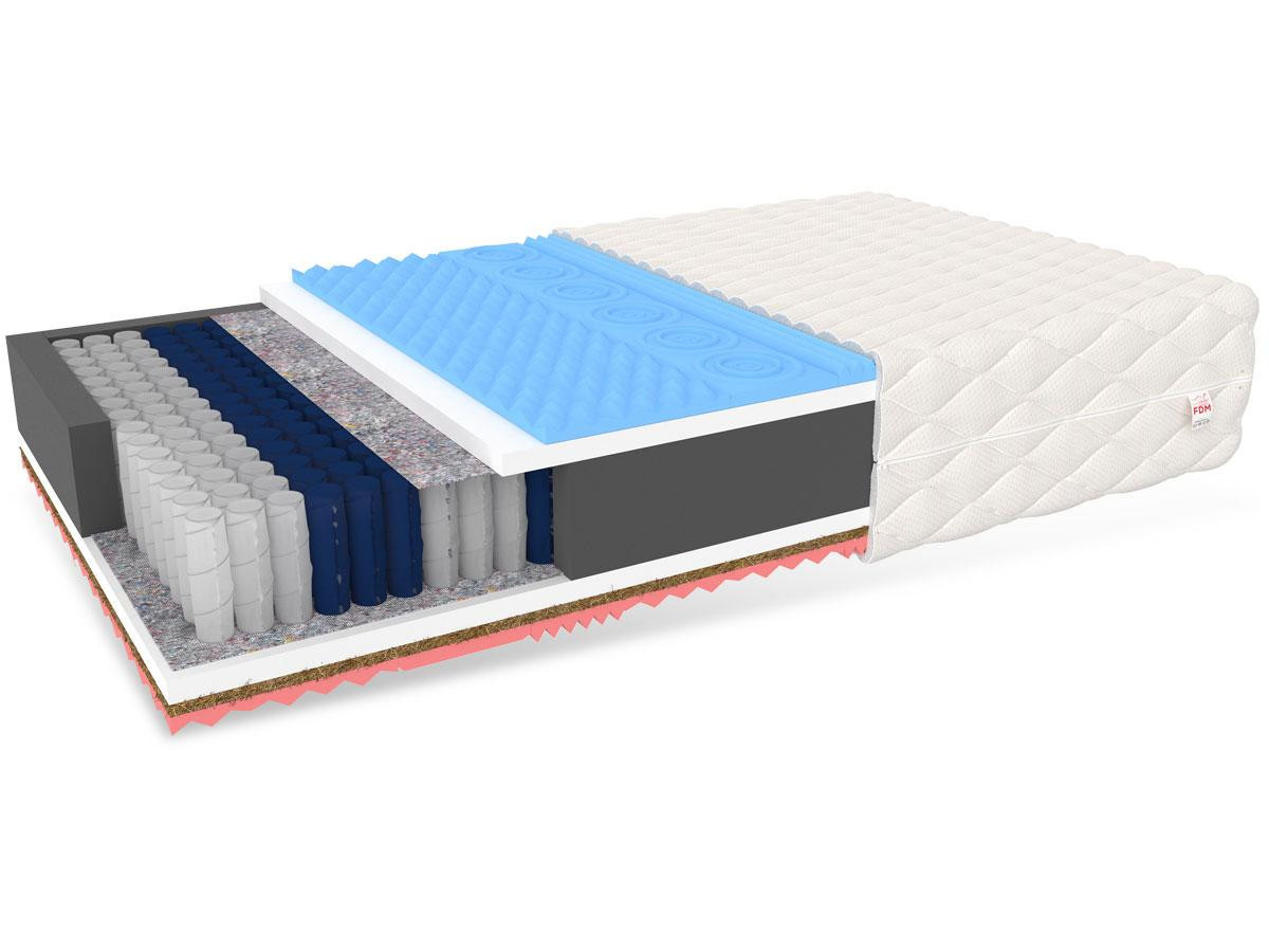 Základem matrace GINASO MAX je kapsový formát. Kapesní pružiny jsou vyrobeny technologií NanoHARD, jejíž drát tvrzený pod vodou výrazně prodlužuje jejich životnost. Díky použití 7 zón s různou tvrdostí poskytuje matrace ergonomickou polohu těla při odpočinku. Nezávislá práce pružin eliminuje vliv ohýbání velké plochy matrace při tlaku na její malou plochu. Tímto způsobem druhá osoba nepocítí žádné otáčení nebo vrtání. Vložka kapsy je obklopena polyuretanovou pěnou T25, která je odolná proti deformaci. Vynikající ventilaci zajišťuje tvarovaná HR pěna s vysokou odolností. Matrace je tvořena miliony bublinek, které zajišťují, že se dokonale přizpůsobí anatomickému tvaru těla a zaručují pohodlí při spánku. Vložka z kokosového vlákna zabraňuje růstu plísní, roztočů a hub. Díky tomu je matrace také stabilnější. Vložka z termoplastické pěny VISCO se vlivem tepla a tlaku přizpůsobuje tvaru těla. Specifikace: tvrdost: H2 středně měkká; H3 středně tvrdá, tloušťka: 28 cm. Složení: kokosová vložka: 1 cm, profilovaná pěna N25: 2 cm, polyuretanová pěna T25: 2 cm, potah: 1 cm, výška pružiny: 18 cm, polyuretanová pěna T25: 2 cm, profilovaná pěna V40: 2 cm.