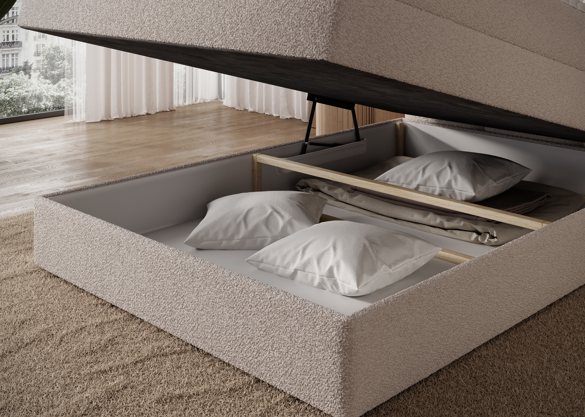 Kontinentální postel Kasped je moderní a funkční volbou pro každou ložnici, dostupná ve dvou velikostech: 215x121x108 cm a 215x141x108 cm, což umožňuje snadné přizpůsobení individuálním potřebám a rozměrům místnosti. Konstrukce postele je založena na pevném rámu vyrobeném z masivního dřeva a dřevotřísky, což zajišťuje dlouhotrvající stabilitu a odolnost. V srdci designu se nachází bonellová pružinová matrace, trvale připevněná k rámu, která poskytuje spolehlivou oporu těla a podporuje správnou cirkulaci vzduchu pro zdravý a ergonomický spánek. Navíc postel obsahuje dvě vrstvy vysoce kvalitní pěny – pěnu T2130 a pěnu T2540 – které v kombinaci s bonellovou pružinovou jednotkou zvyšují flexibilitu, pohodlí a přizpůsobení se konturám těla, což podporuje klidný a regenerační spánek. Celá struktura je definována čistými liniemi a moderní estetikou, doplněná černými nohami nábytku z odolného plastu, které přidávají vizuální lehkost a zároveň zajišťují konstrukční integritu. Vysoce praktickou funkcí je vestavěný úložný prostor na ložní prádlo, který poskytuje pohodlné místo pro uložení přikrývek, polštářů nebo jiných textilií, což pomáhá udržet ložnici čistou a uspořádanou. Postel Kasped kombinuje prvotřídní řemeslné zpracování, moderní design a každodenní funkčnost, což z ní činí ideální volbu jak pro moderní, tak i pro klasičtější interiérová uspořádání.
