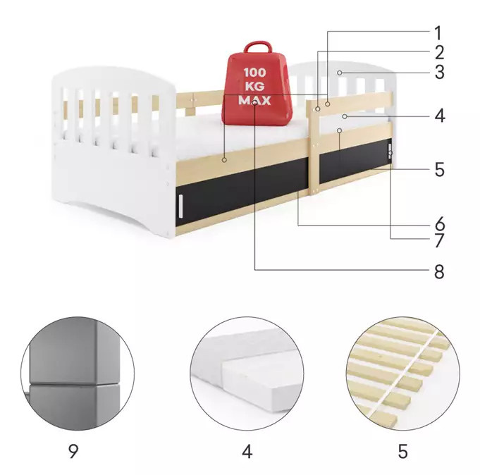 - Rám postele je vyrobený z borovicového dřeva a natřený vodním lakem