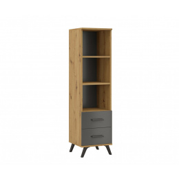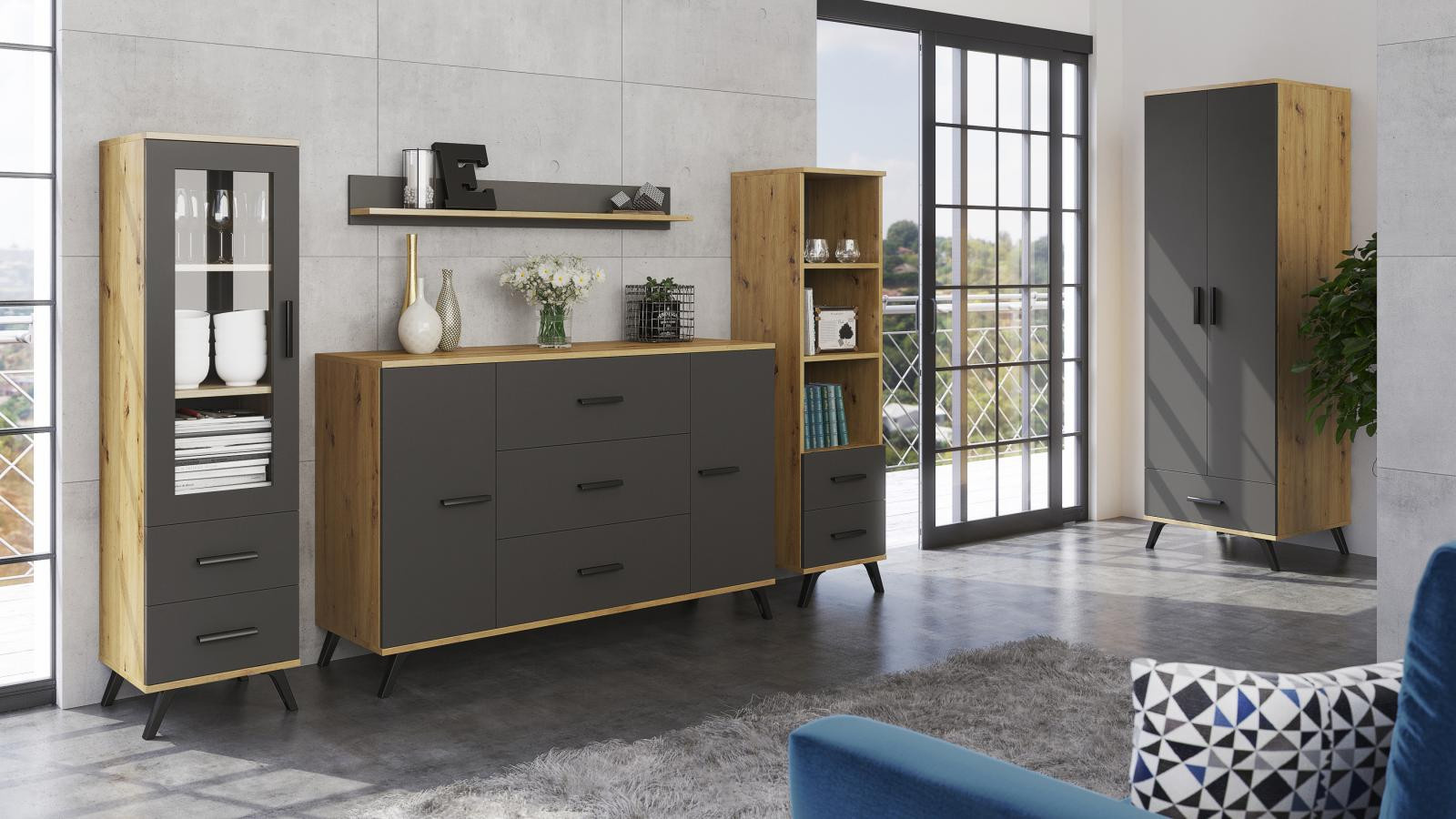 Knihovna vysoká Roky 7 Grafit je vyrobena z lamina v krásném dekoru grafit a dub artisan. Lamino tloušťky 18 mm je odolné a je zakončeno lištou ABS. Jistě oceníte i snadnou údržbu. Knihovna je velmi praktická, kombinace polic a šuplíků pojme vše potřebné. Rukojeti v dekóru dřeva jsou vyrobeny z plastu. Je dodávána v demontu. Součástí balení je montážní návod včetně všech spojovacích prvků.