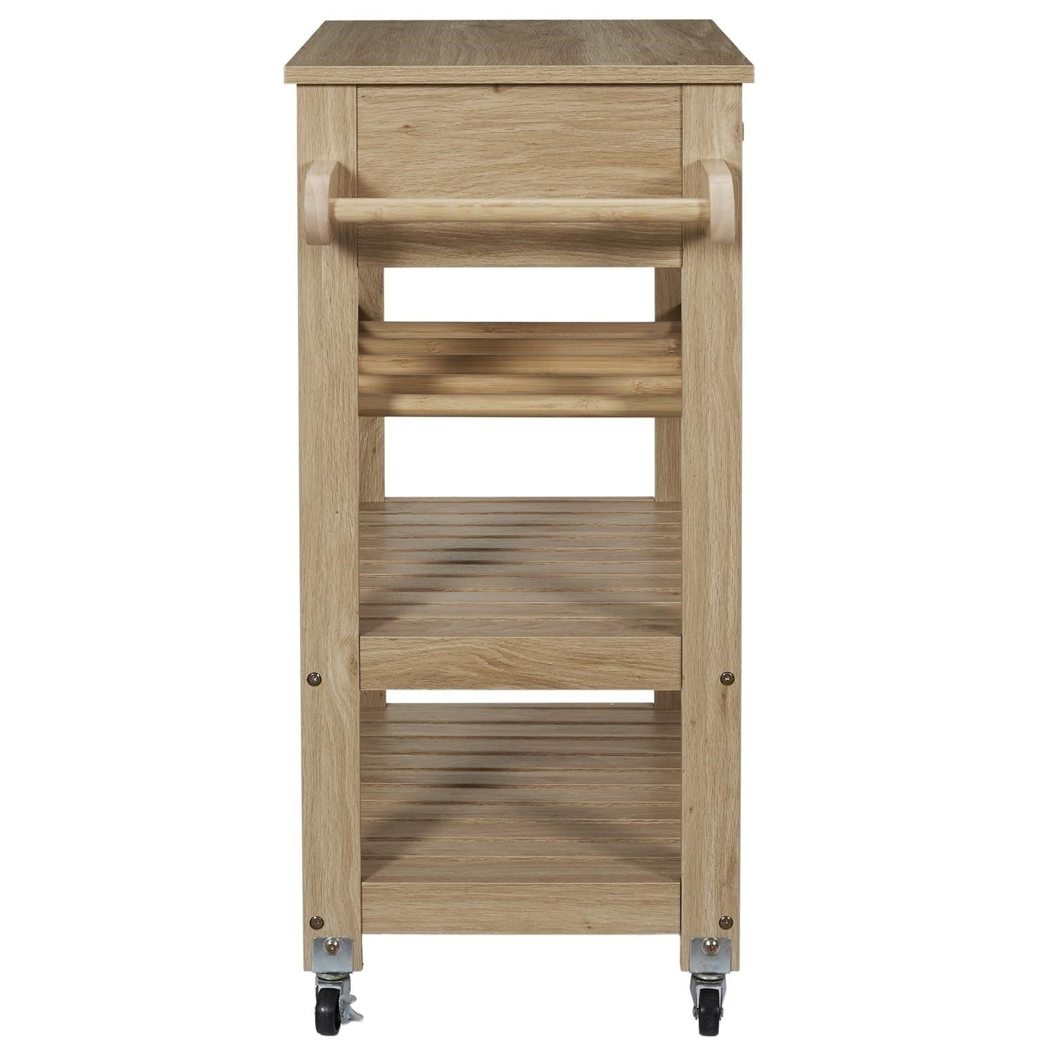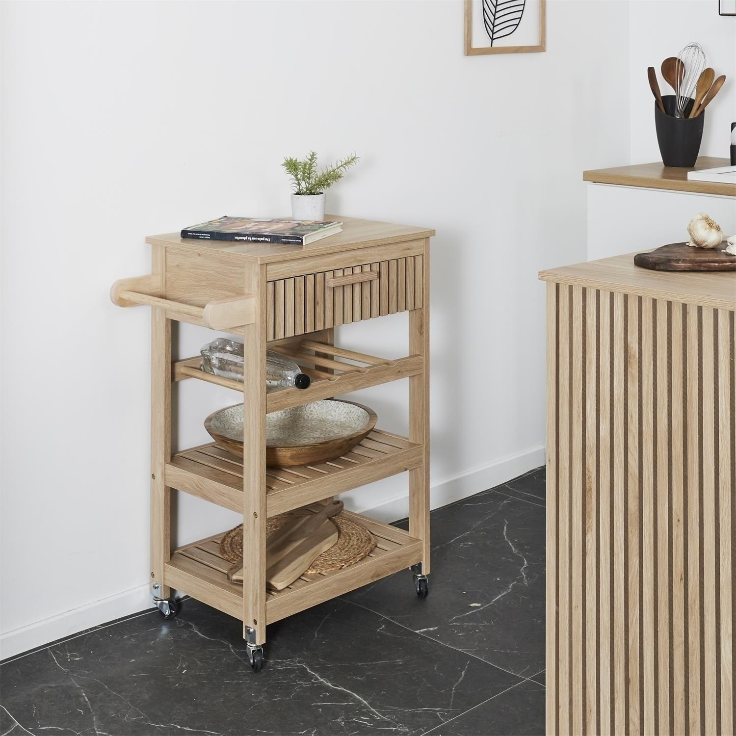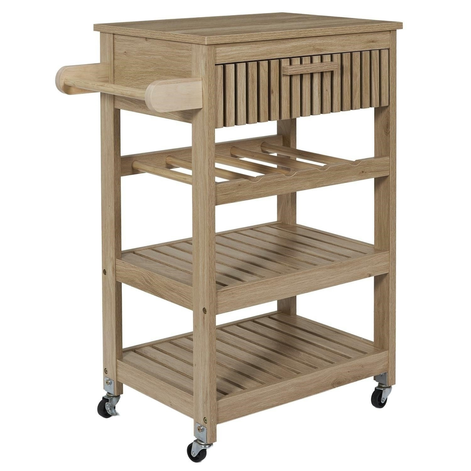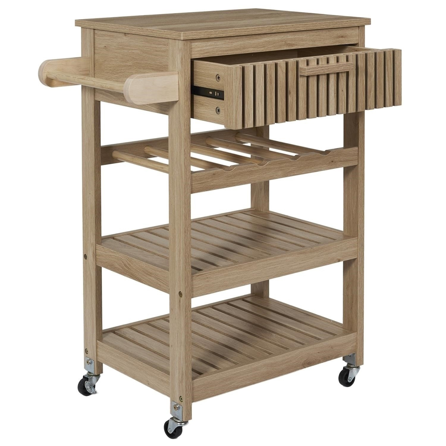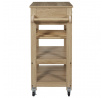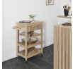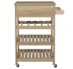Servírovací vozík Klaus je ideálním přítelem každé pořádné hospodyně. Vozík může být užitečný při přenášení jídel z kuchyně do jídelny nebo může sloužit jako dodatečná pracovní plocha a úložný prostor. Vozík byl vybaven policí na lahve vína a dvěma policemi na libovolné předměty. Dodatečně byla pod deskou skryta zásuvka s čelním panelem v lamelách. Vozík bude snadné přesouvat, držíc za rukojeť, která byla připevněna na boční stěně vozíku. Čtyři kolečka z plastu zaručují snadné posouvání vozíku a otáčení do každé strany. Kočárek vyžaduje montáž. Hmotnost kočárku 15,3 kg. Max. zatížení vozíku 25 kg Materiál: MDF deska, dřevotříska, plast (kolečka)