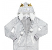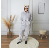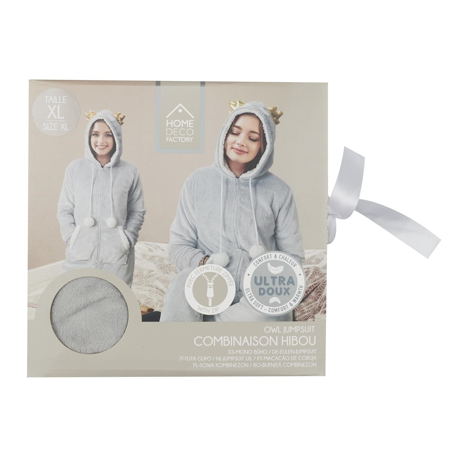 Kombinéza Onesie Sova je plyšová kombinéza s kapucí, ideální na zimní večery nebo relaxaci doma. Je vyroben z měkkého, šedého materiálu, který zajišťuje teplo a pohodlí. Kombinéza má dlouhé rukávy a nohavice, a také praktický zip po celé délce, což usnadňuje oblékání. Kapuce zdobí zábavné, roztomilé detaily: vyšitý obličej a zlaté uši, které připomínají korunu, dodávají kombinéze jedinečný, fantazijní charakter. Dvě bambulky visící z kapuce dodávají další kouzlo. Produkt má také dvě kapsy s měkkou kožešinou, které jsou ideální pro zahřátí rukou nebo uložení drobných předmětů. Délka produktu (cm): 55 Výška produktu (cm): 150 Hmotnost produktu (g): 640 Materiál: Polyester