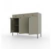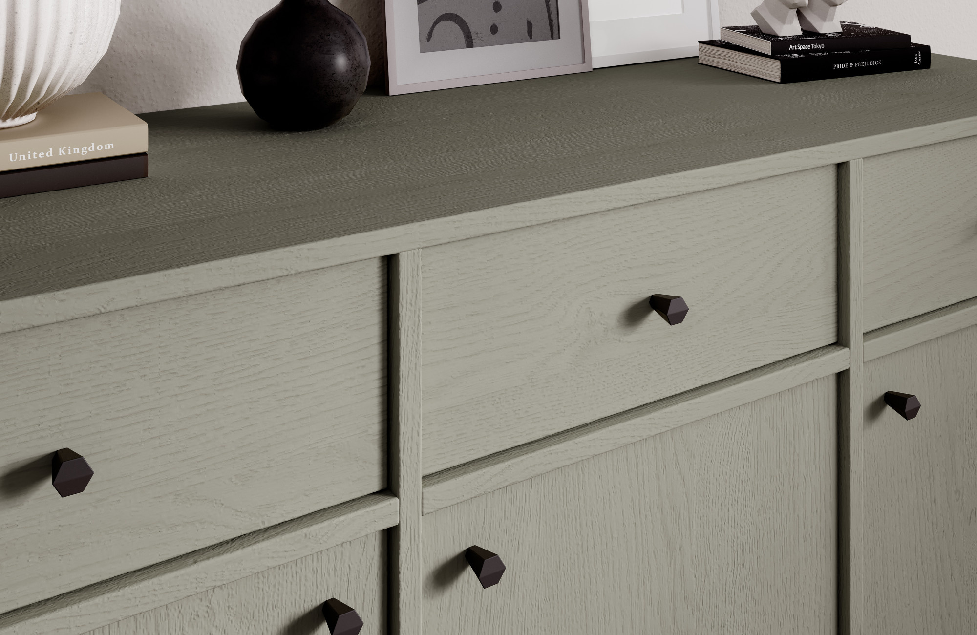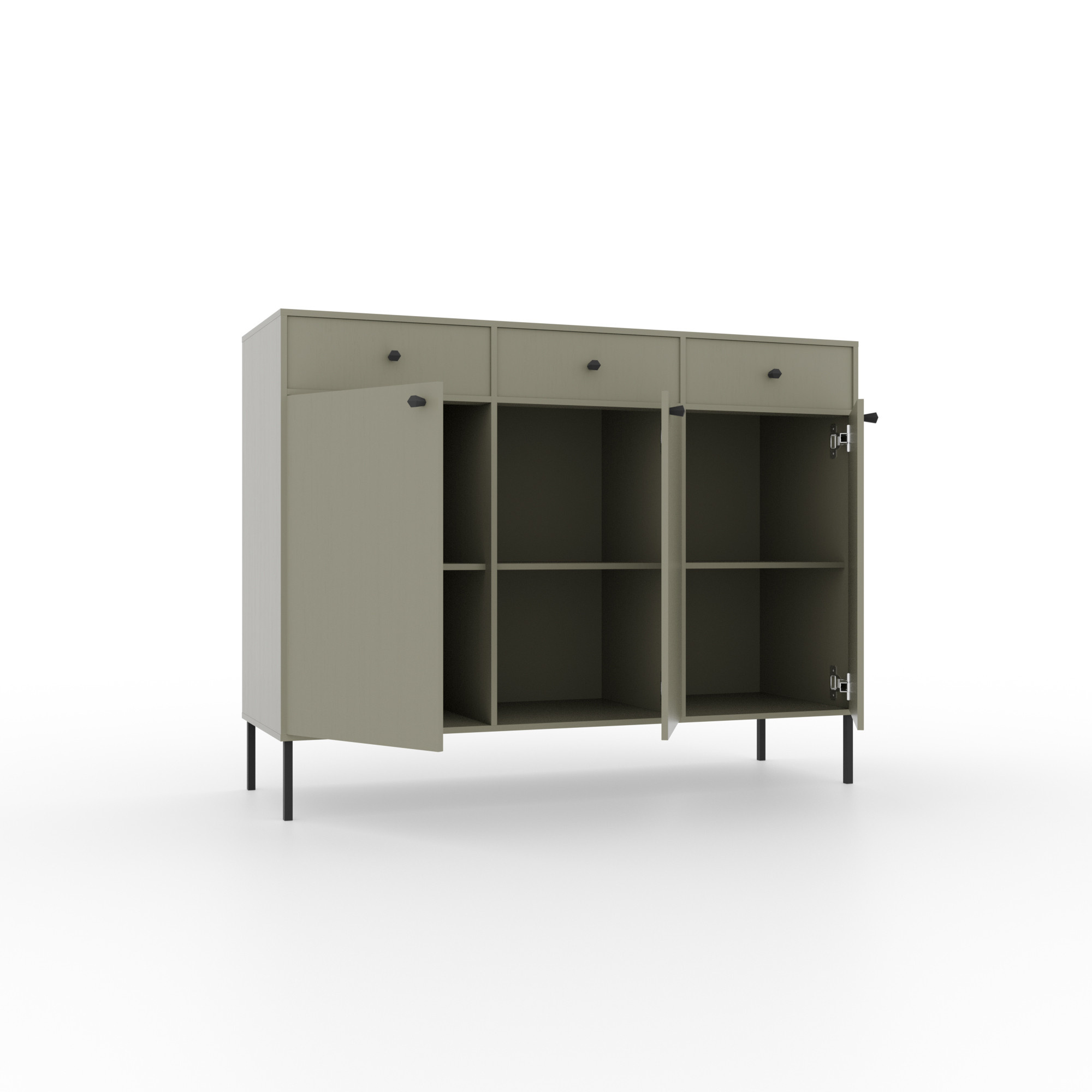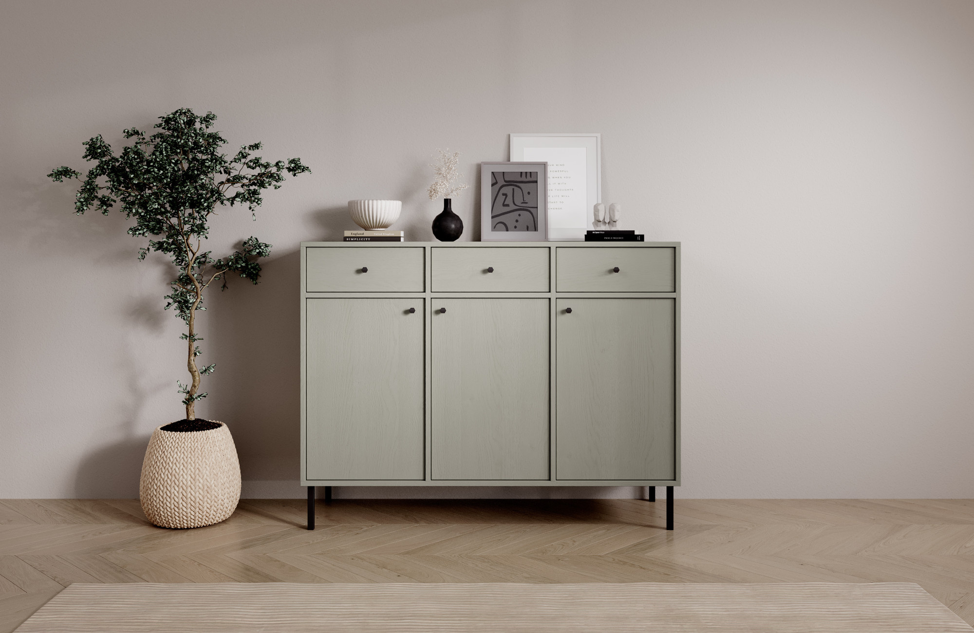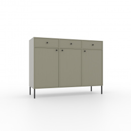 Komoda System Tili je moderní nábytek, který se díky své promyšlené barevnosti a elegantnímu designu dokonale hodí do různorodých interiérů. Dostupná ve třech barevných variantách: **černá**, **písková béžová** a **eukalyptus**, komoda představuje harmonické spojení funkčnosti a estetiky.Každá barevná varianta byla pečlivě navržena, aby zdůraznila jedinečný charakter interiéru. **Černá** dodává komodě sofistikovaný, moderní vzhled, ideální pro minimalistické a elegantní prostory. **Písečná béžová** přináší teplo a jemnost, dokonale se hodí k světlým, přírodním prvkům interiéru. Zatímco **eukalyptus** je odstín inspirovaný přírodou, který přináší do interiéru svěžest a lehkost, ideální pro moderní i více klasické aranžmá.